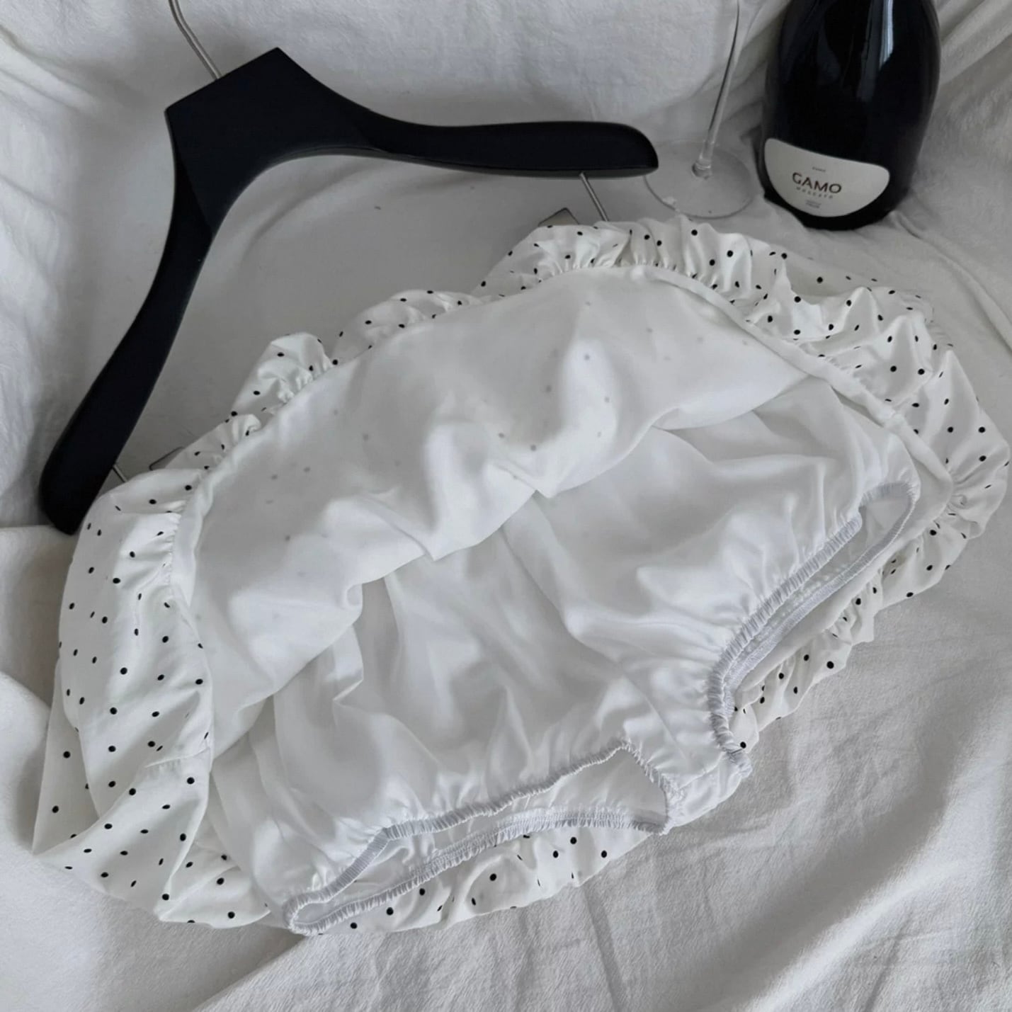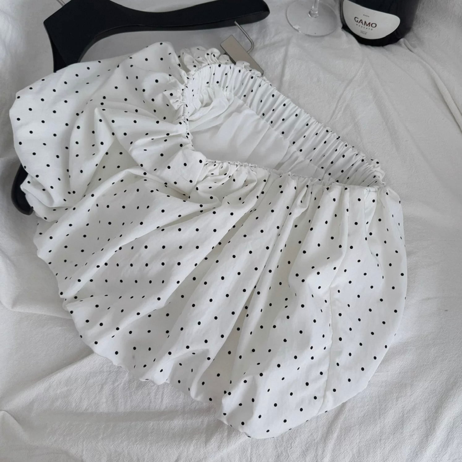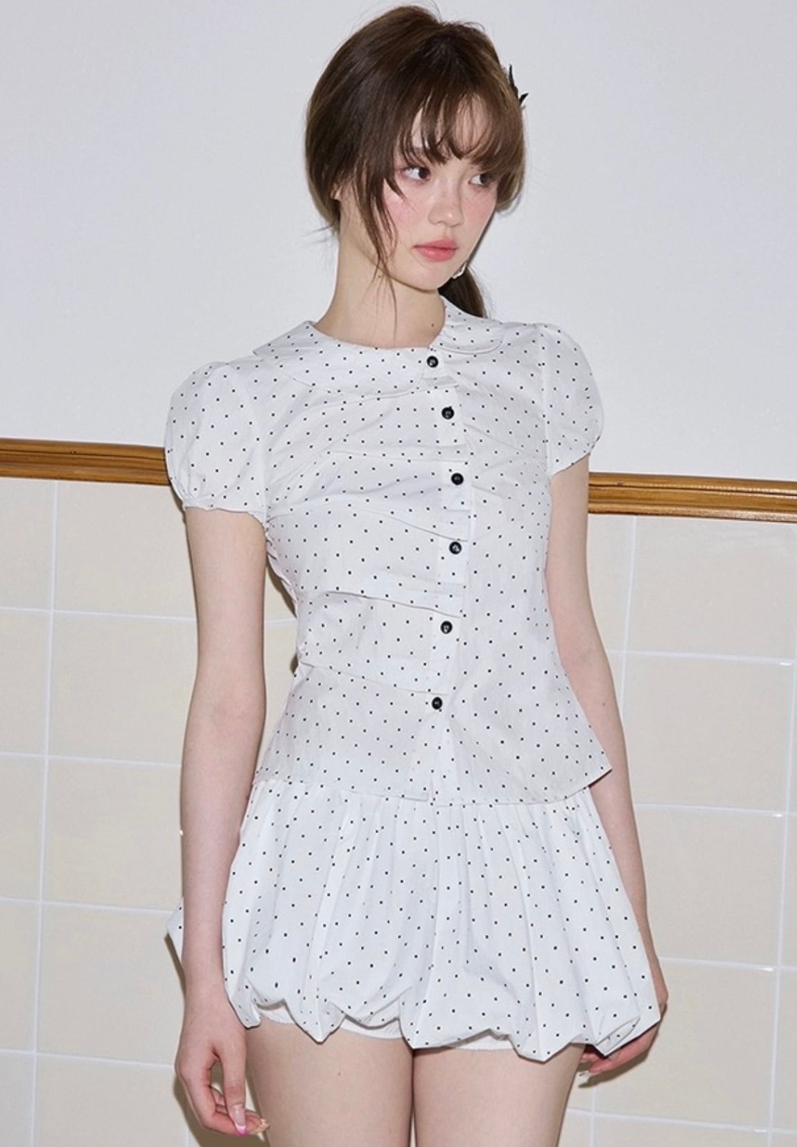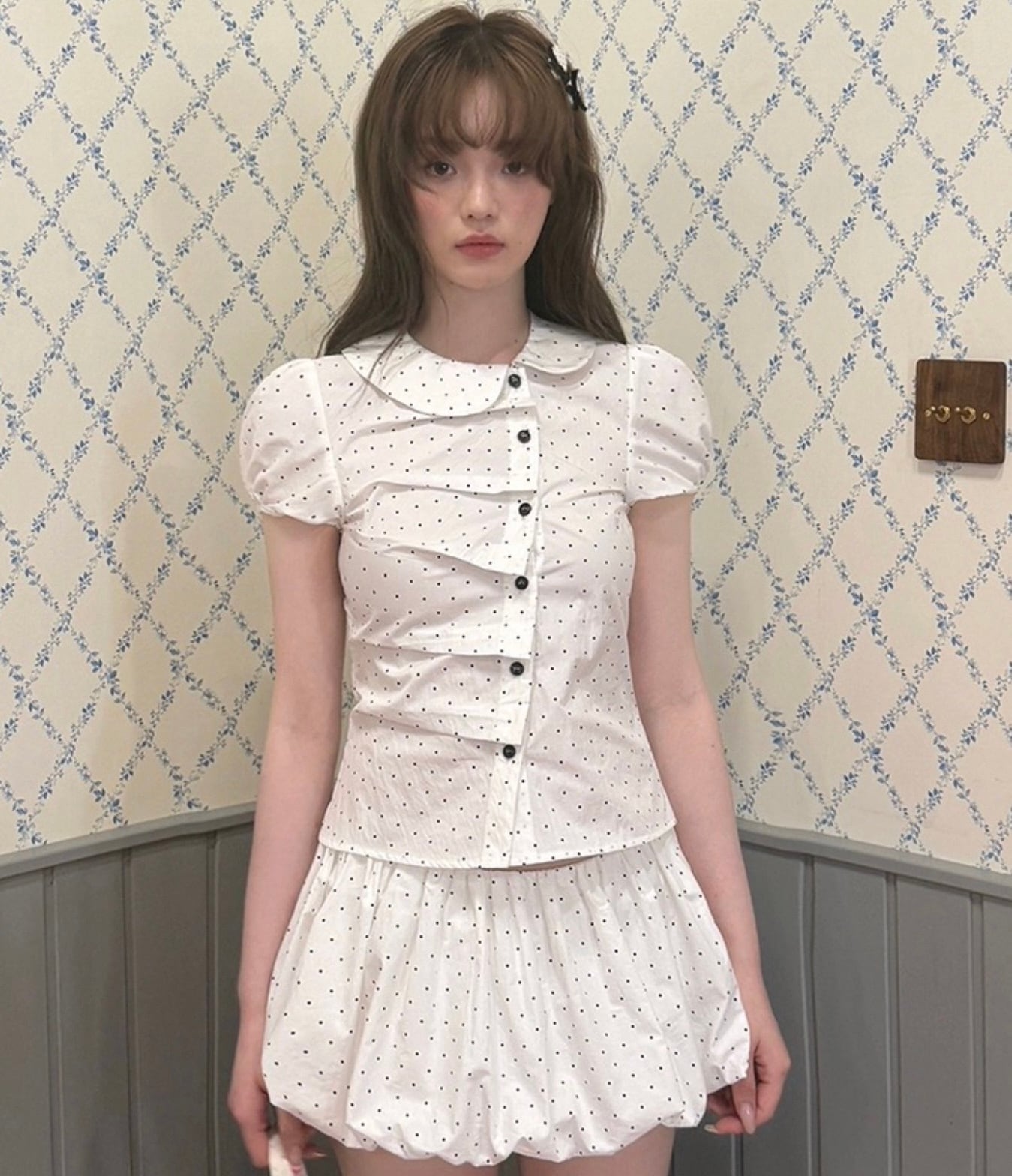【set】プリーツデザインドット柄半袖ブラウス×インパン付きフリルスカート HK0356