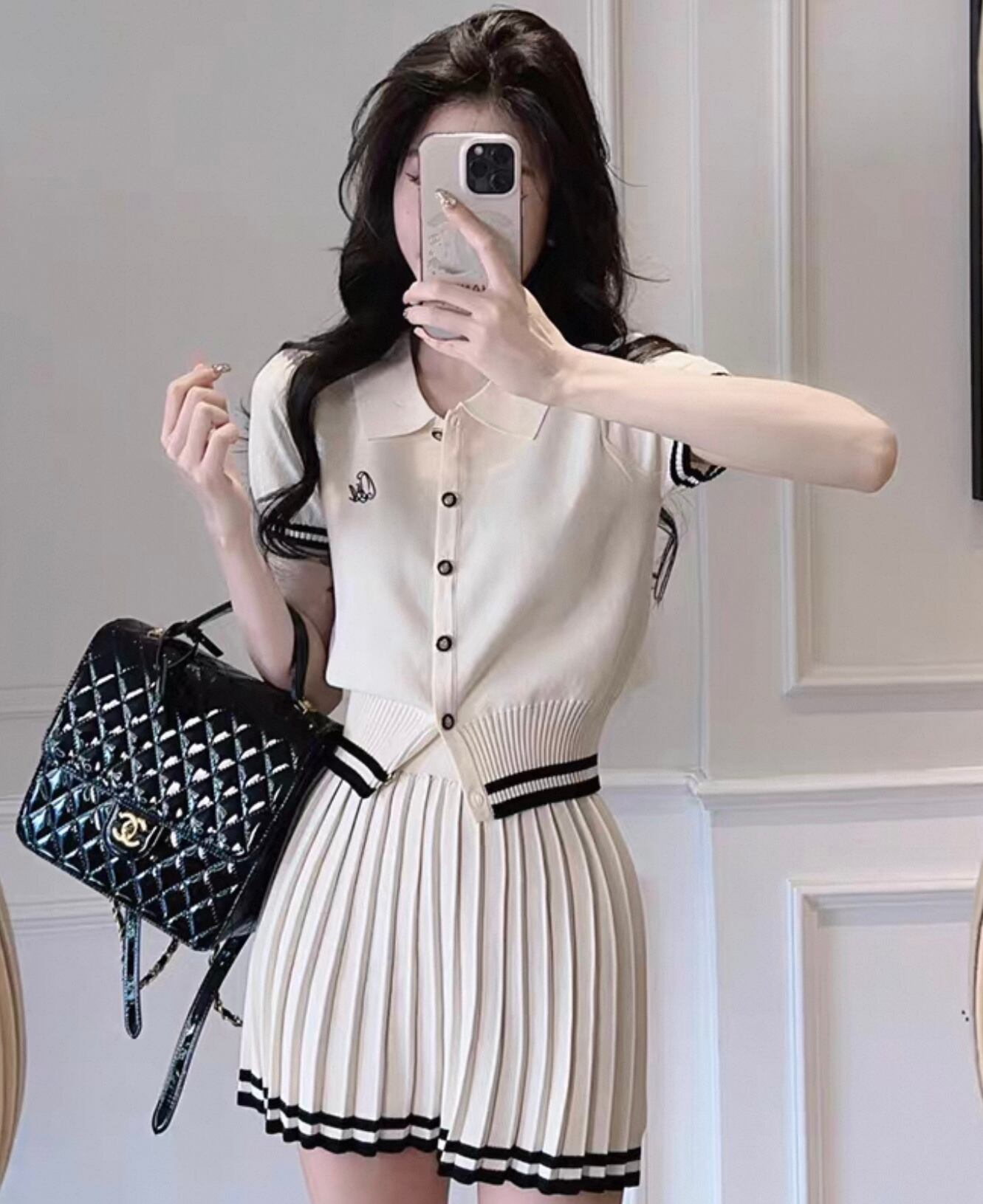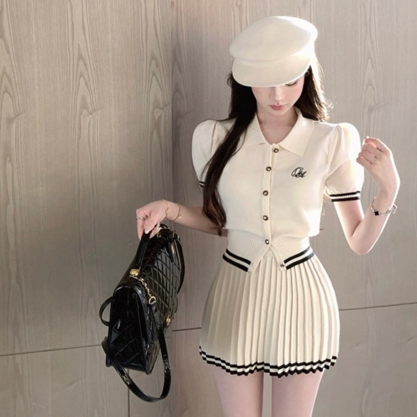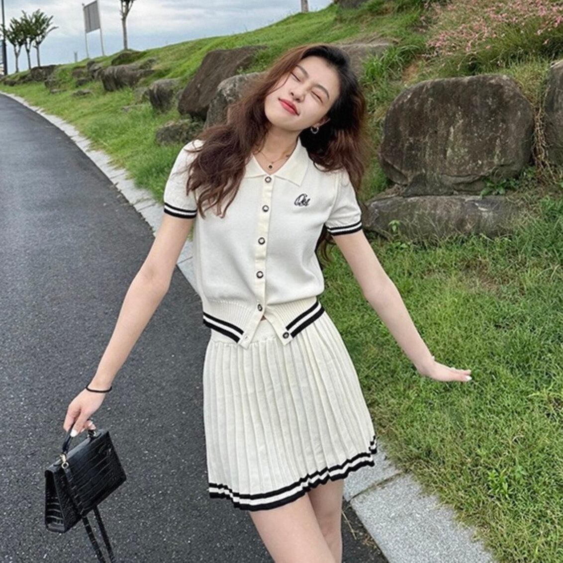 【set】ポロ襟半袖ニットトップス×プリーツAラインミニスカート HK0361