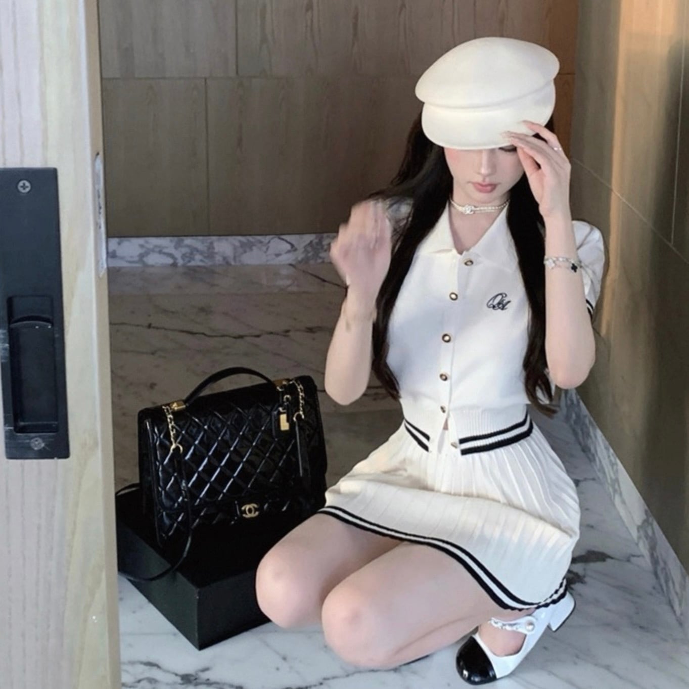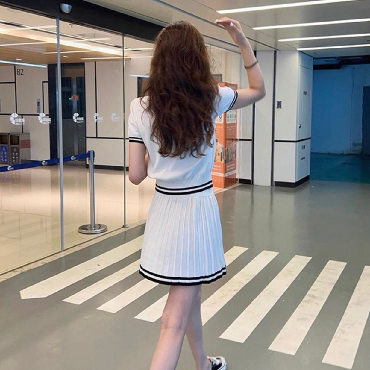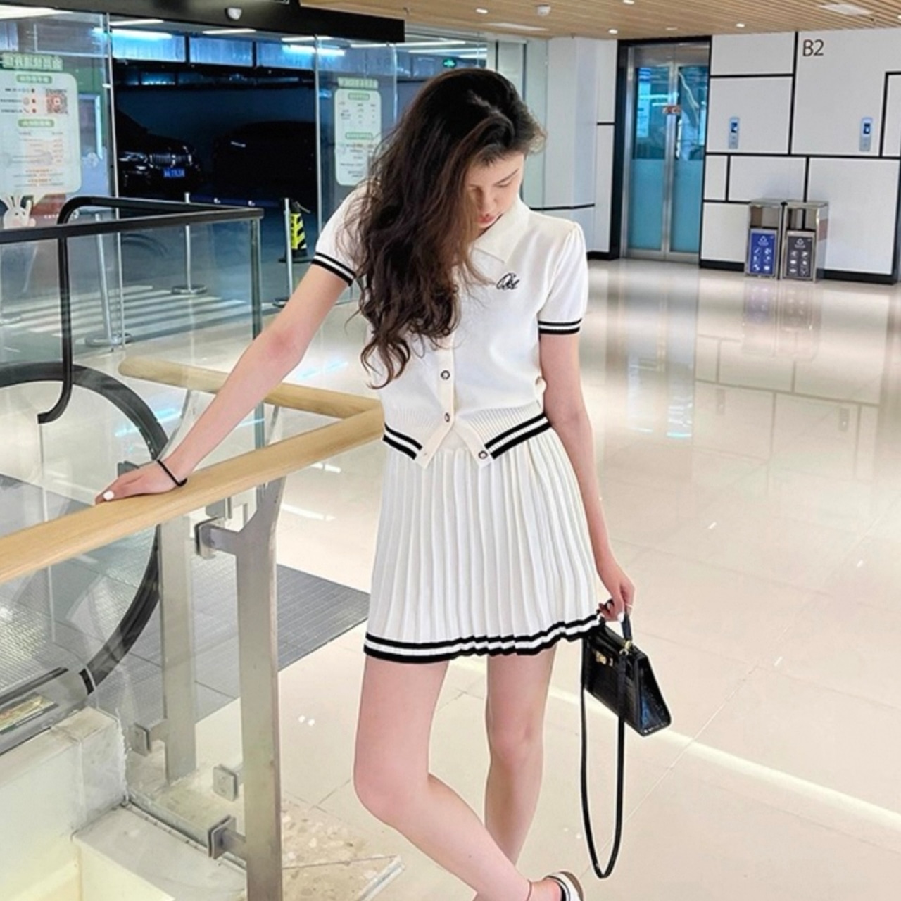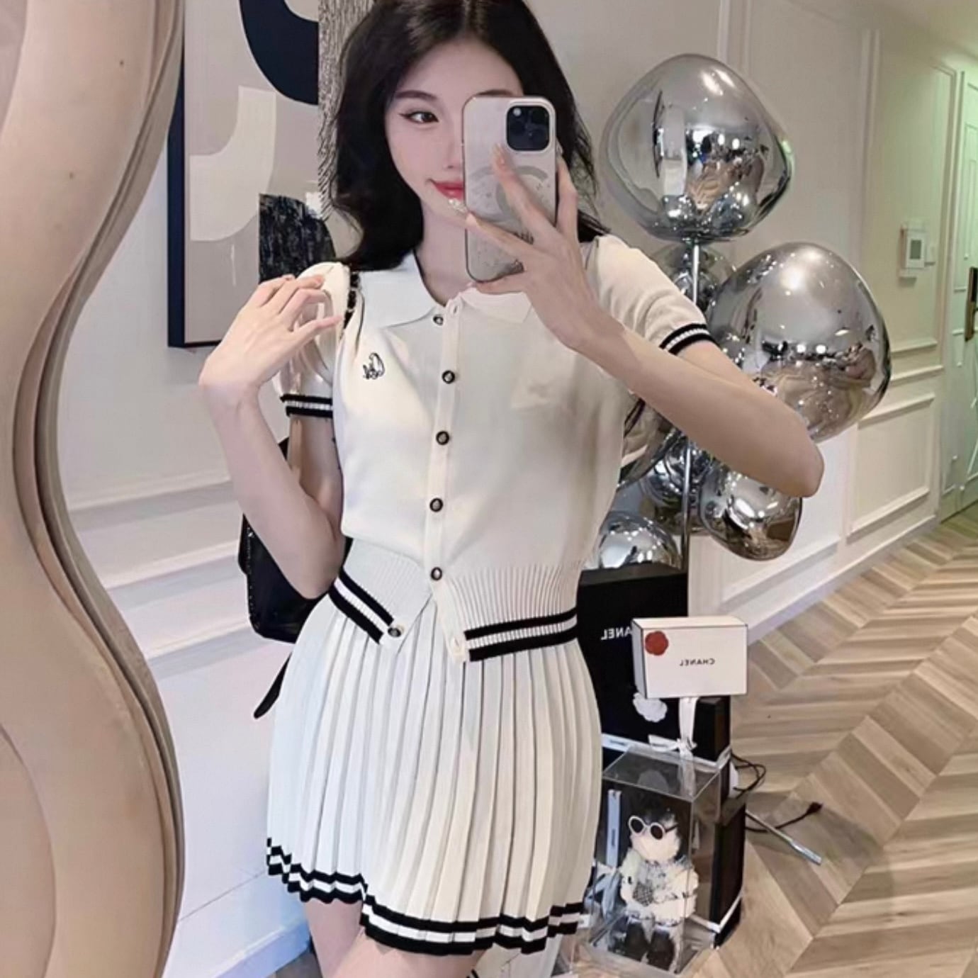 【set】ポロ襟半袖ニットトップス×プリーツAラインミニスカート HK0361