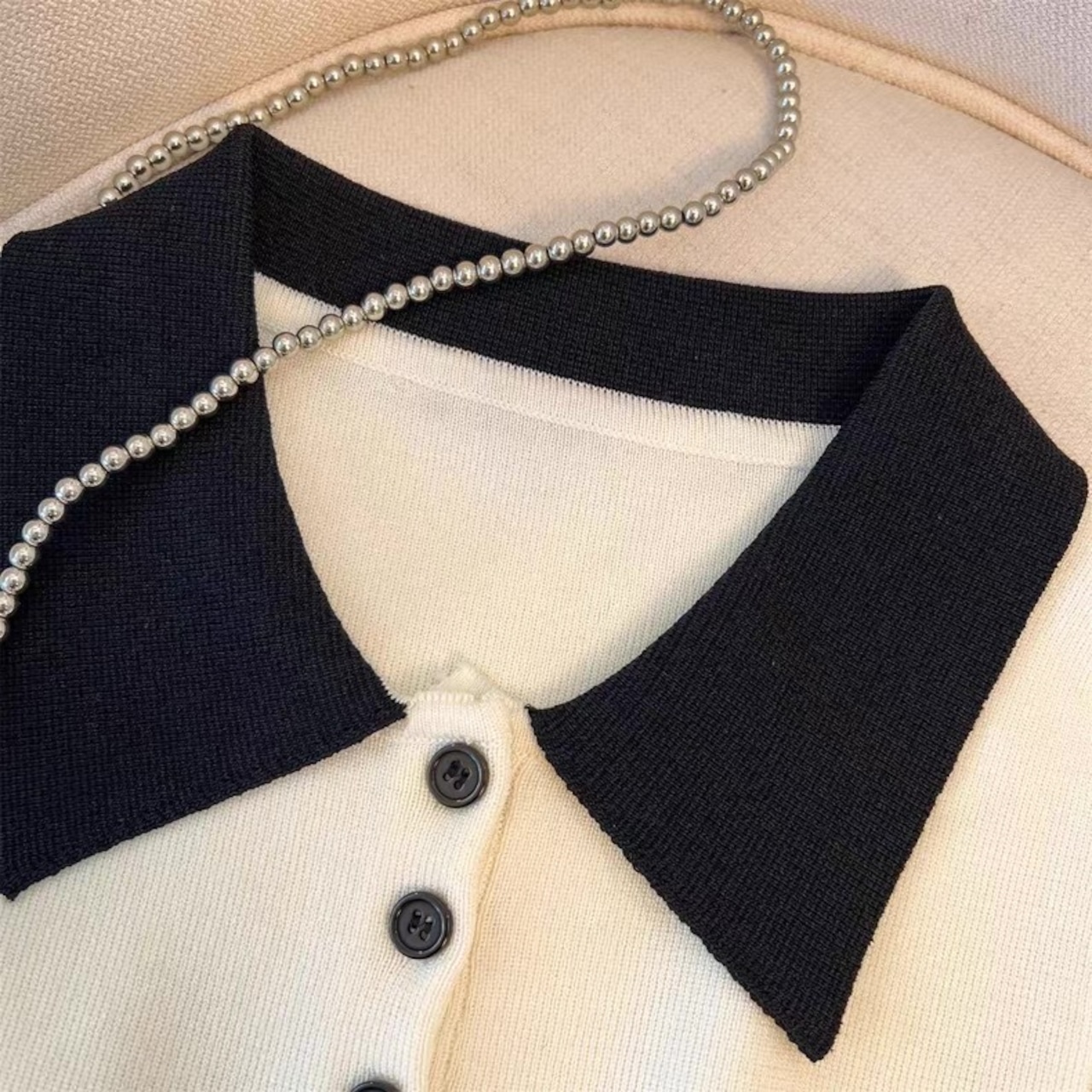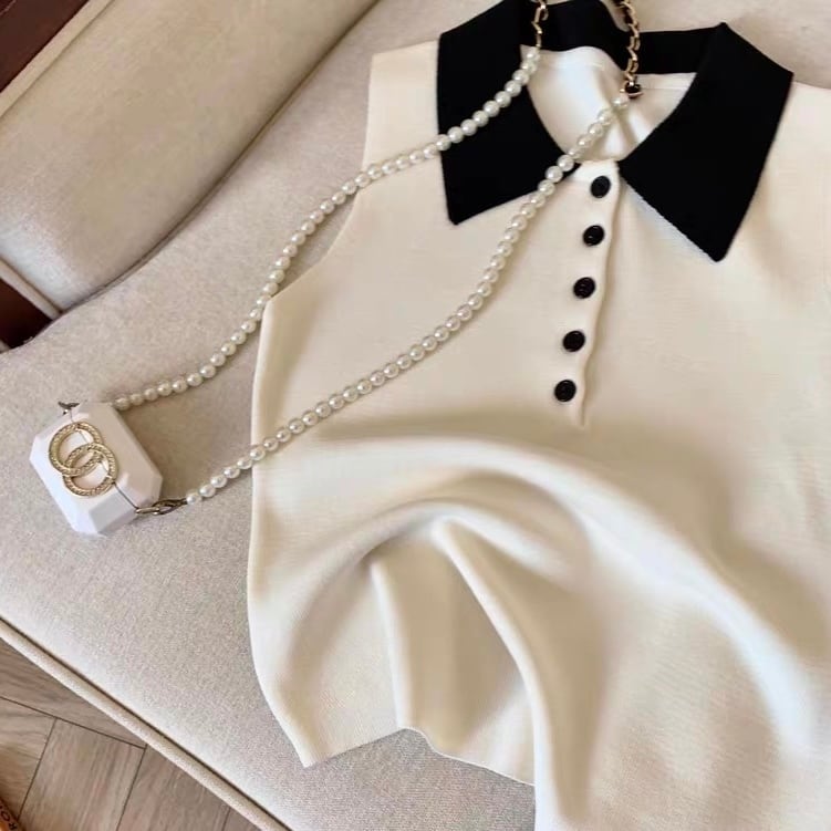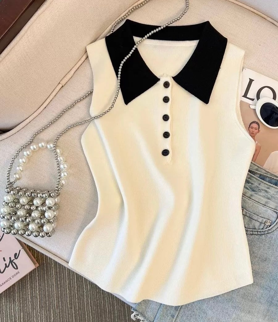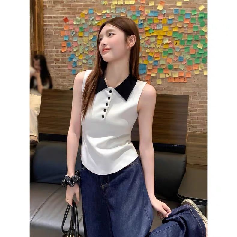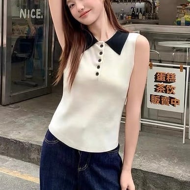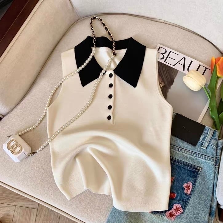 【tops】配色デザイン襟付きニットノースリーブトップス HK0372
