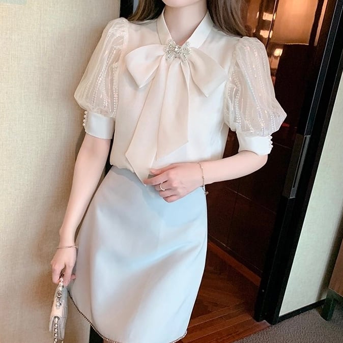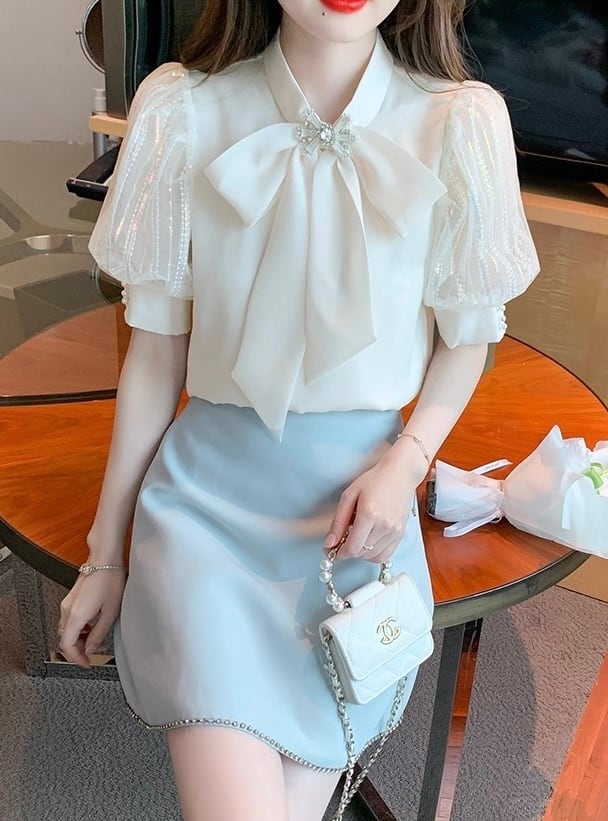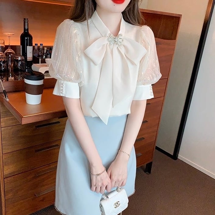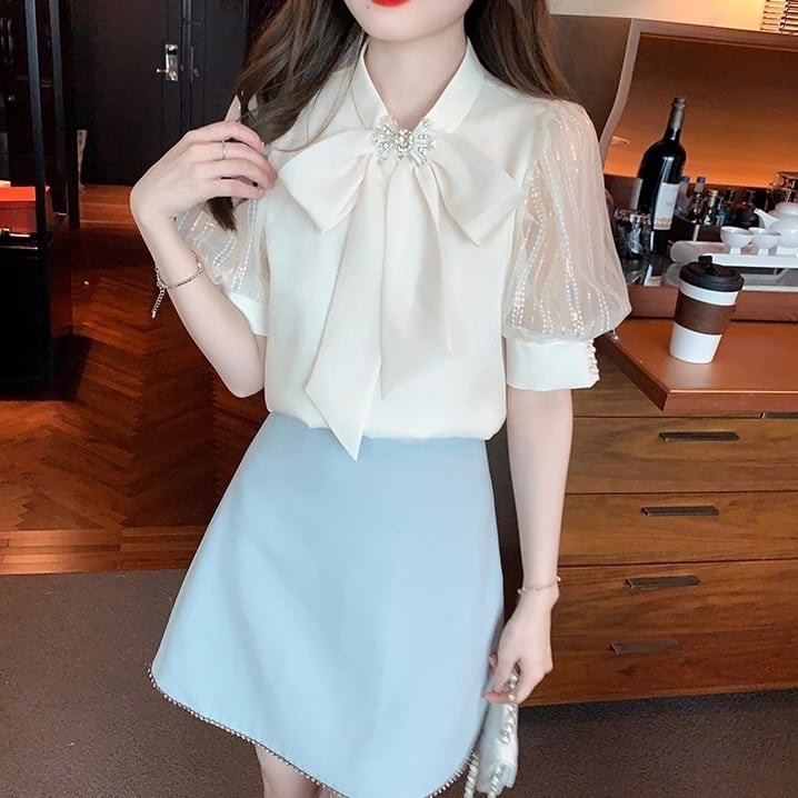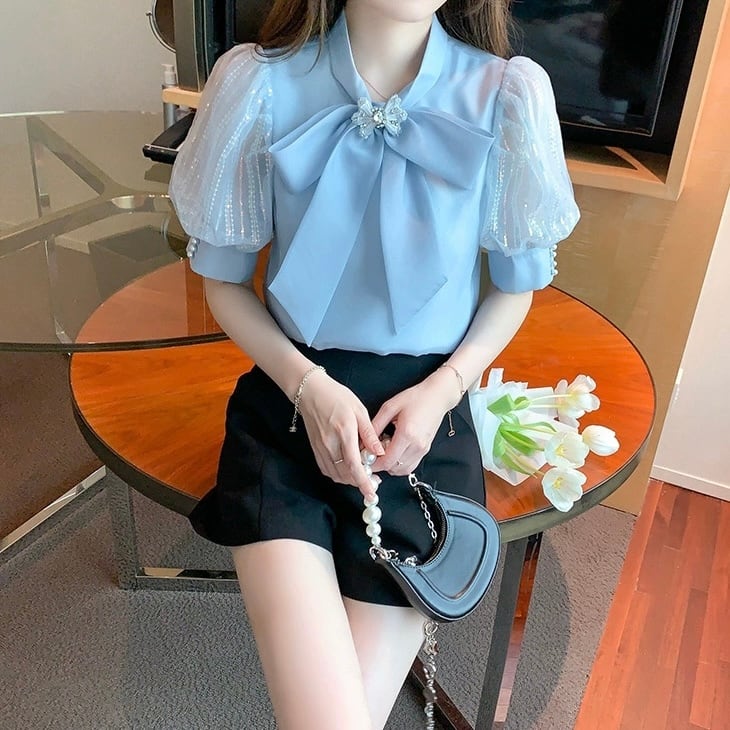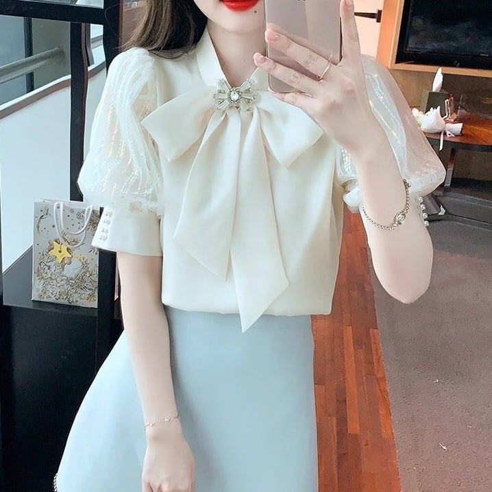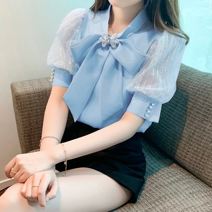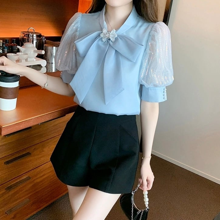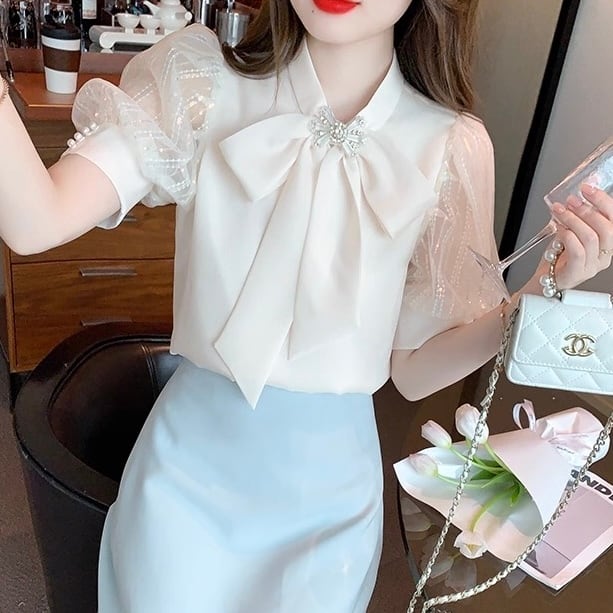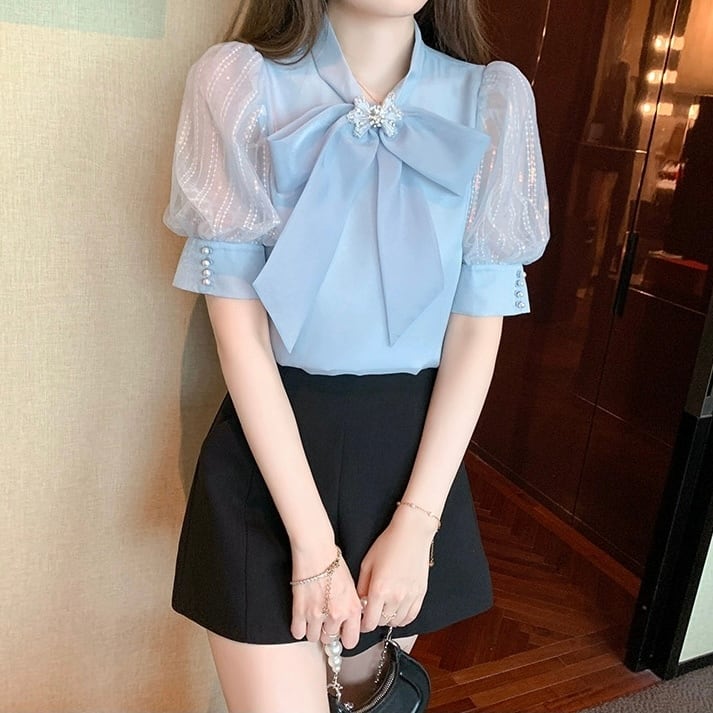 【tops】S〜2XL2色シフォン半袖ブラウス HK0387