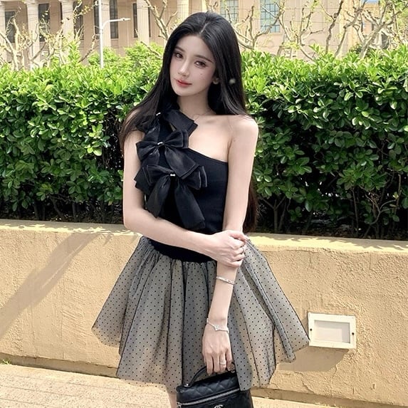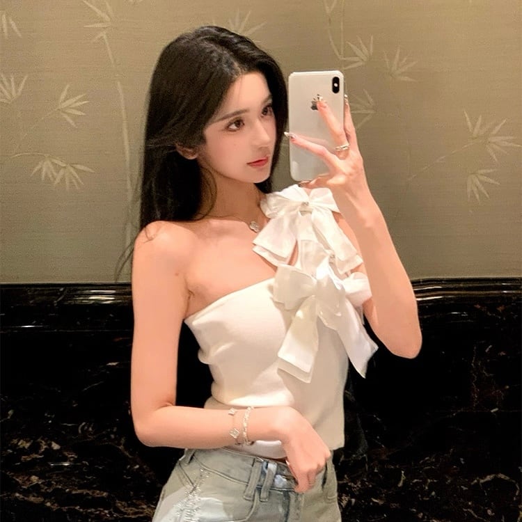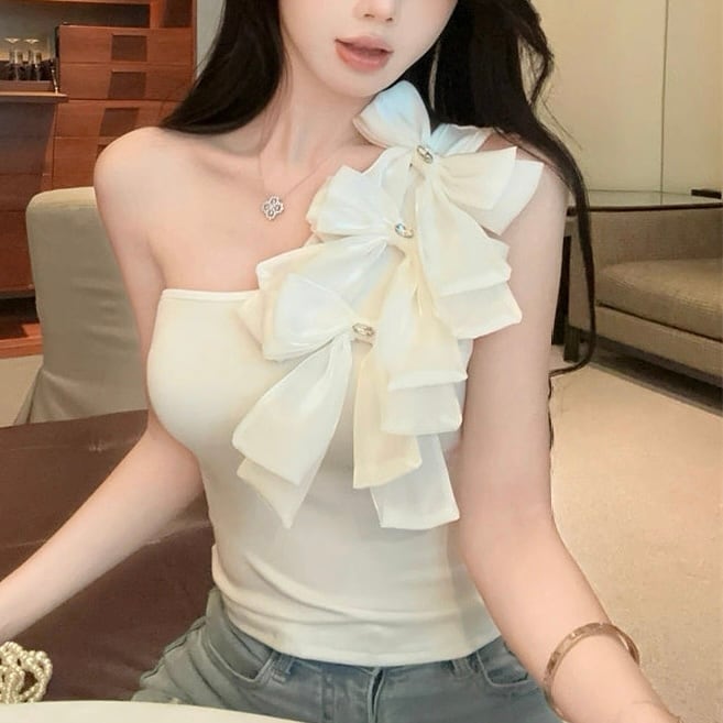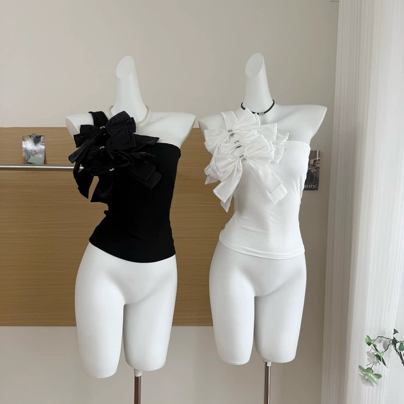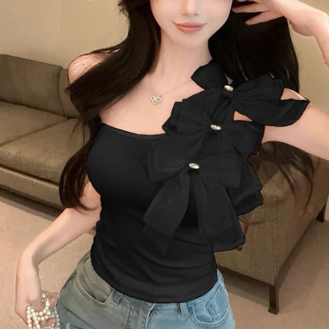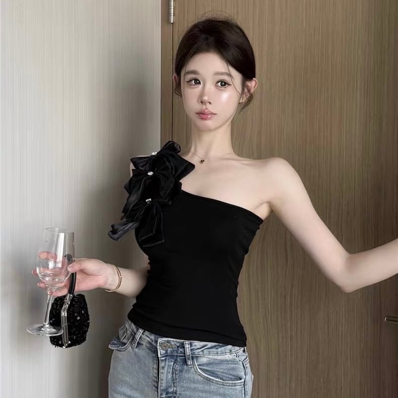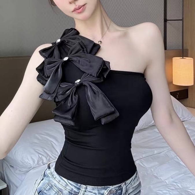 【tops】2色リボンアシンメトリーショルダートップス HK0399