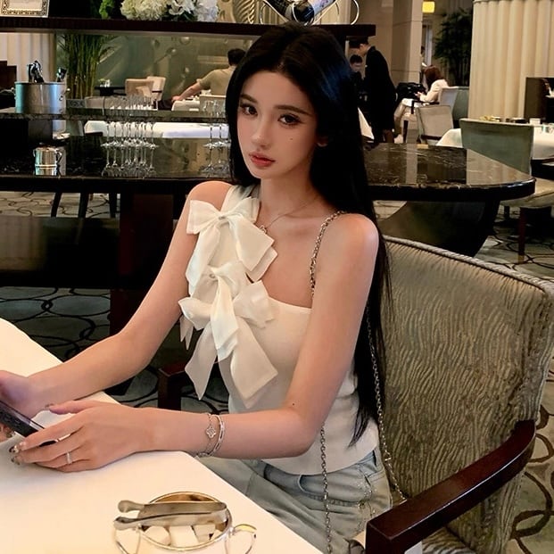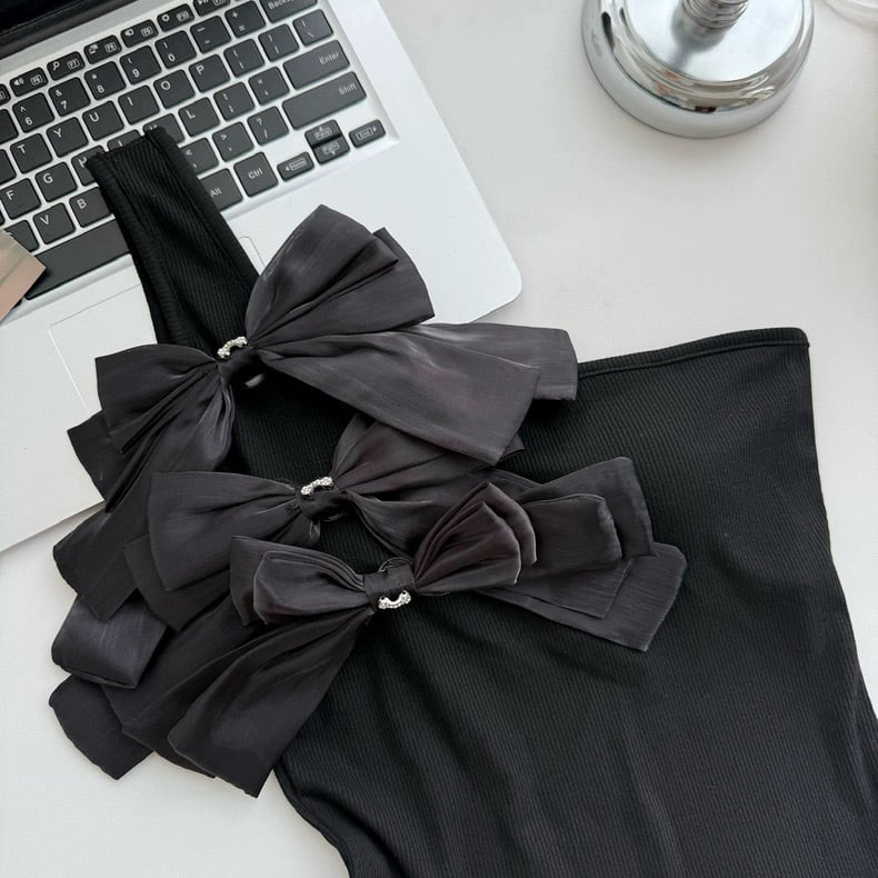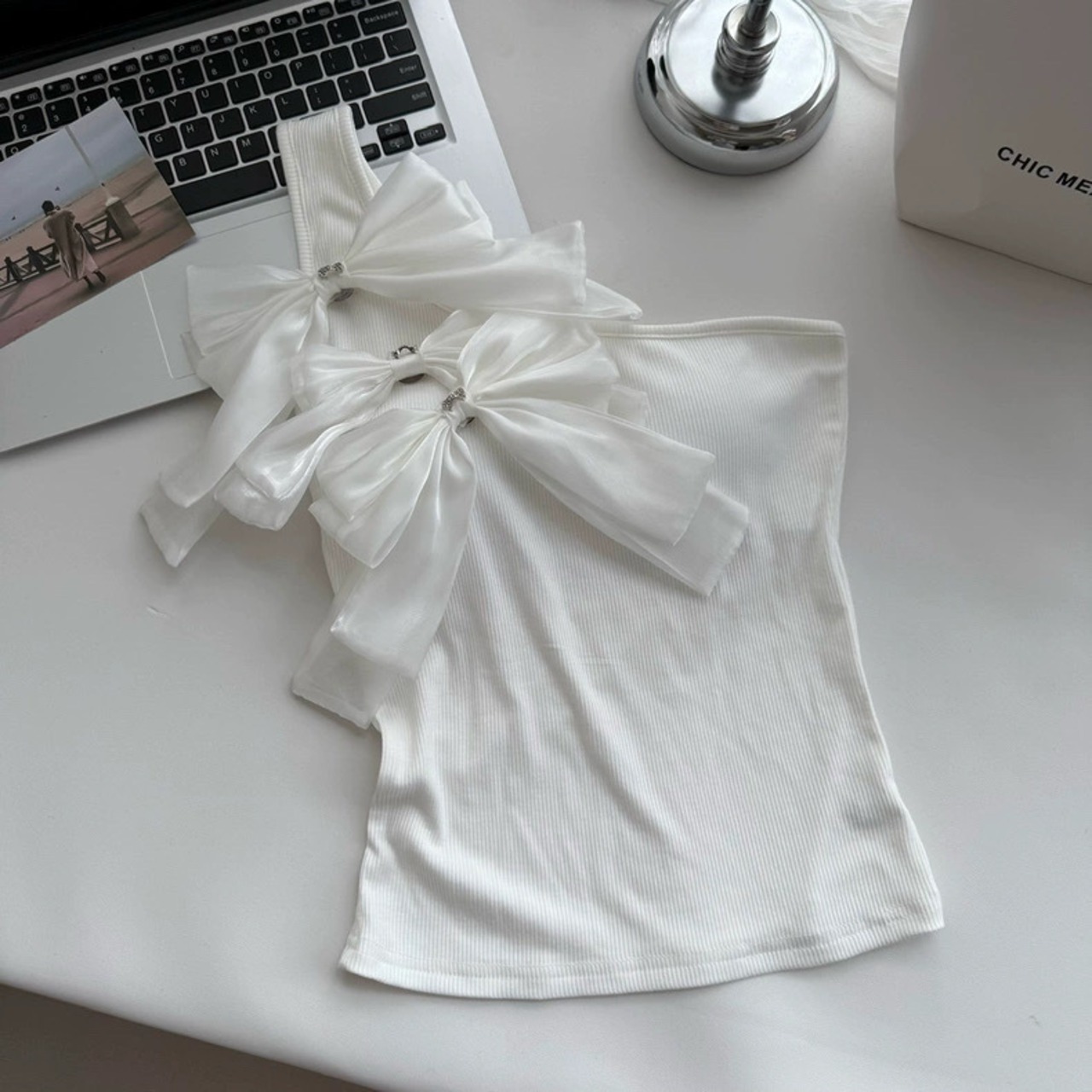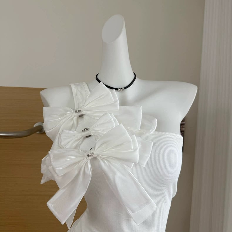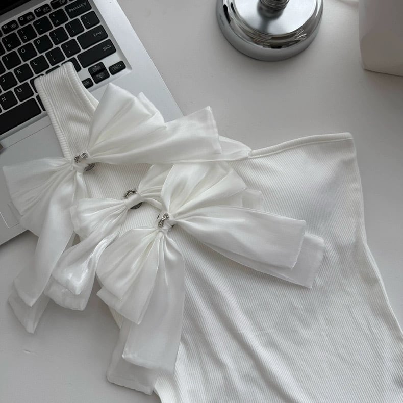 【tops】2色リボンアシンメトリーショルダートップス HK0399