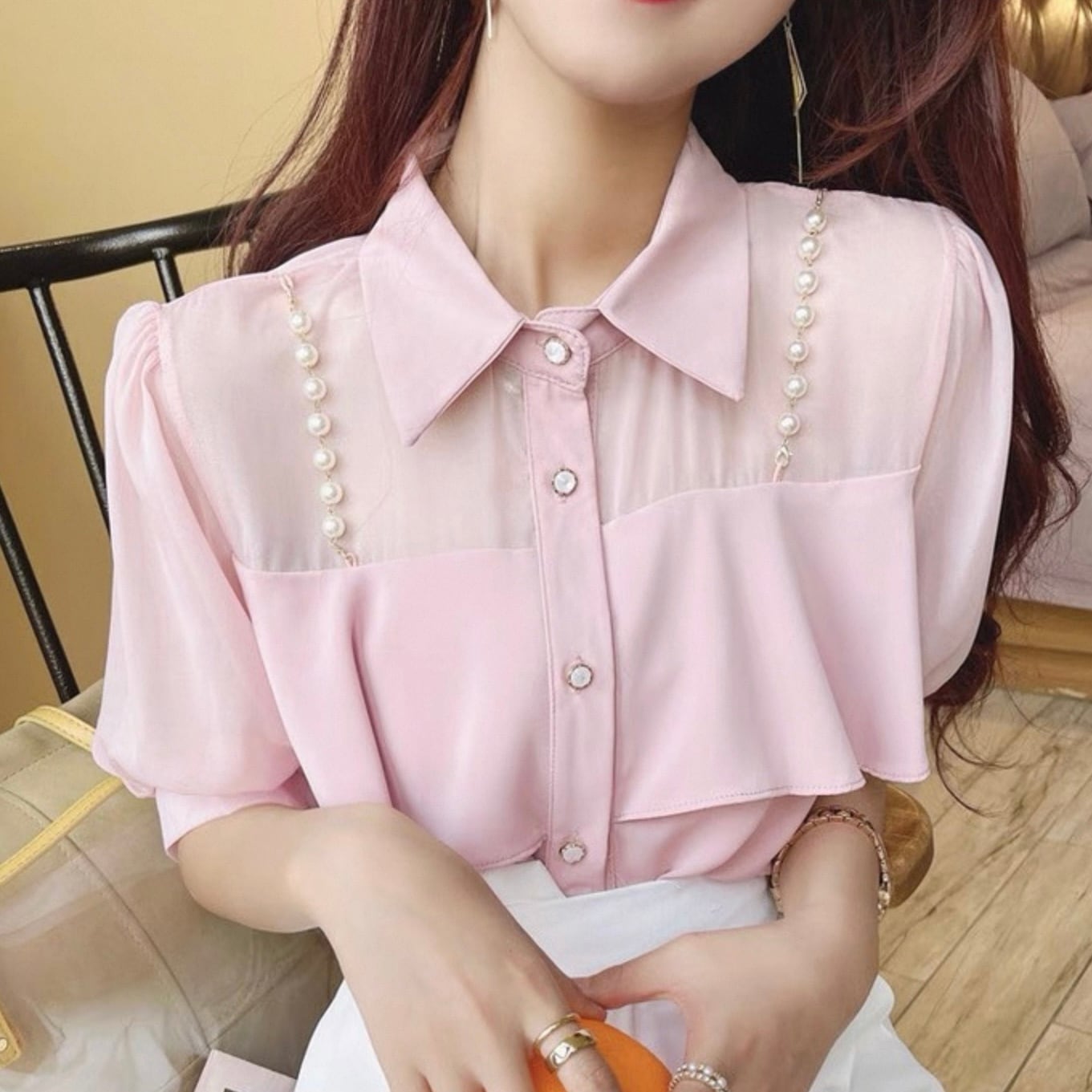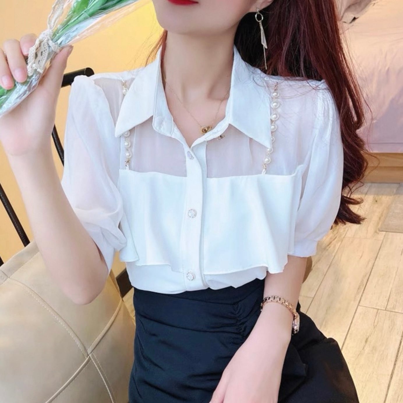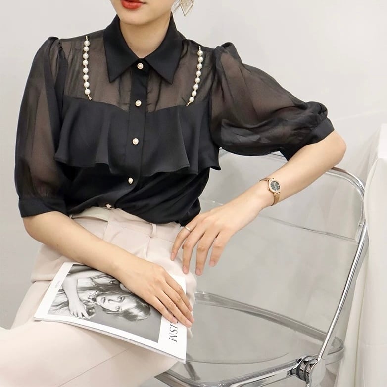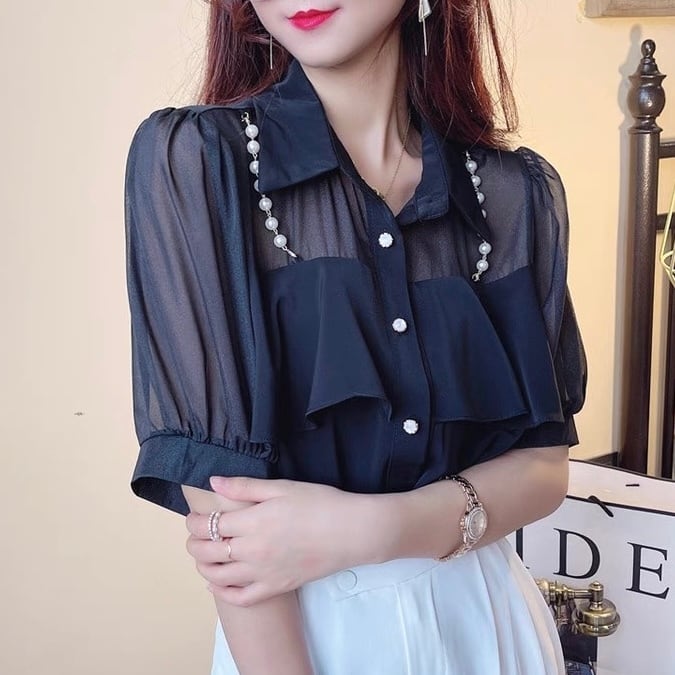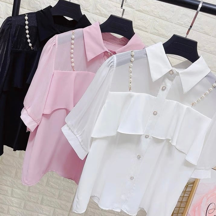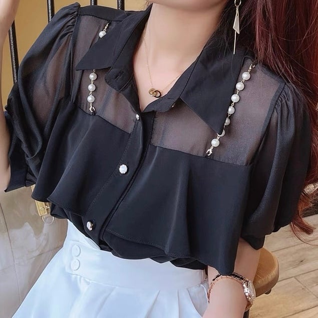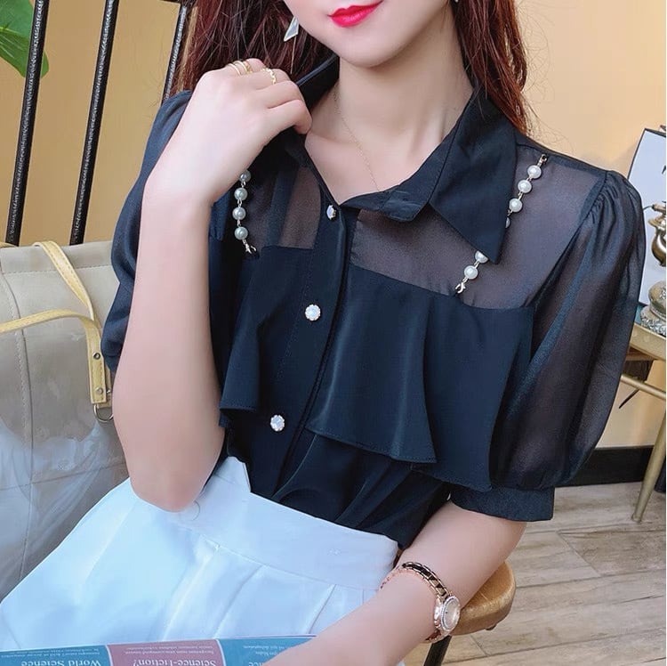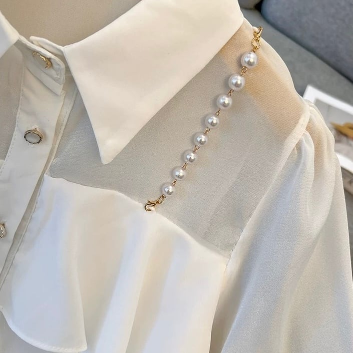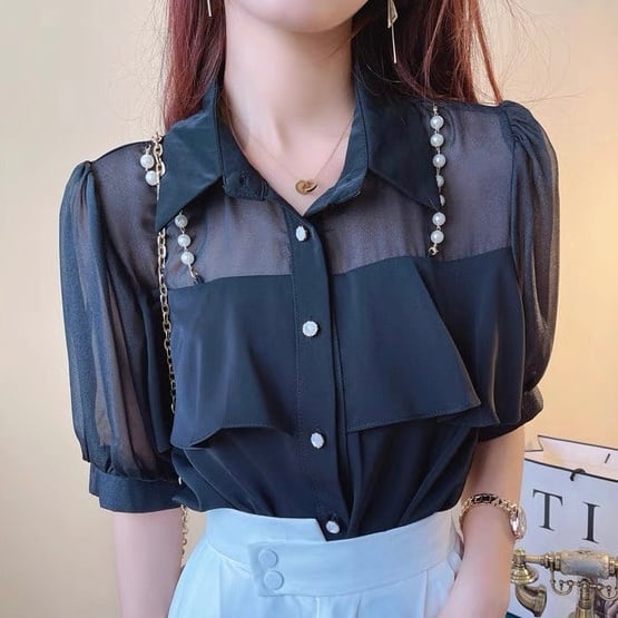 【tops】3色パールショルダーストラップ付きシホンシャツ HK0344