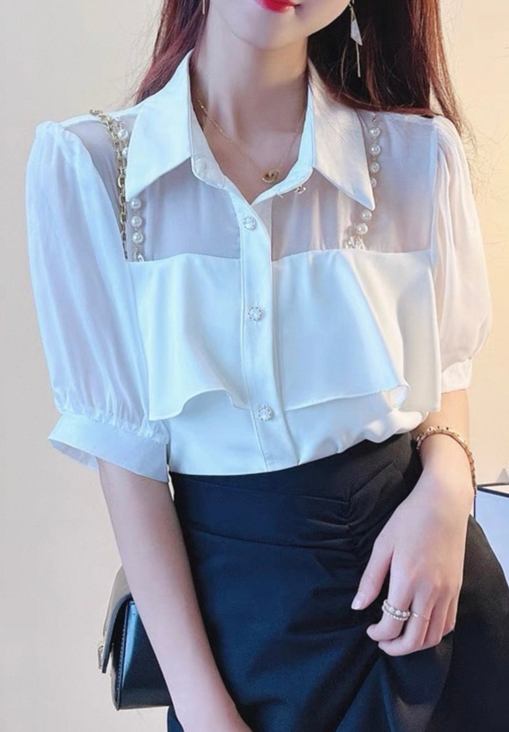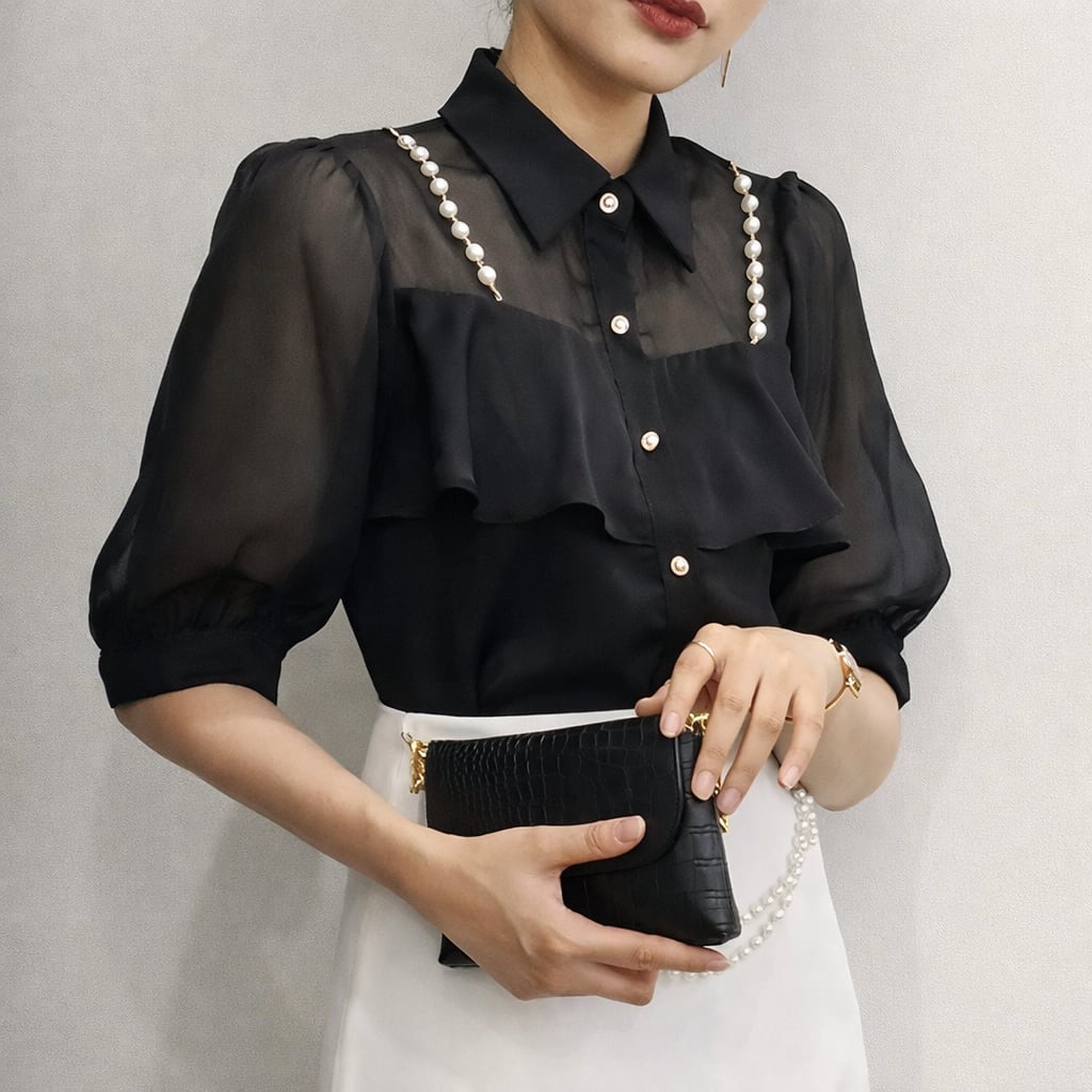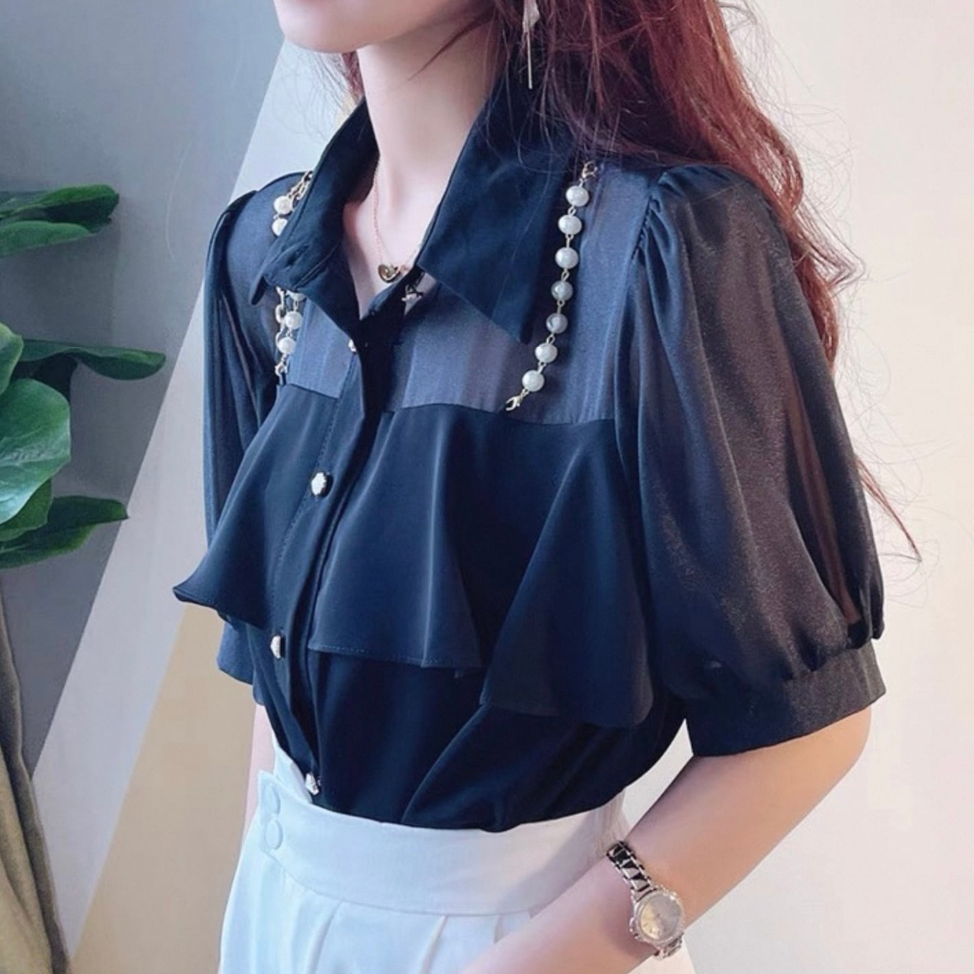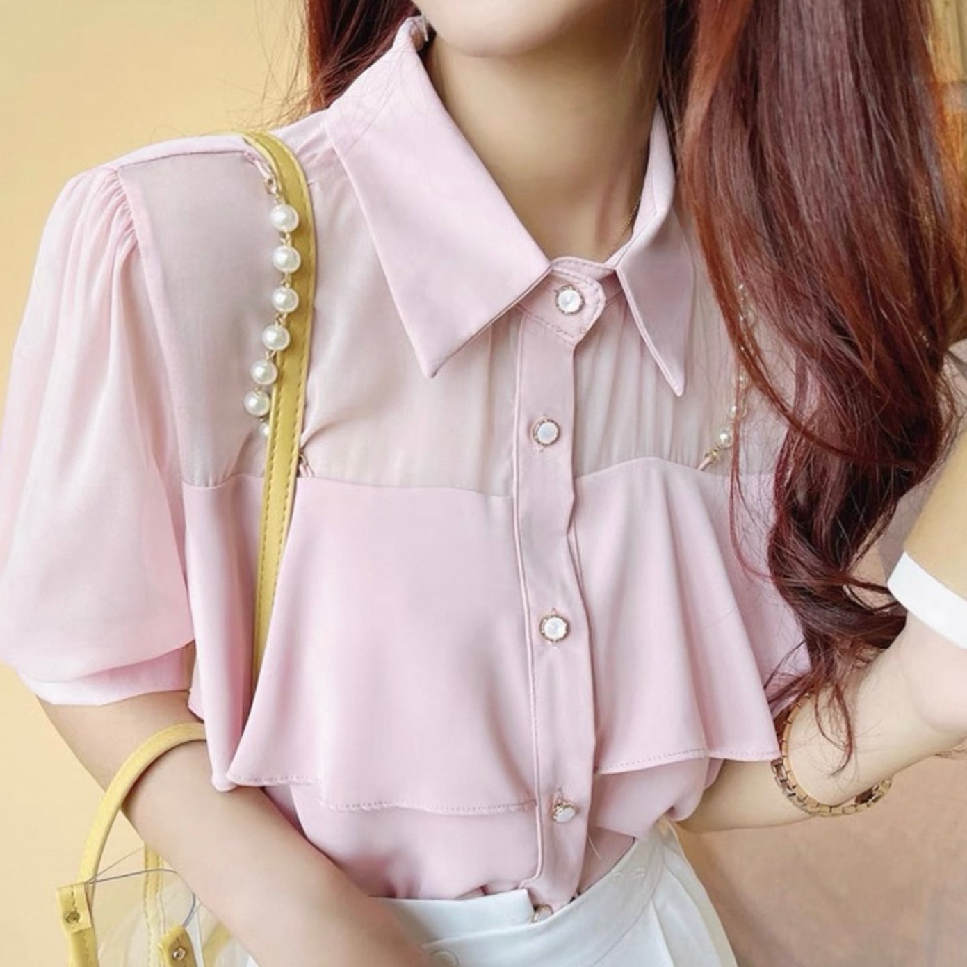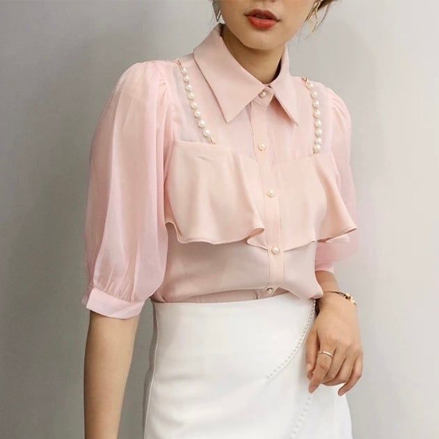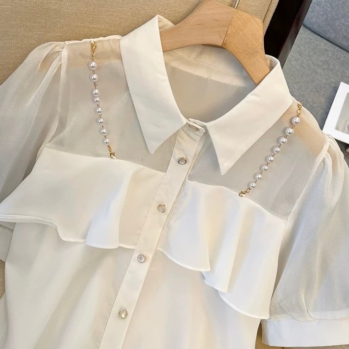 【tops】3色パールショルダーストラップ付きシホンシャツ HK0344