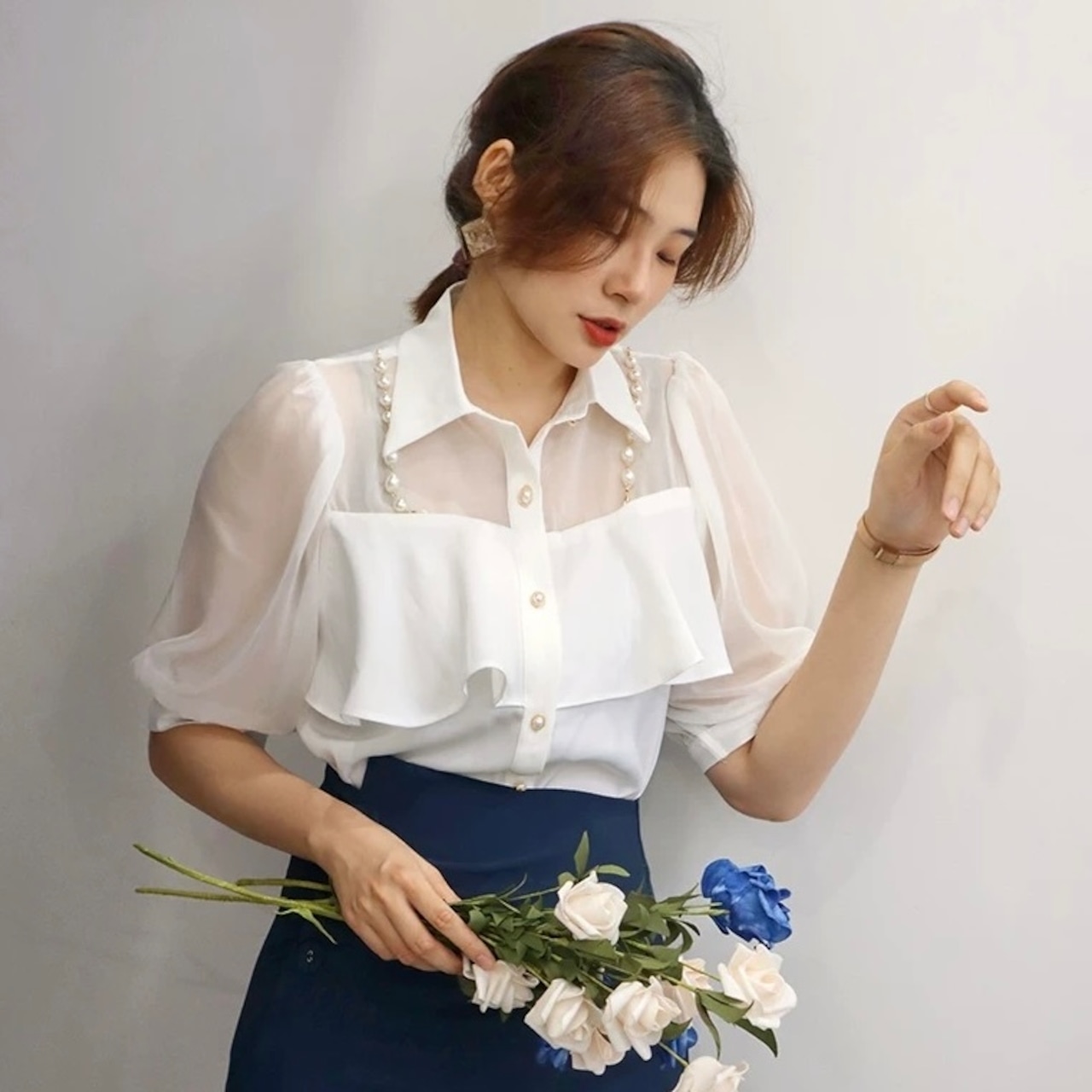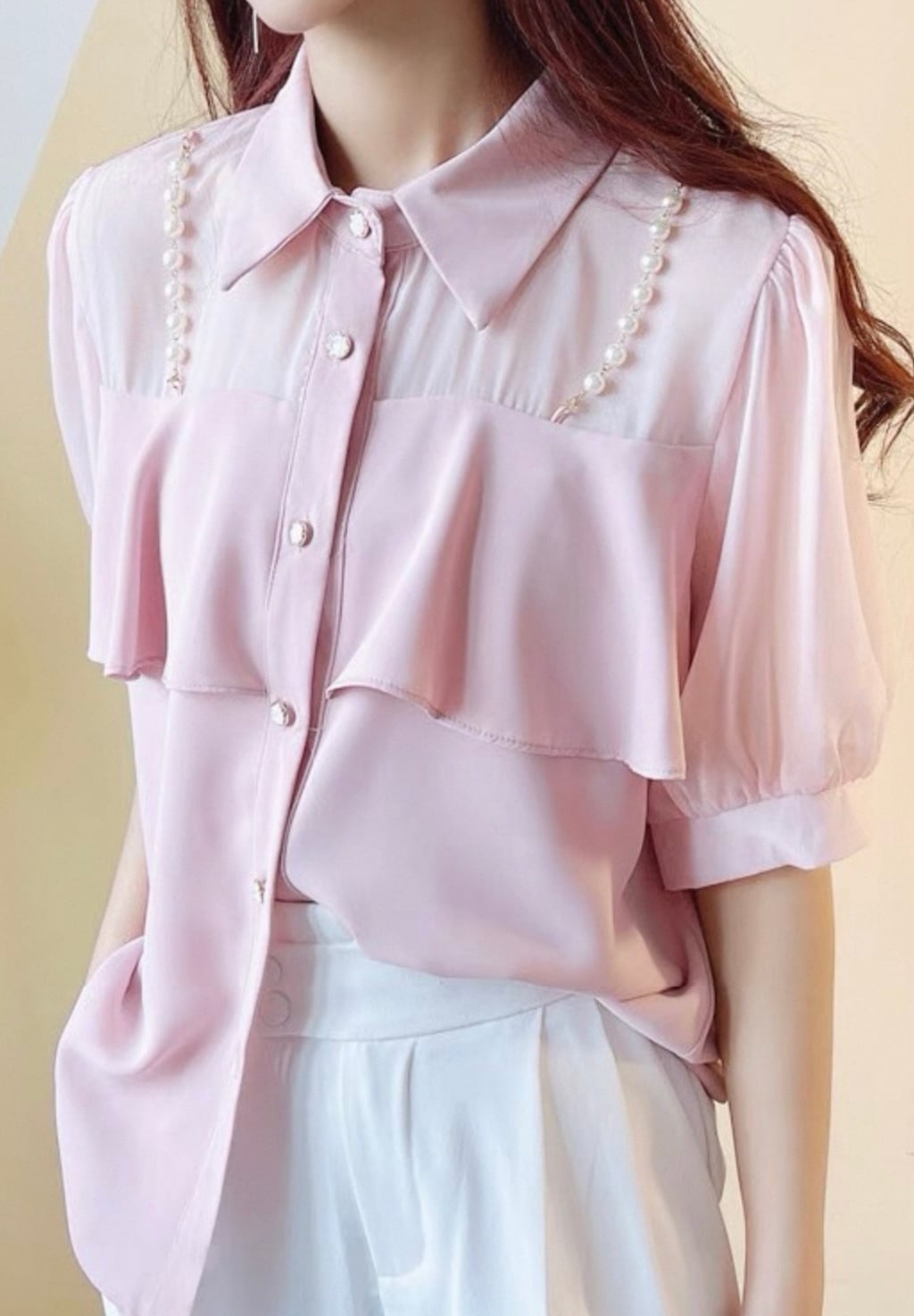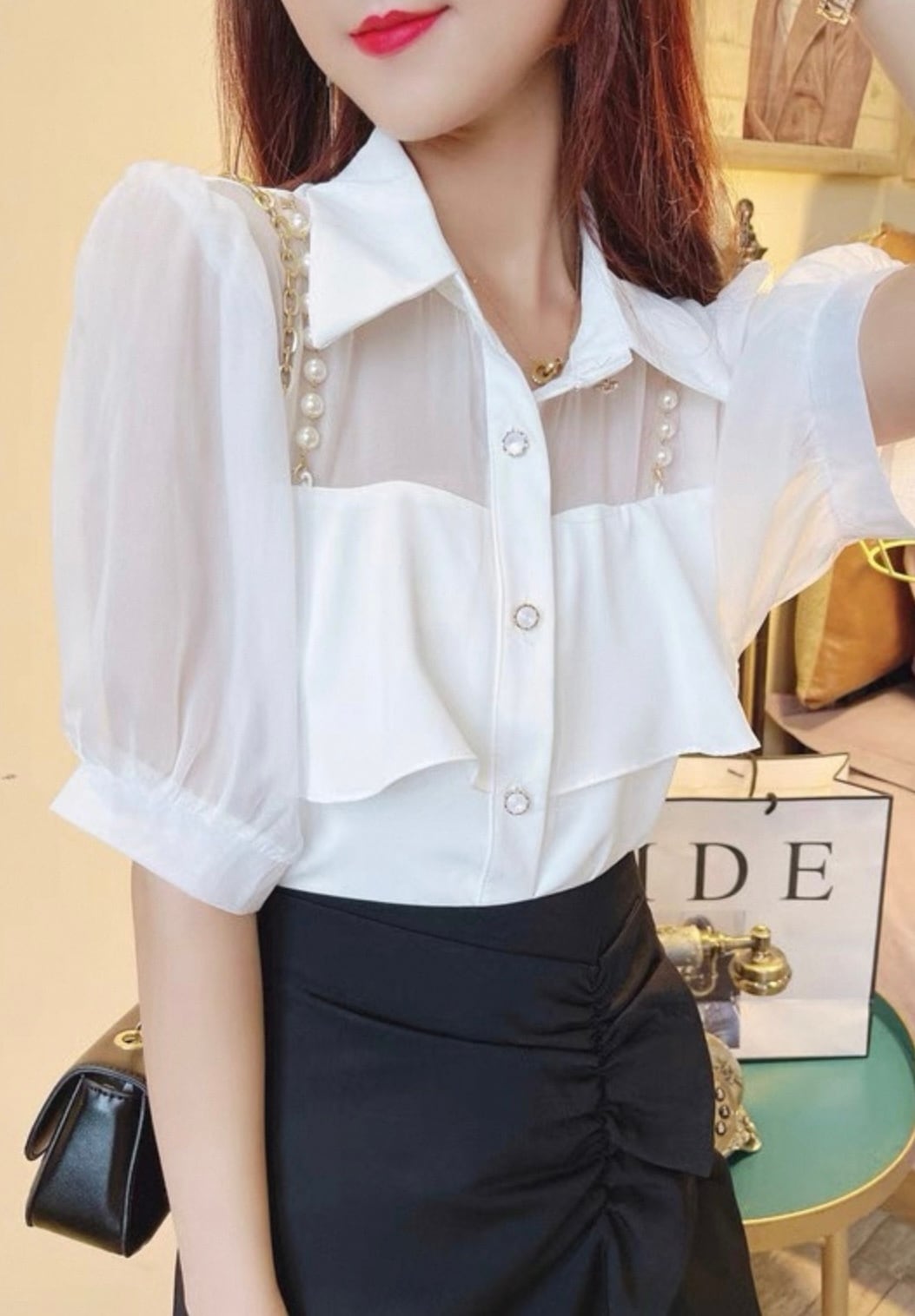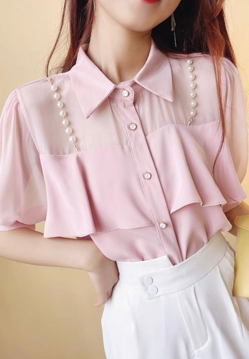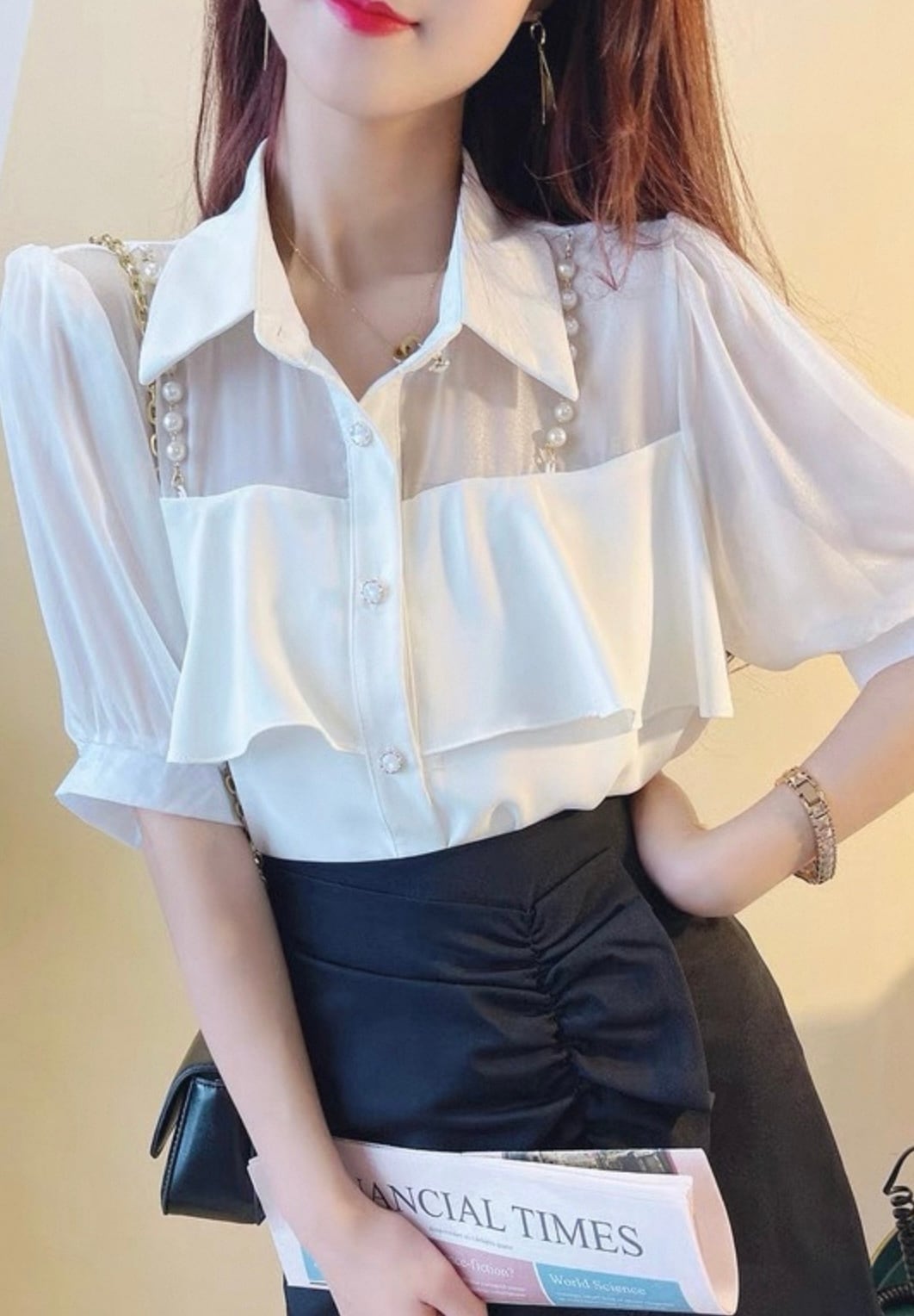 【tops】3色パールショルダーストラップ付きシホンシャツ HK0344
