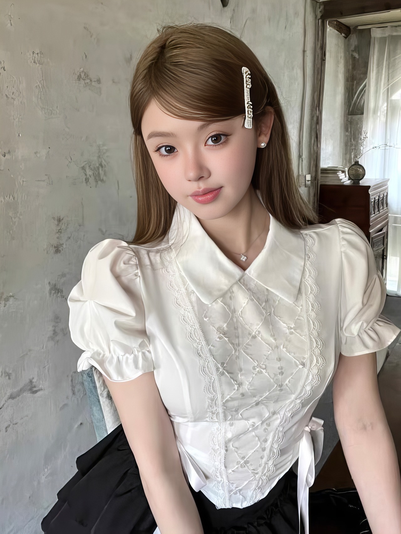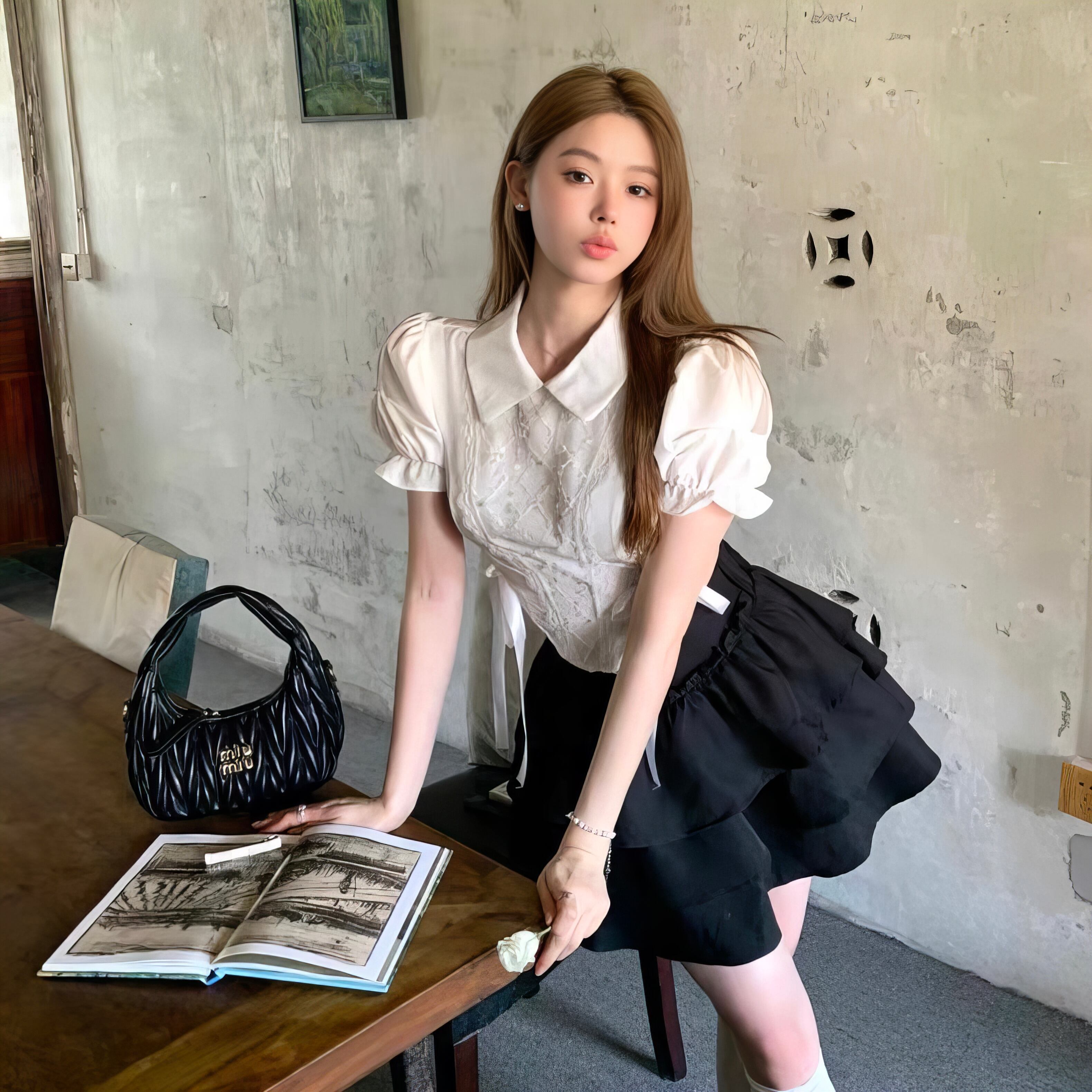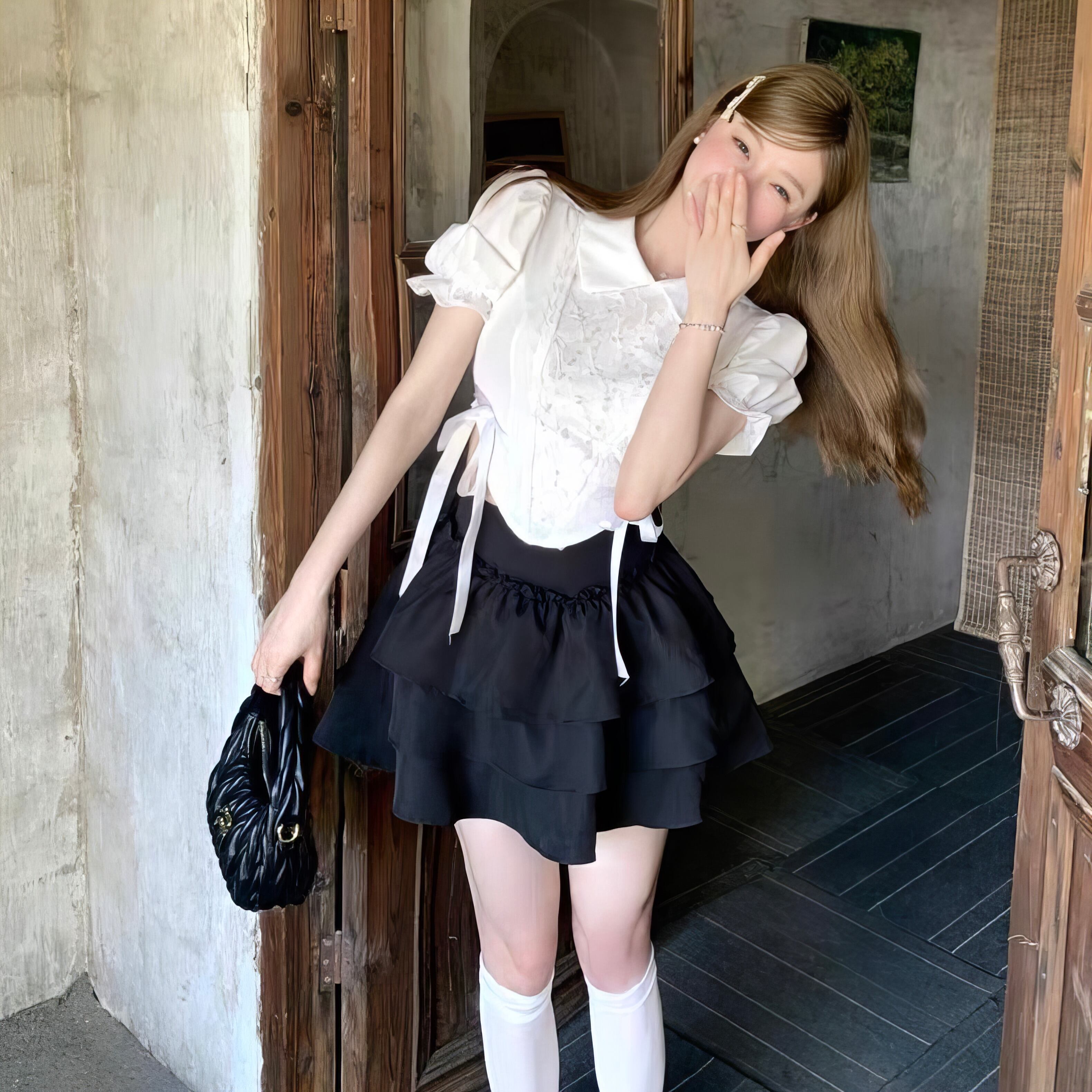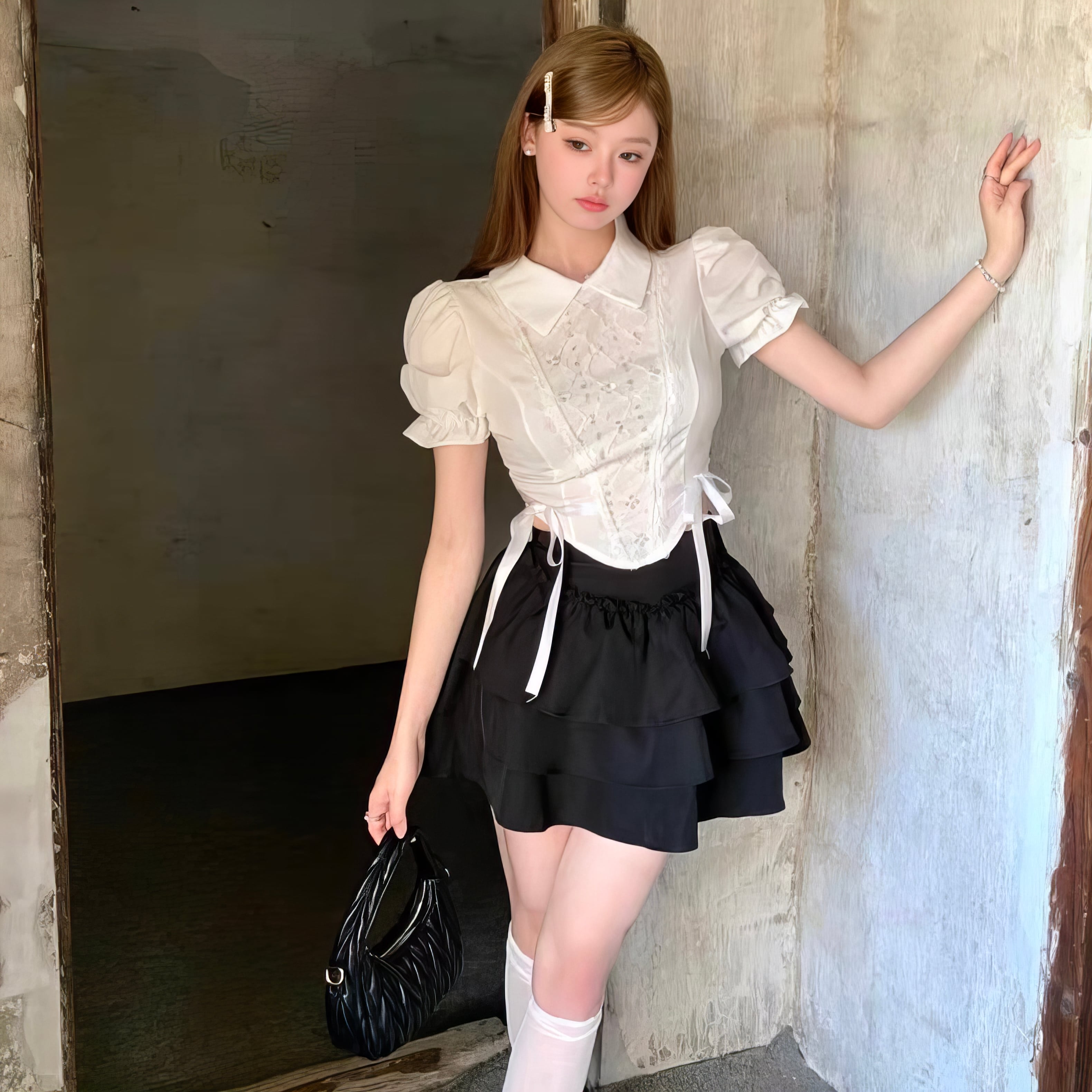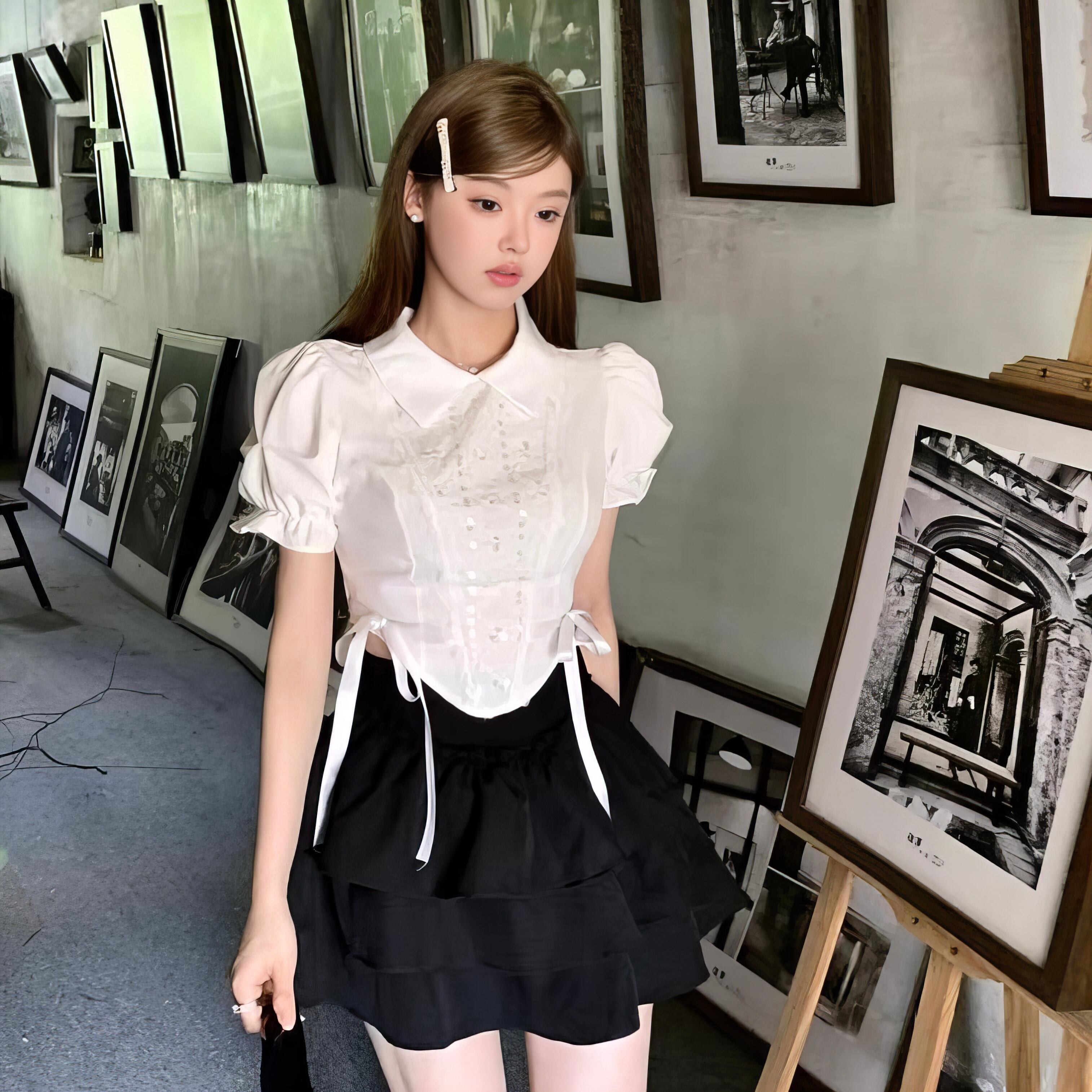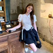 【set】パフスリーブ半袖ブラウス×フリルミニスカート HK0359