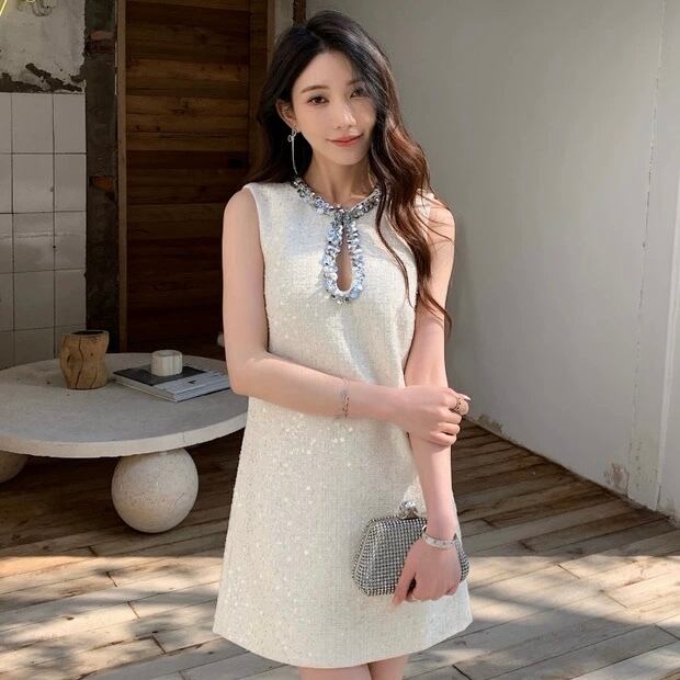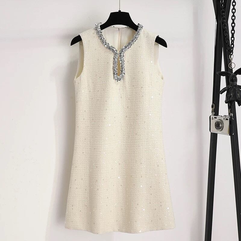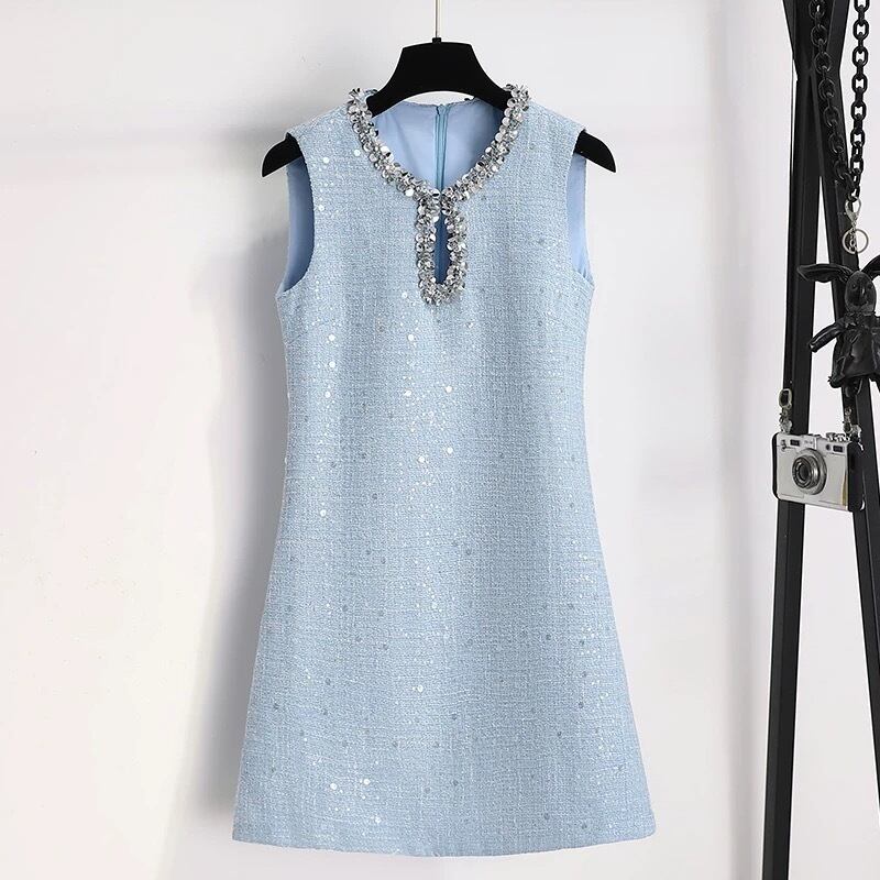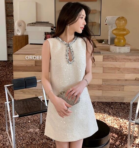 【dress】2色スパンコールツイードノースリーブワンピース HR3305