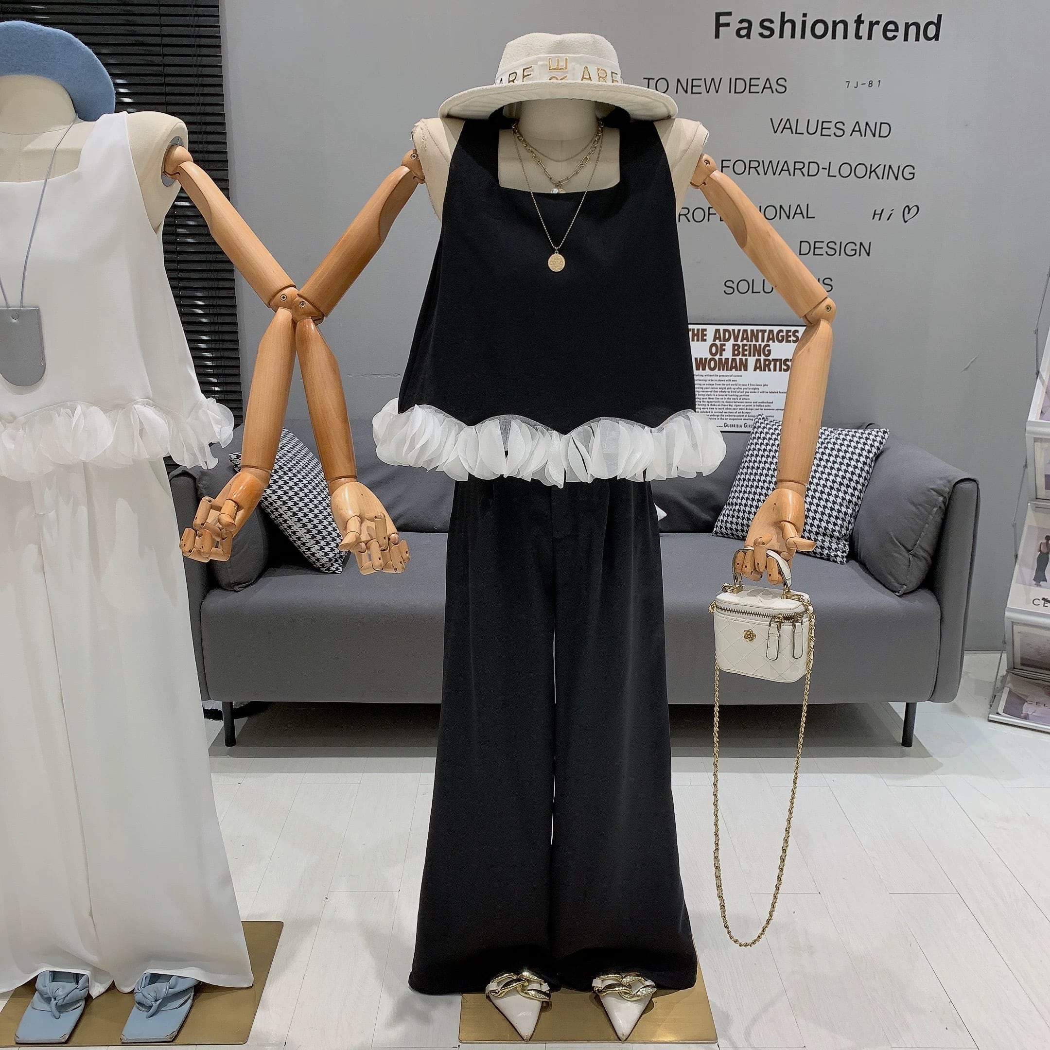 【set】2色スクエアノースリーブトップスxハイウエストパンツ RH4013