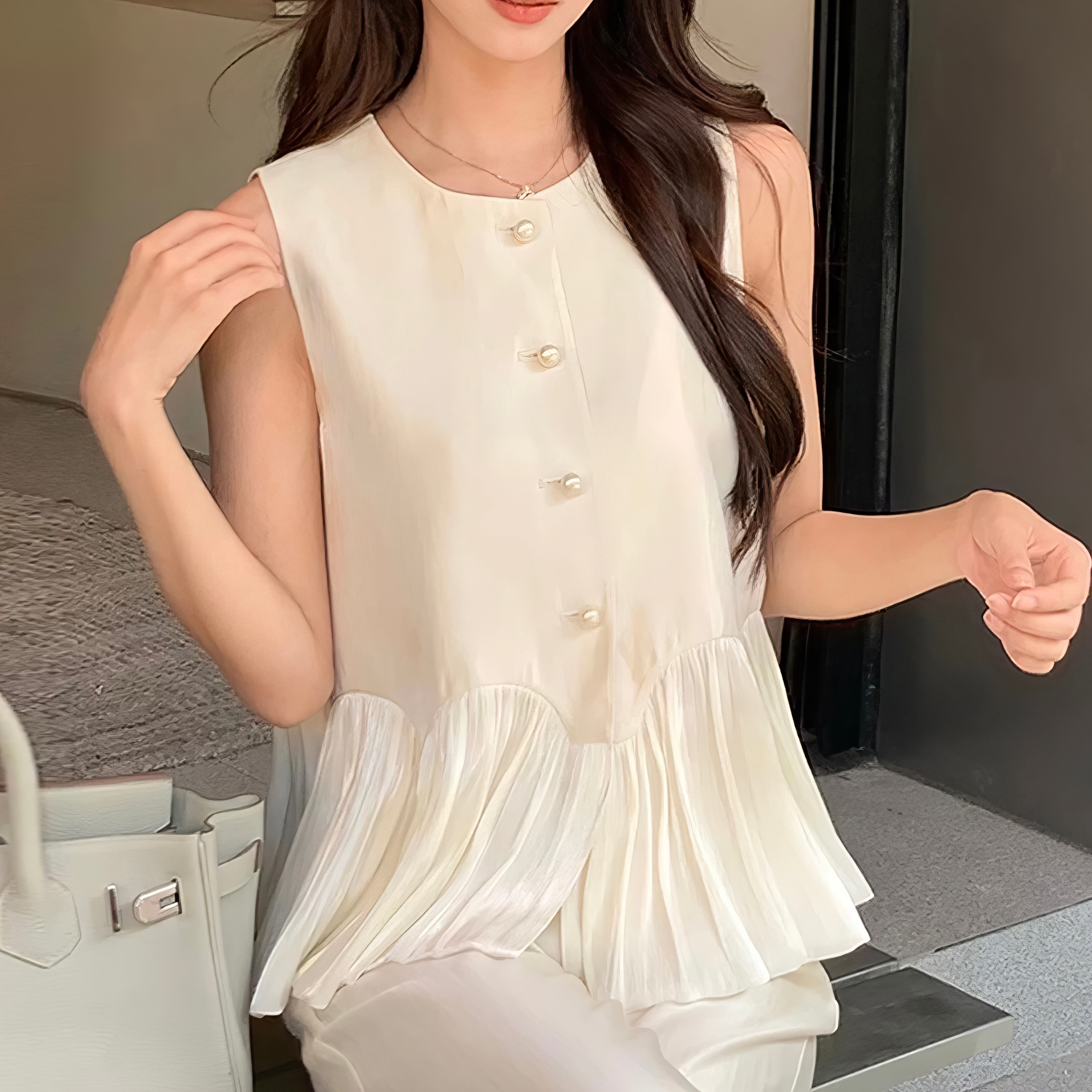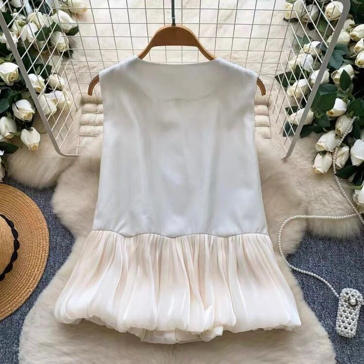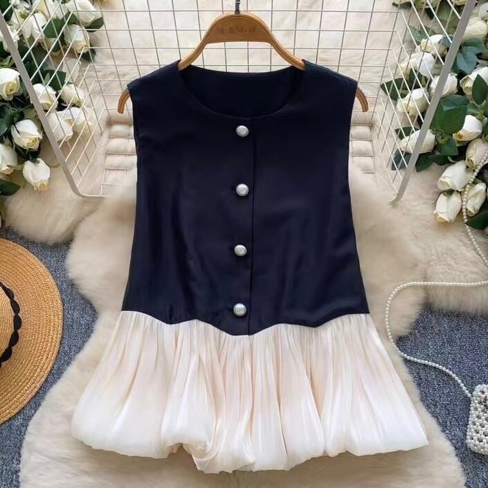 【tops】2色パール調シアーメッシュ切り替えノースリーブトップス HK0373