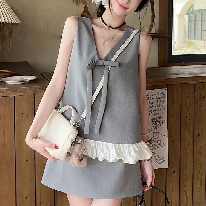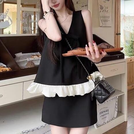 【set】2色ペプラム風フリル裾ノースリーブトップス×ミニスカート HK0374