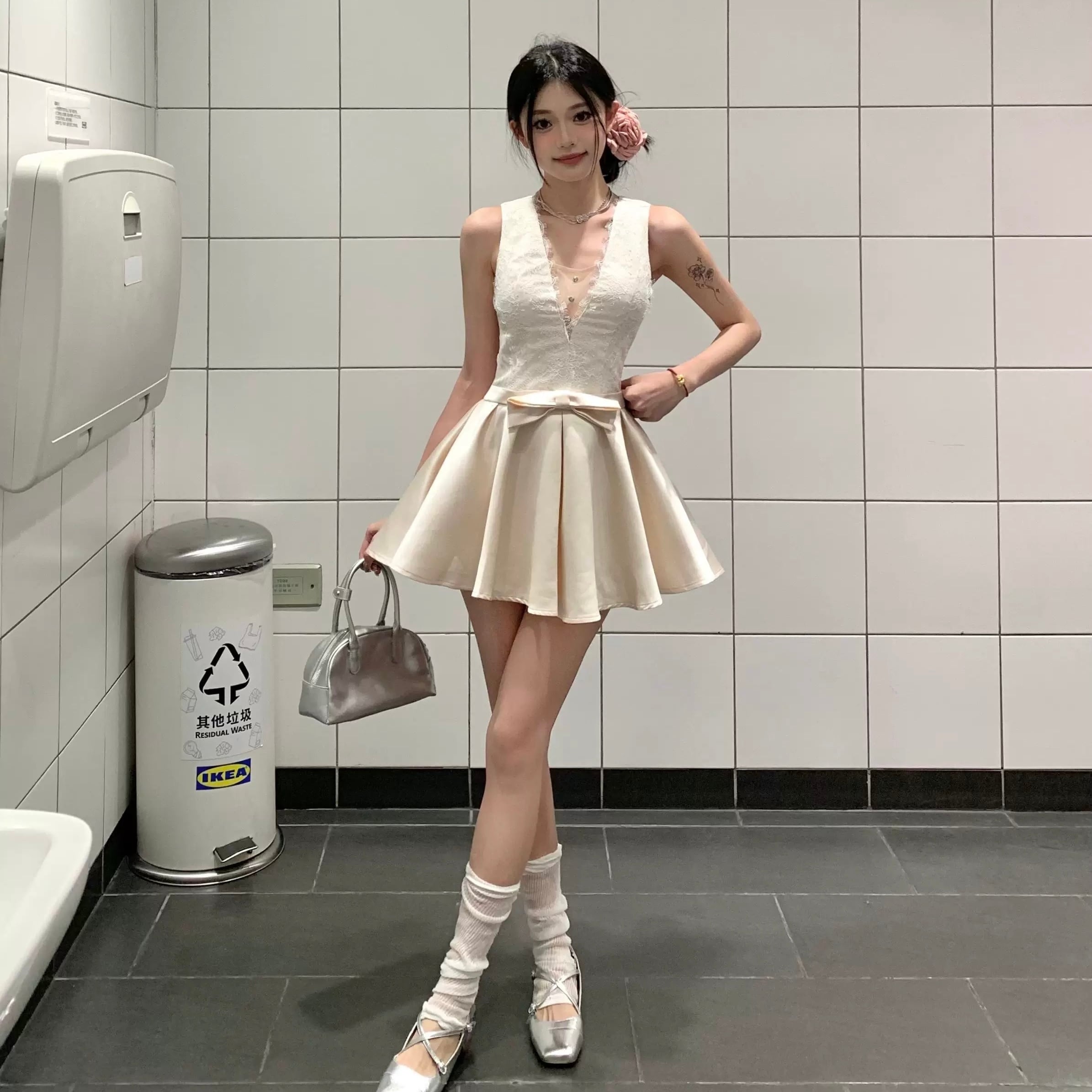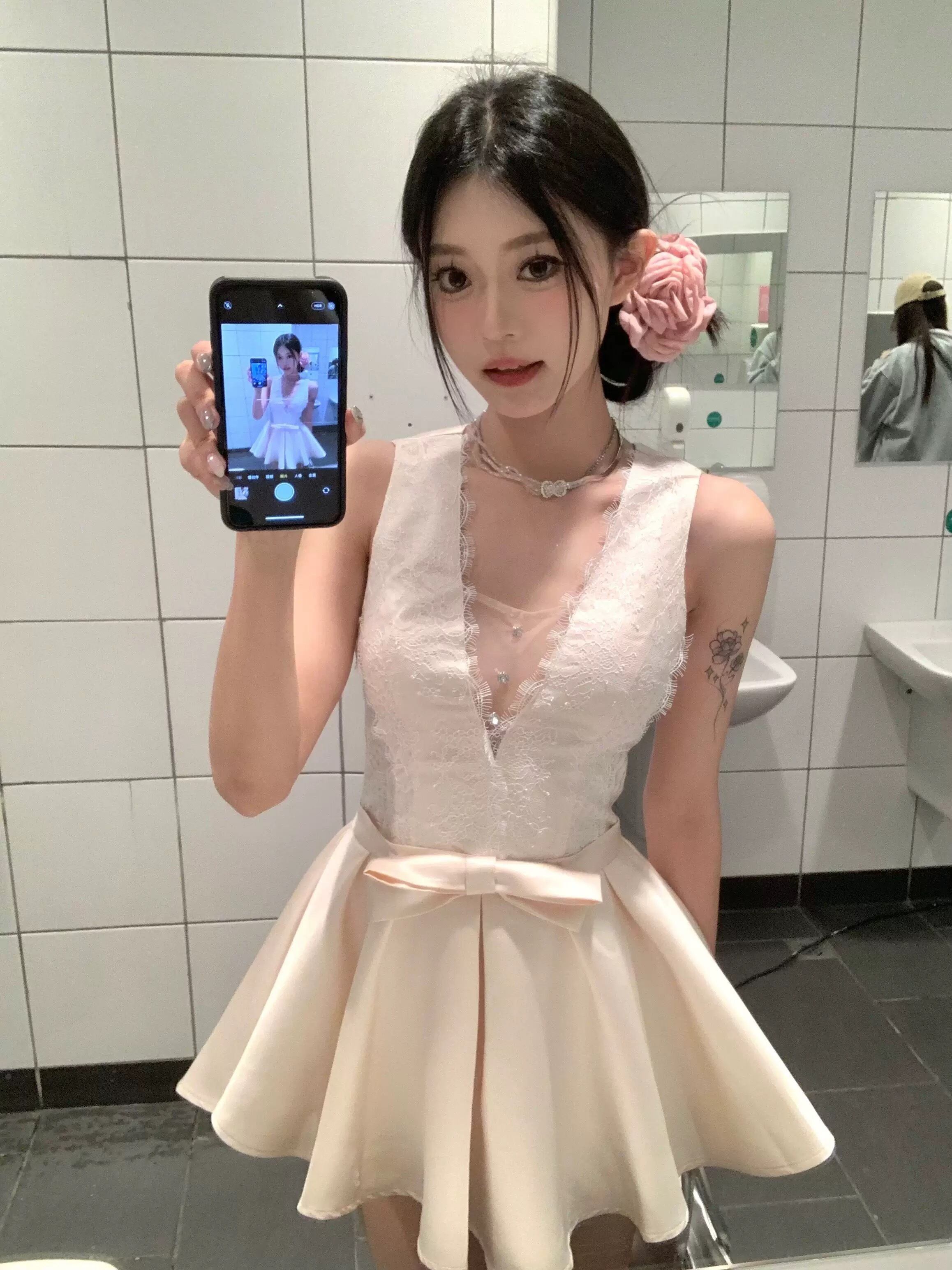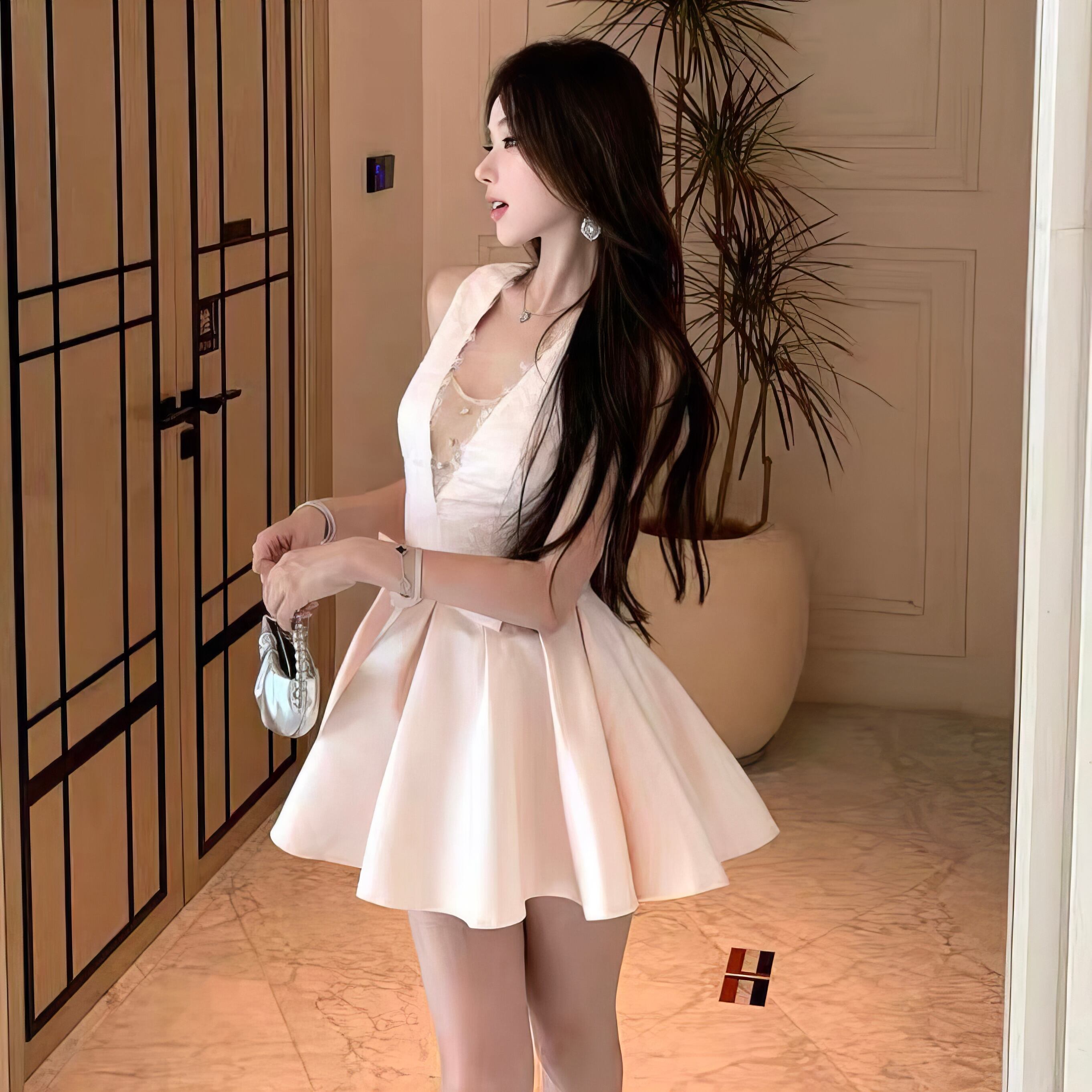 【dress】深Vネックリボン付きレース切り替えワンピース HK0375