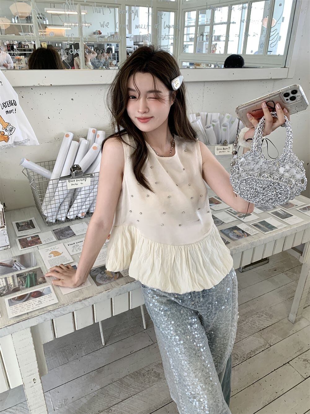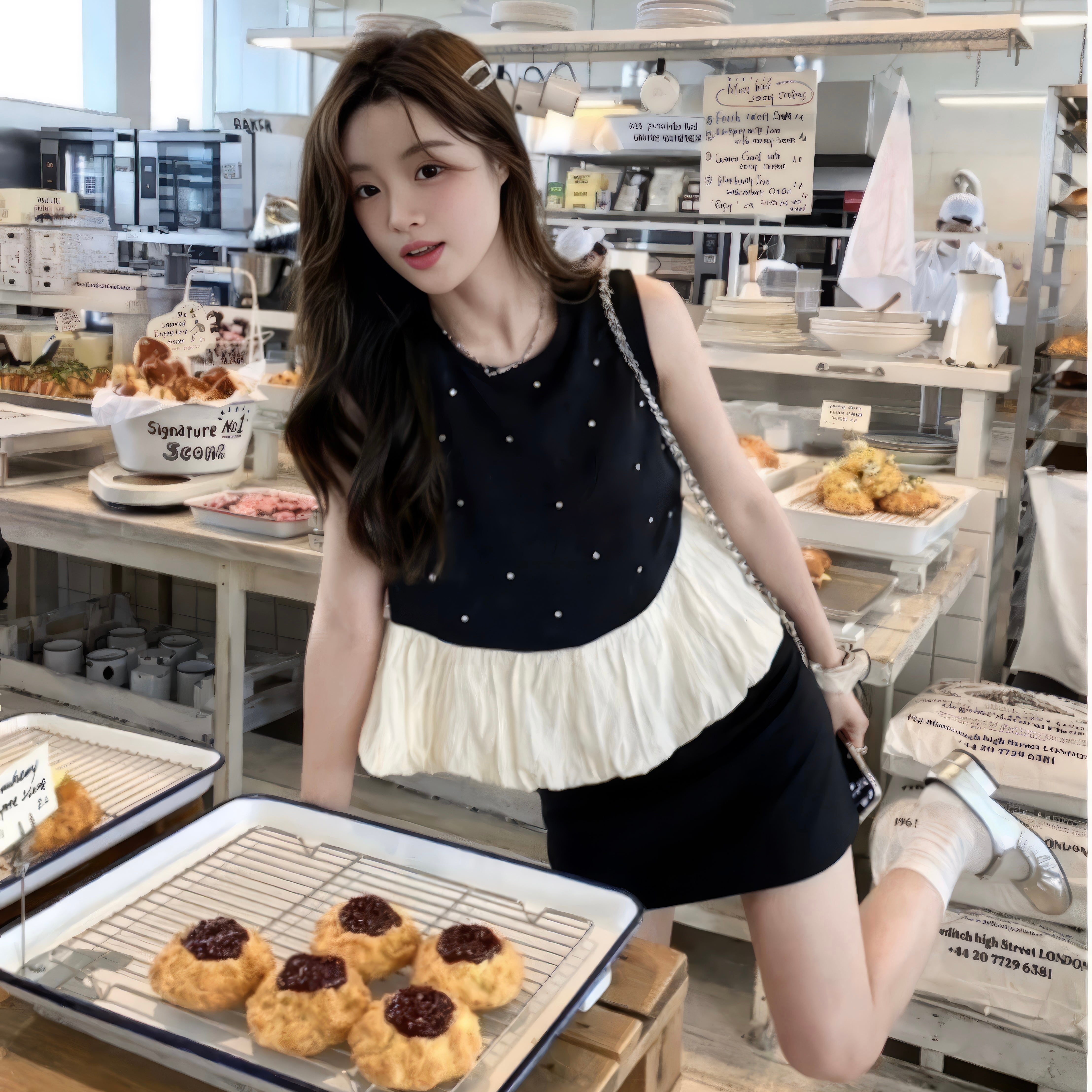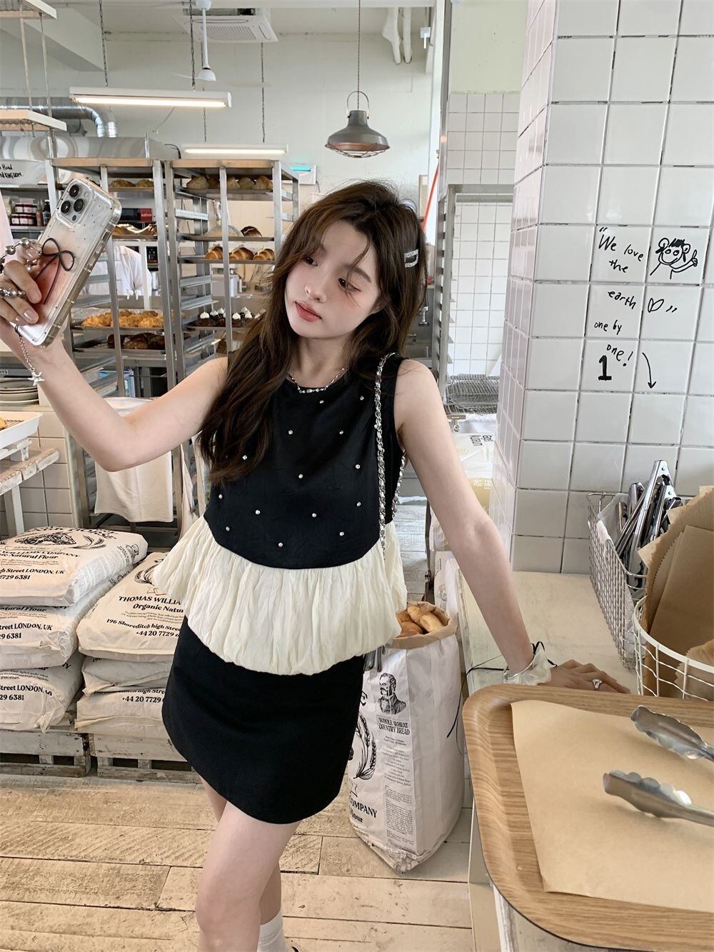 【tops】2色切り替えビジューノースリーブシャツ HK0378