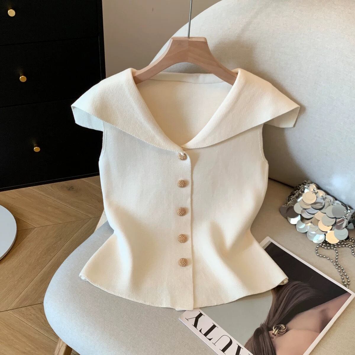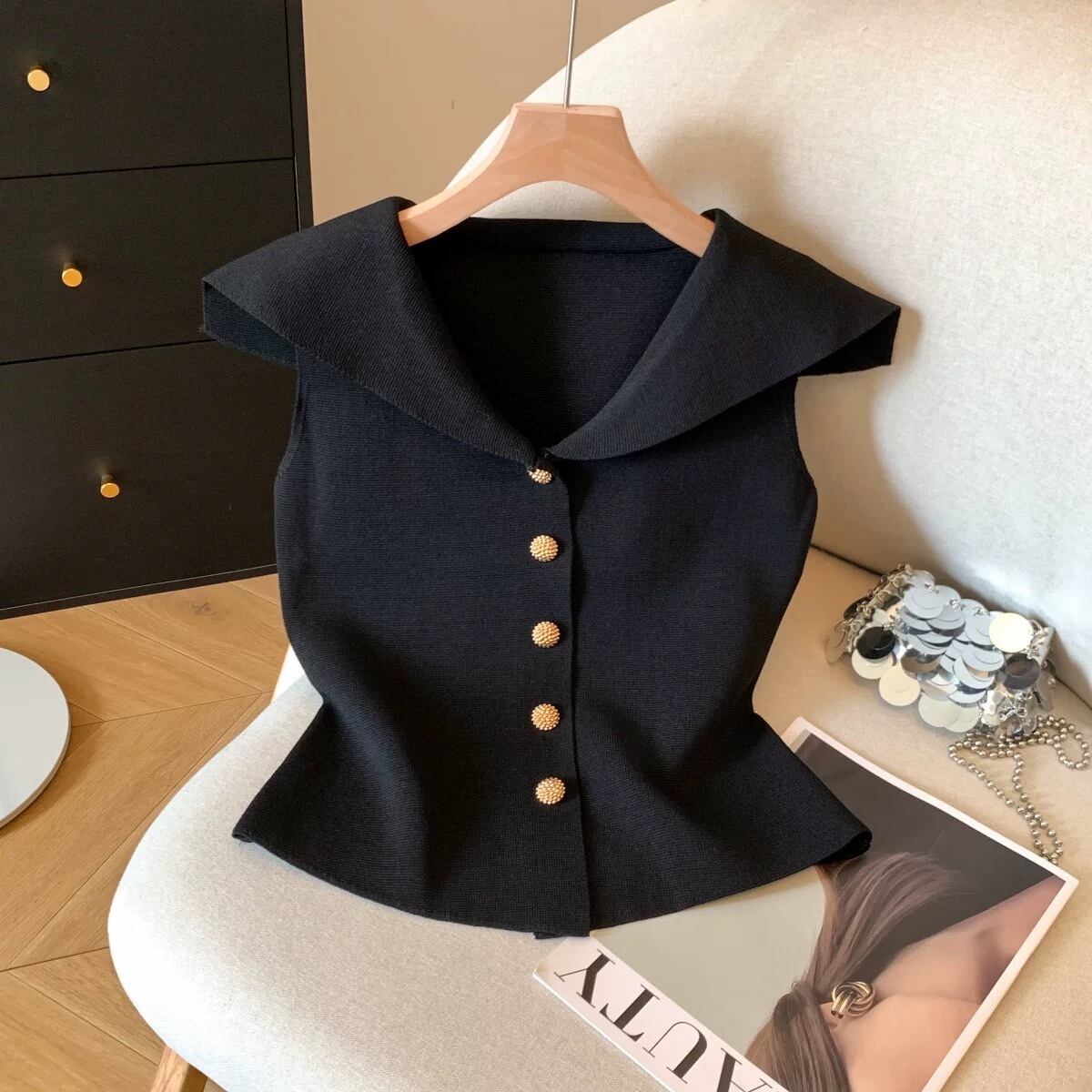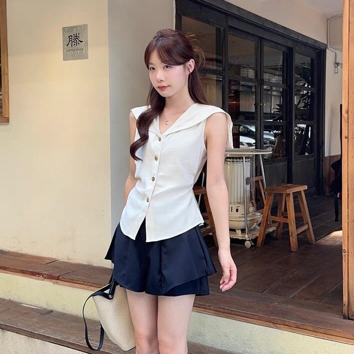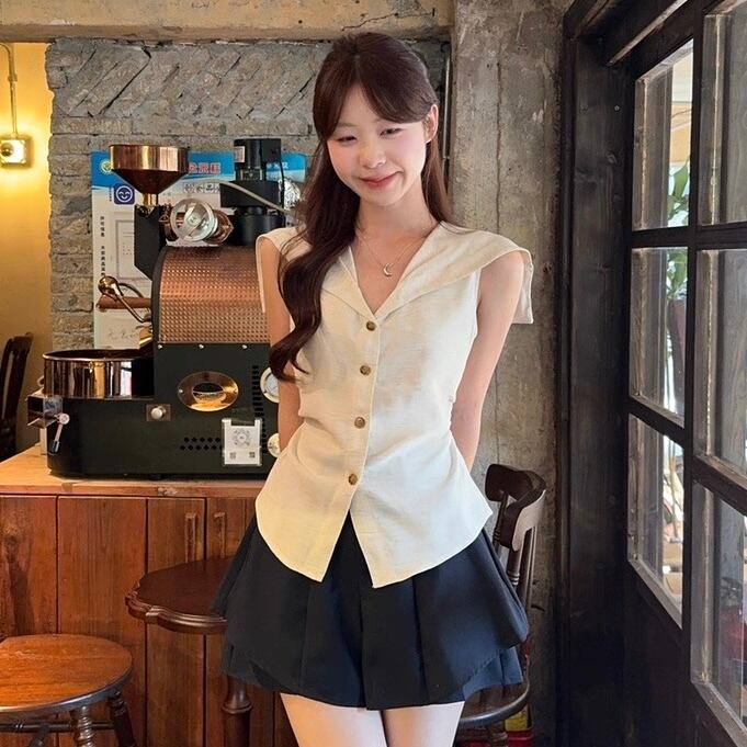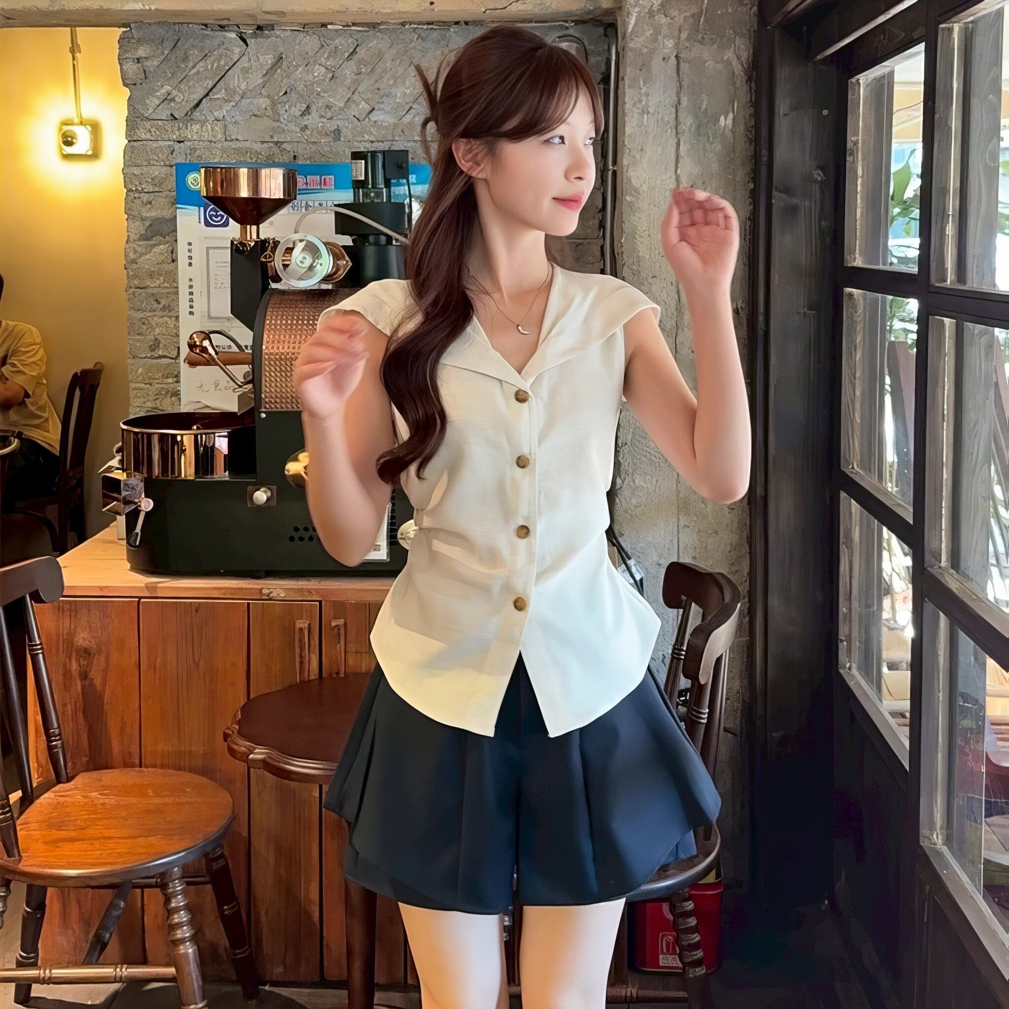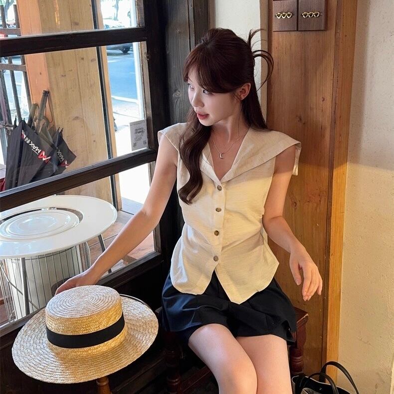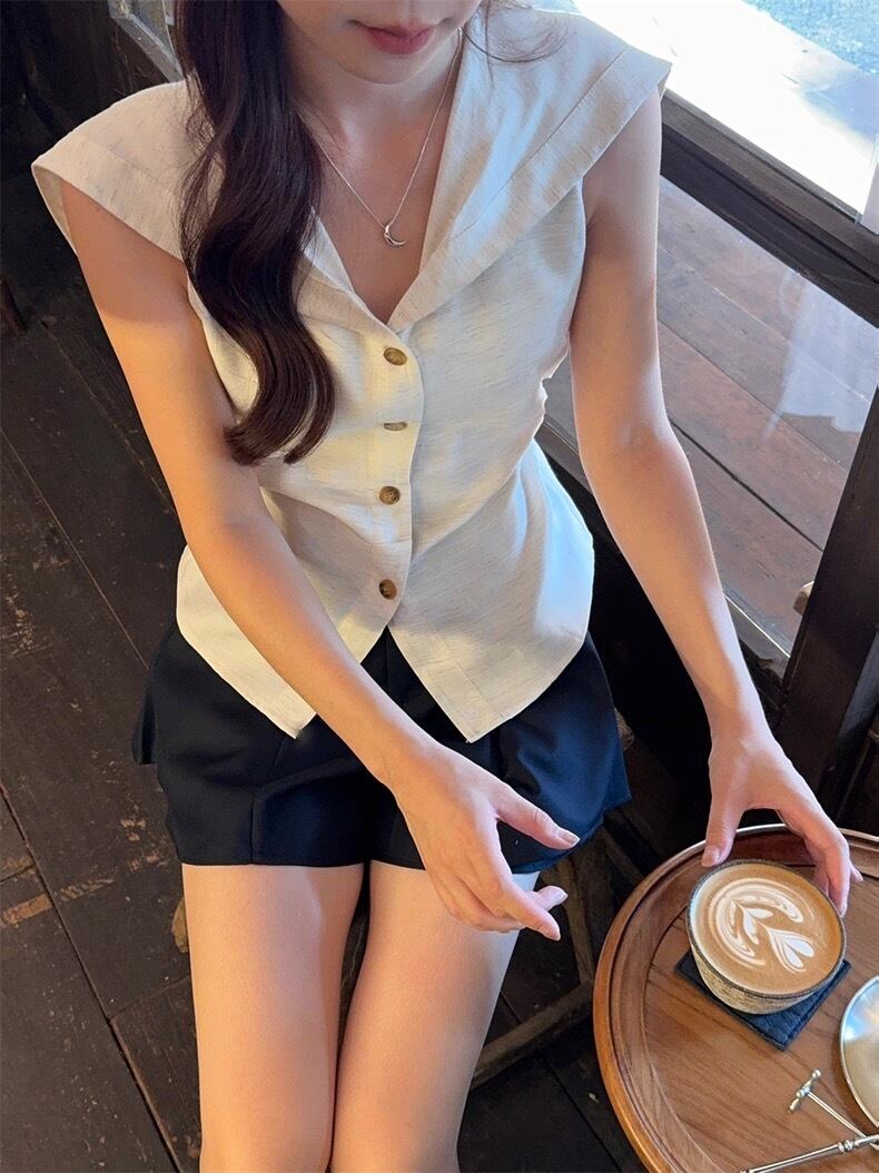 【tops】2色Vネックのノースリーブシャツブラウス HK0379