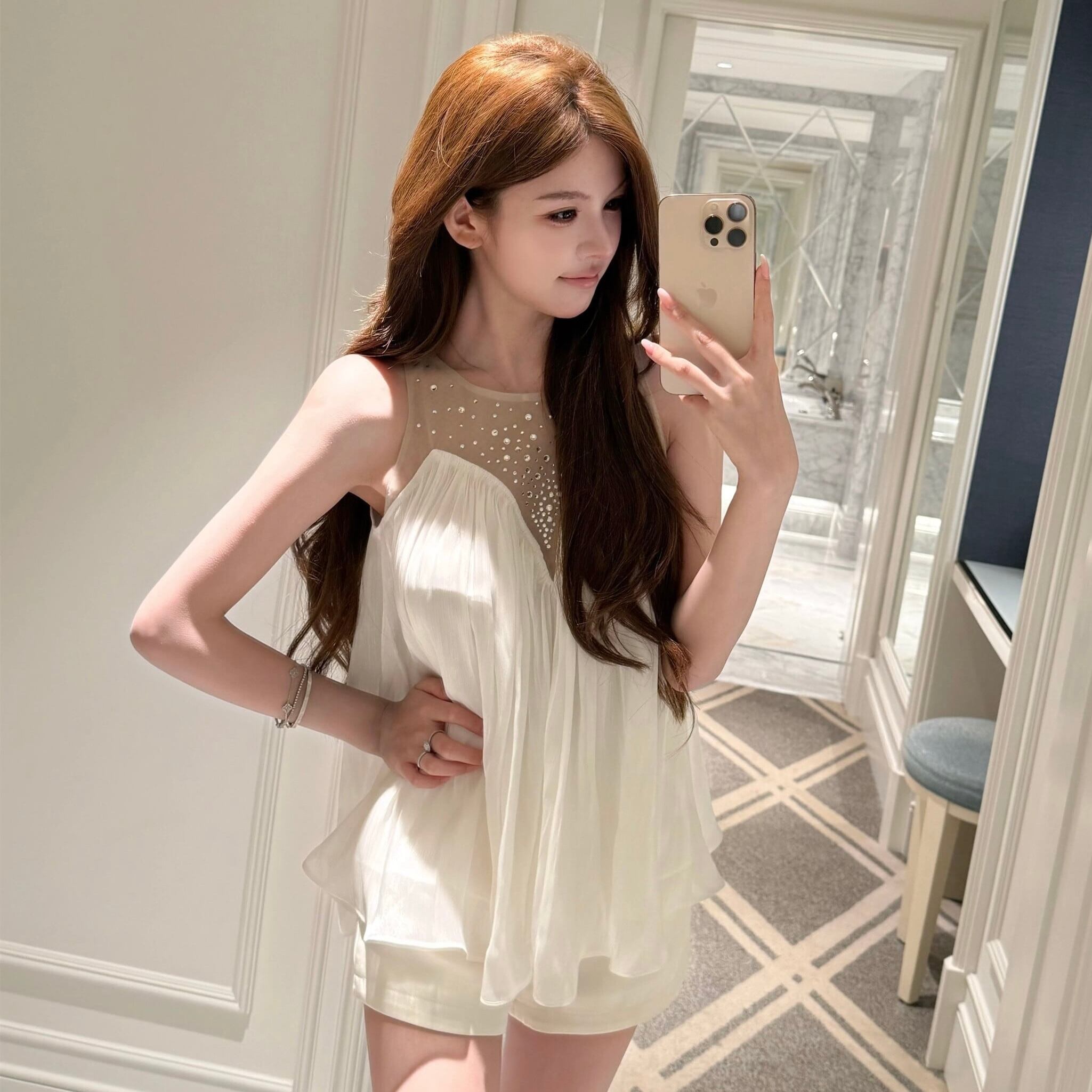【tops】2色ラインストーン付きチュールドッキングトップス HK0389