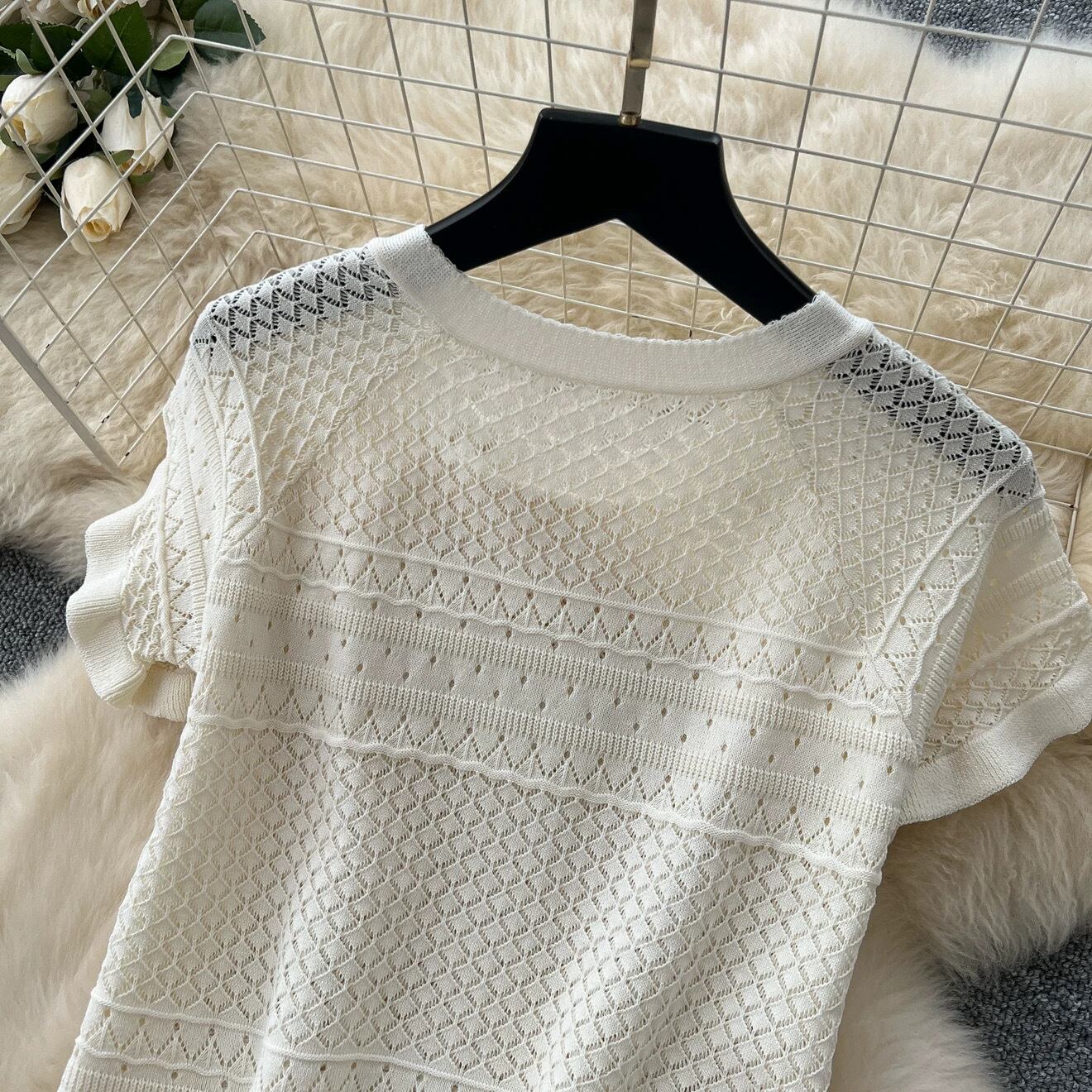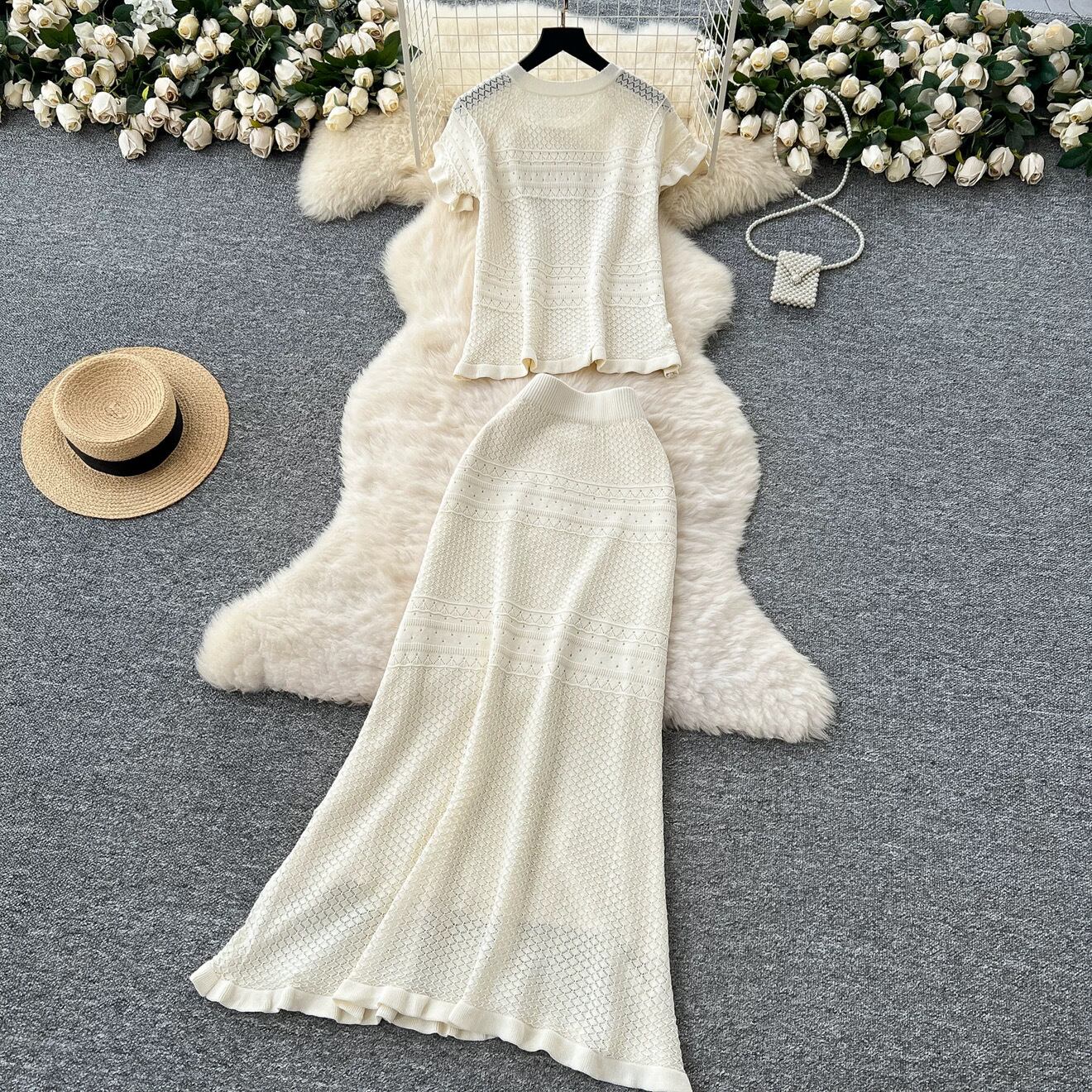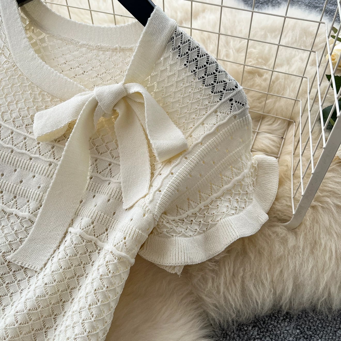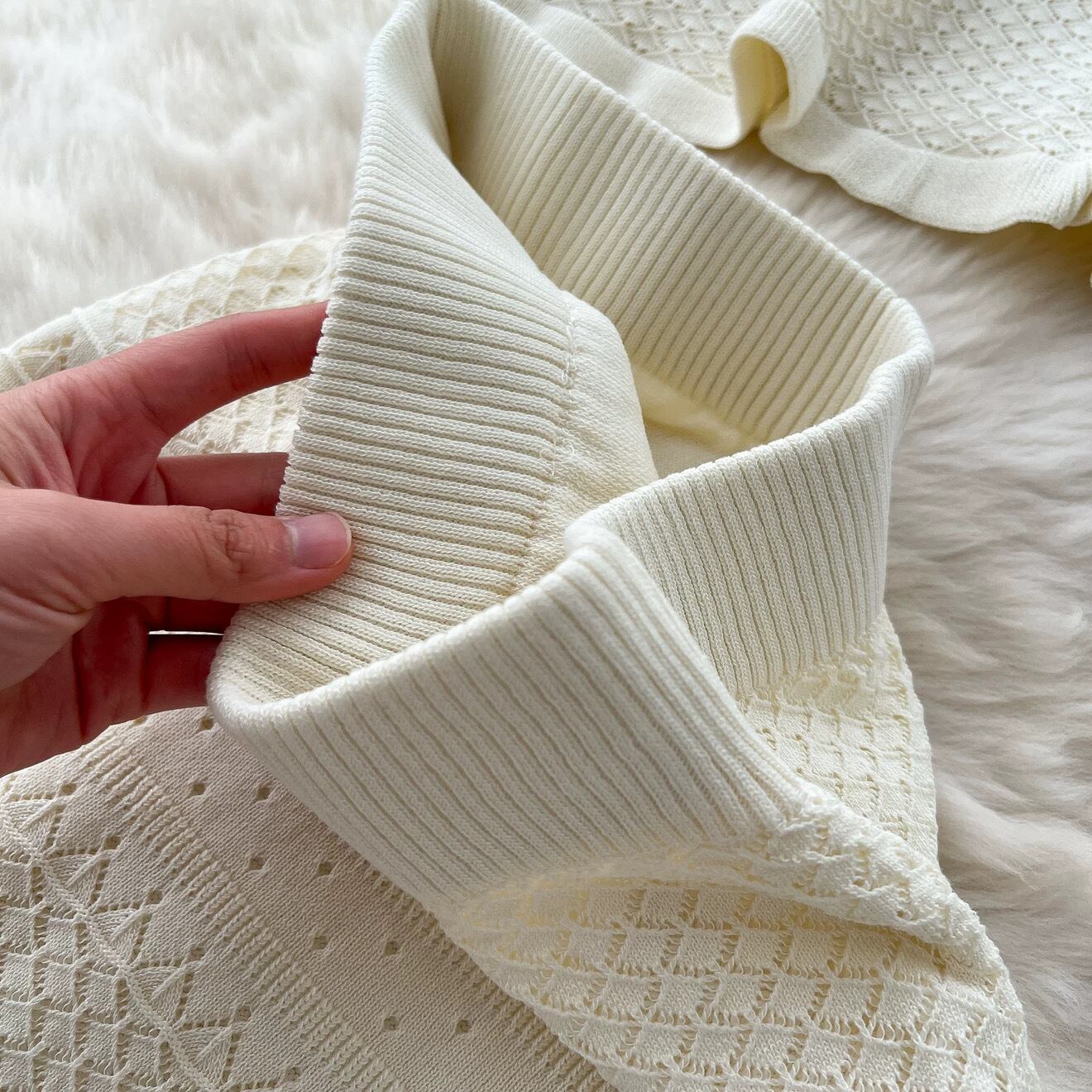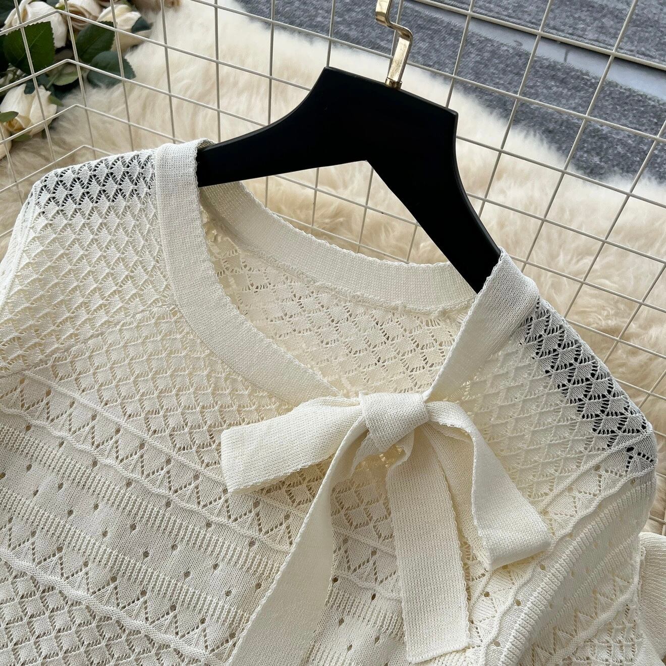 【set】3色透かし編みボウタイトップスxスカート RH4235