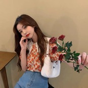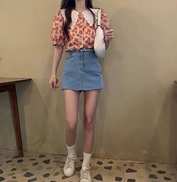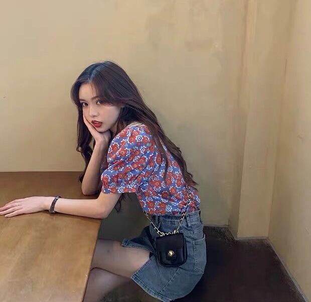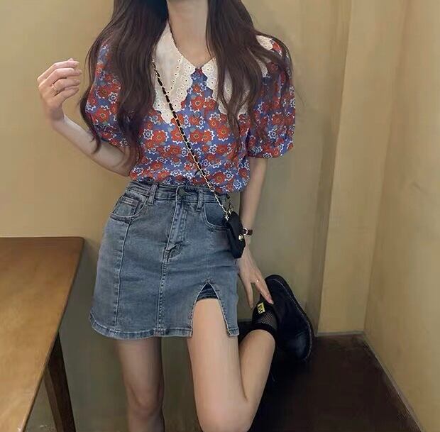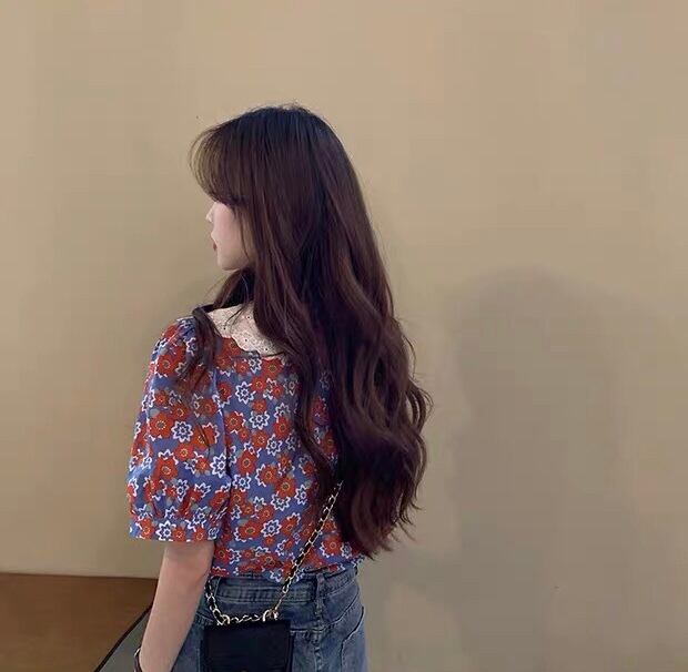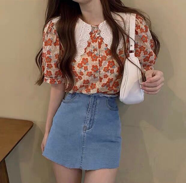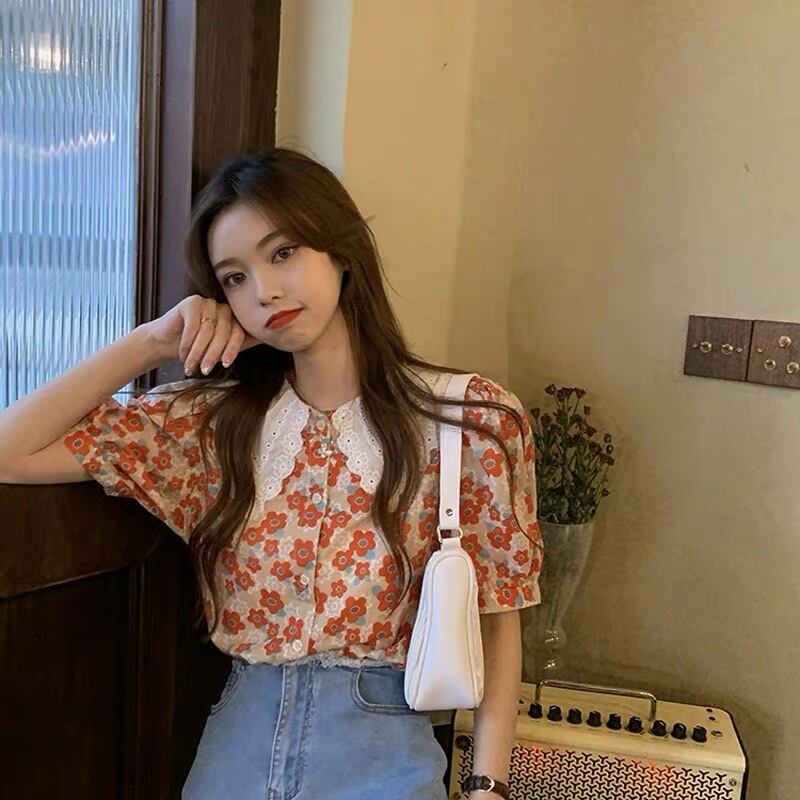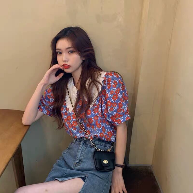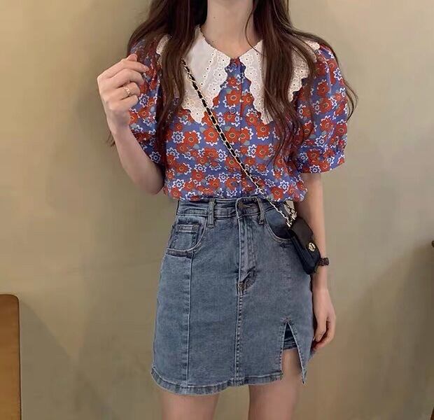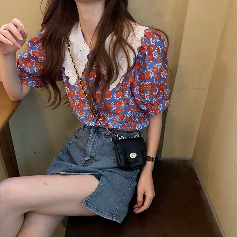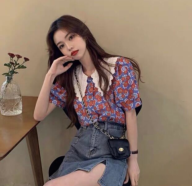 【tops】フリル襟花柄トップス