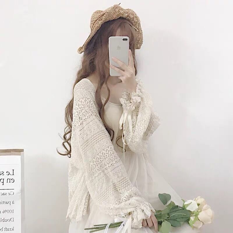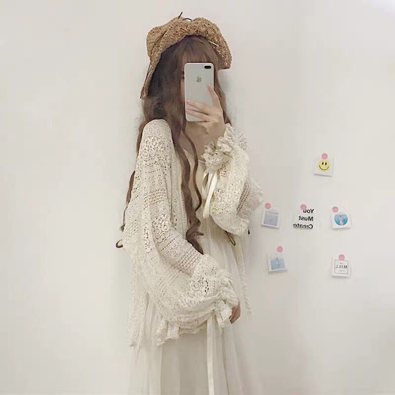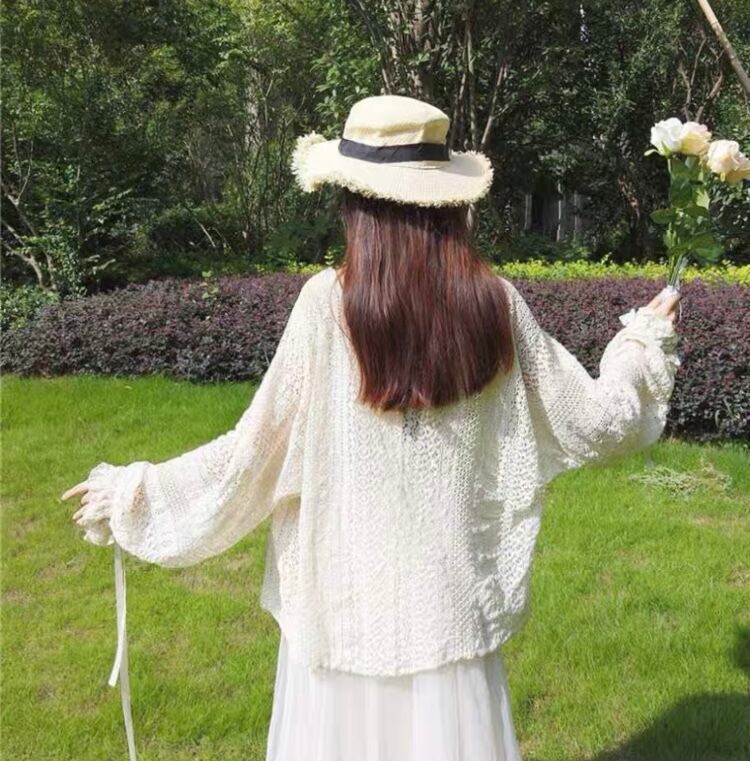 【outer】袖リボン透かし柄カーディガン