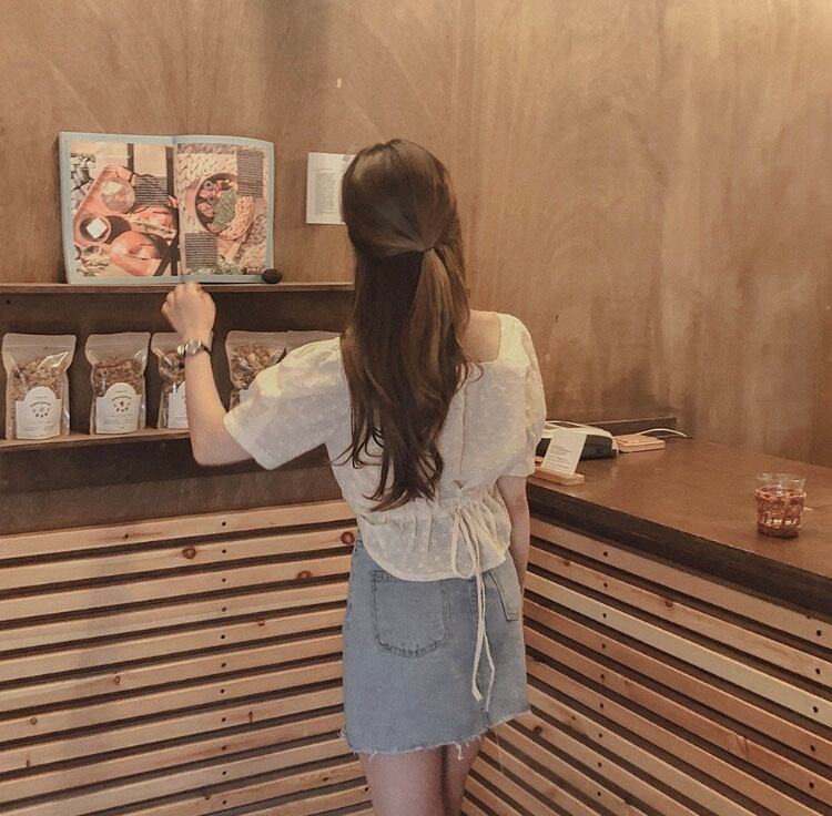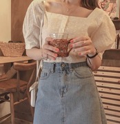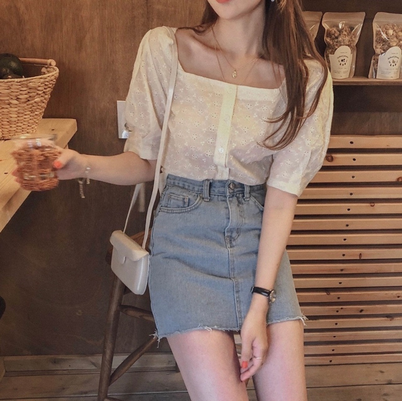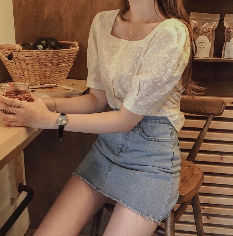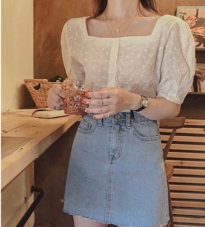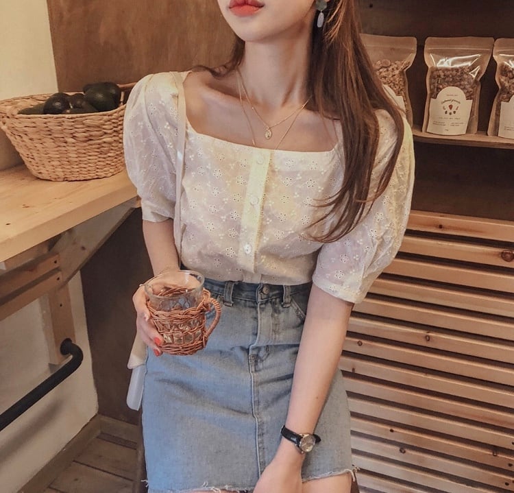 二の腕カバーも叶うパフ袖と、デコルテが綺麗に見えるスクエアネックのトップスです♡
