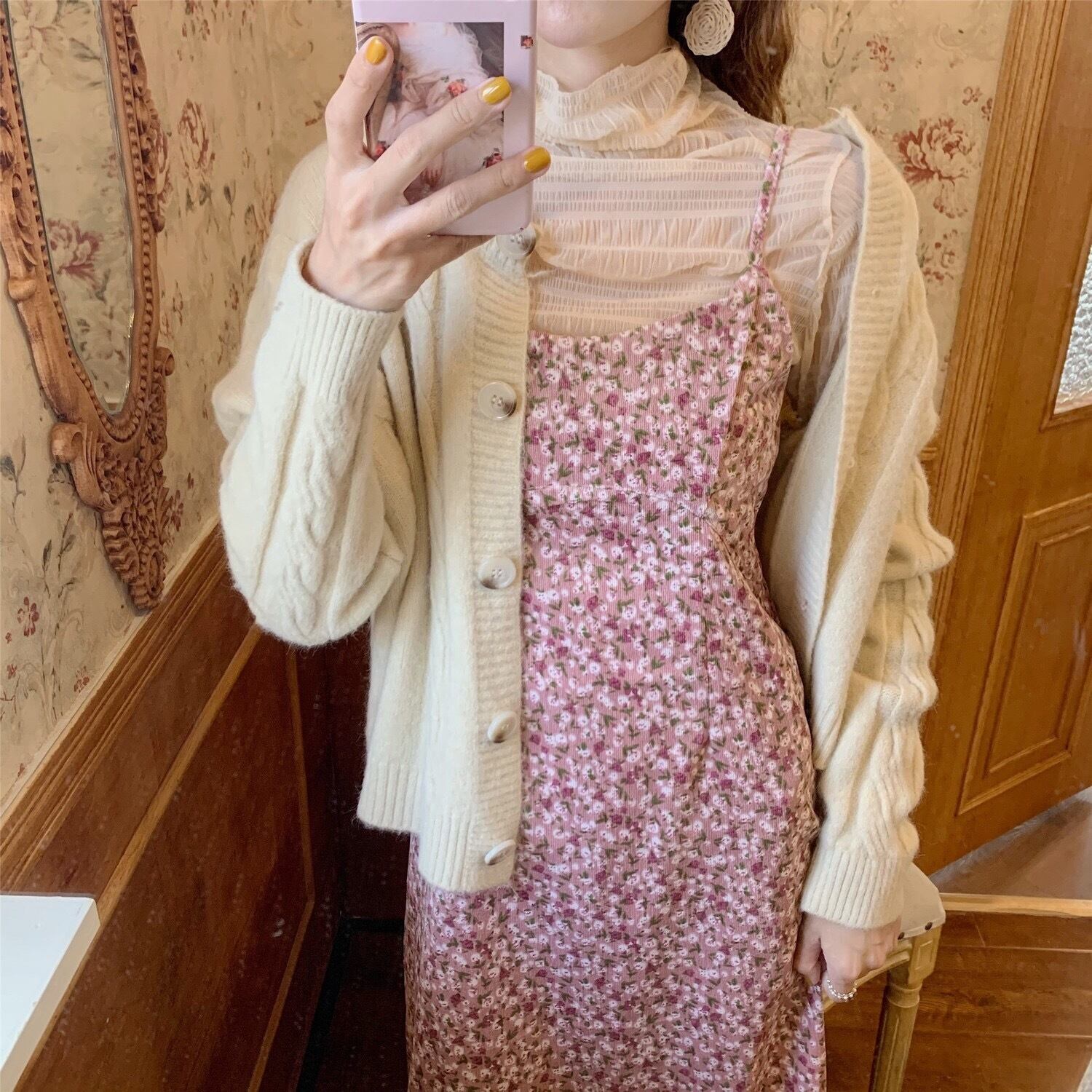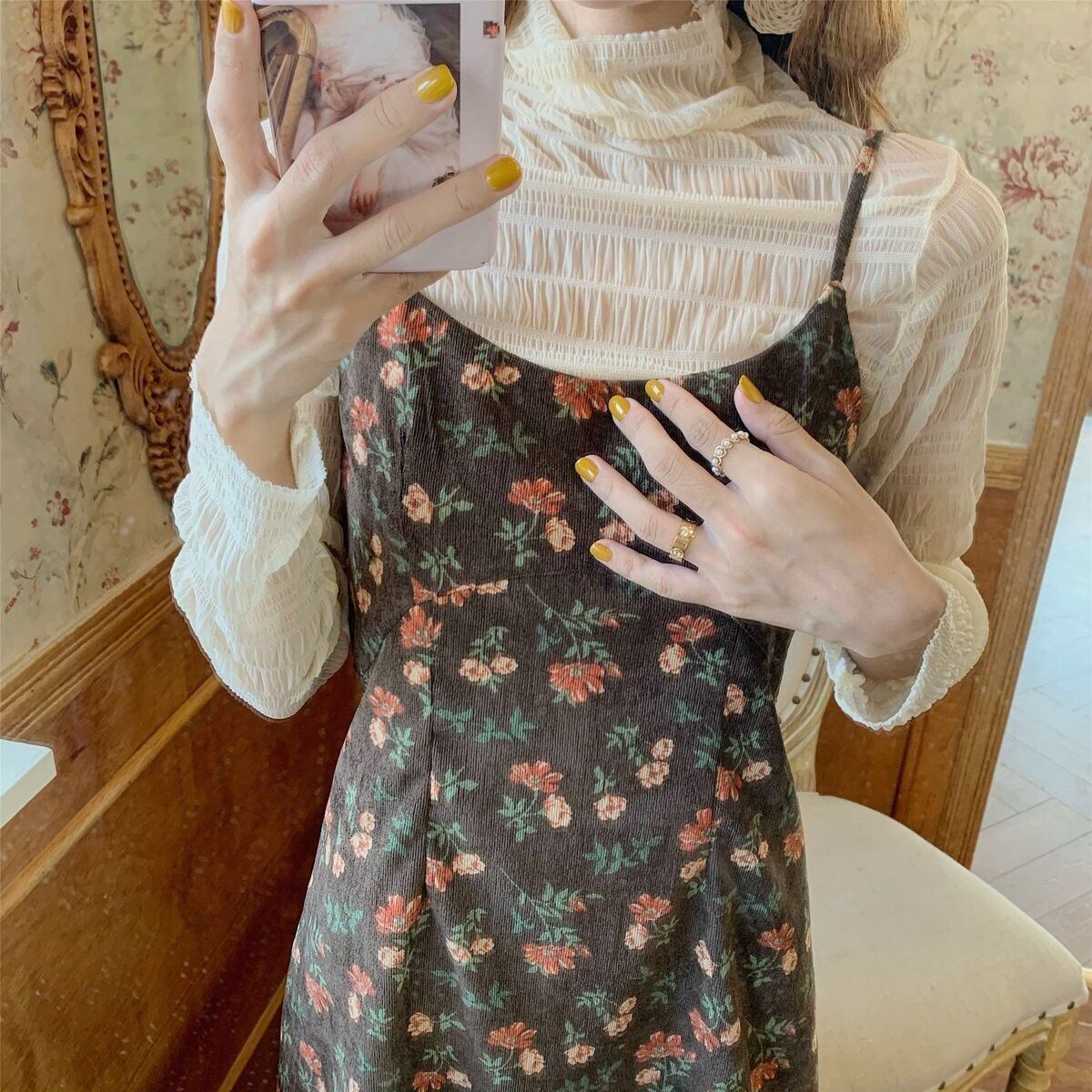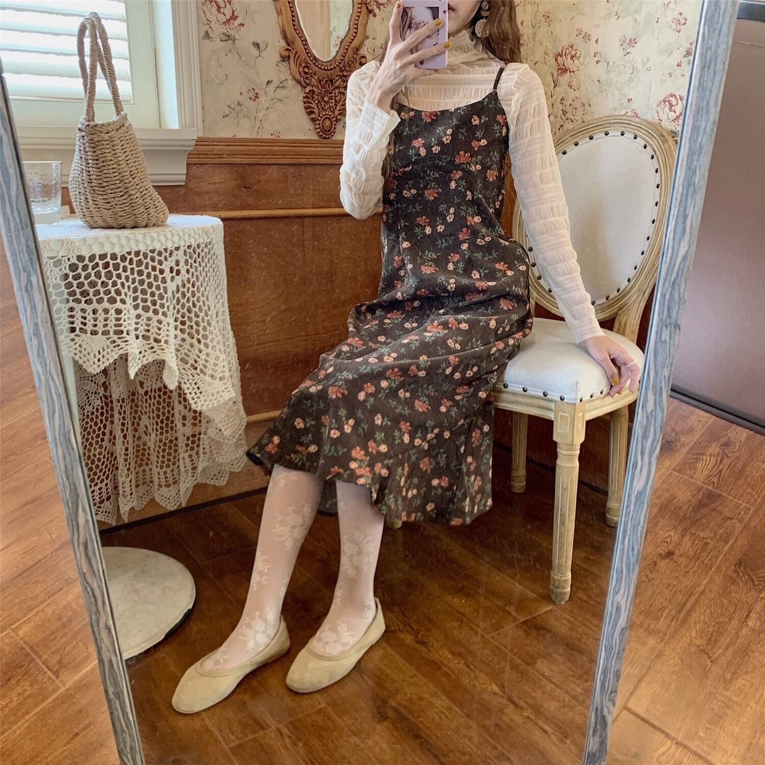 【dress】レトロフラワーフリントコーデュロイキャミワンピース