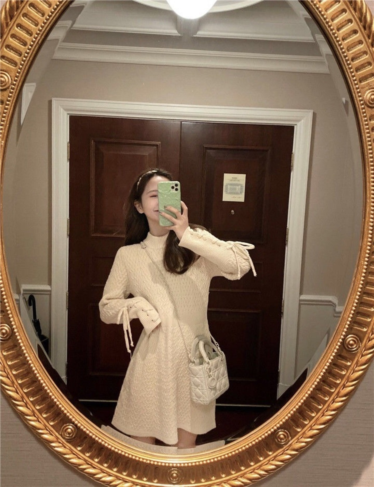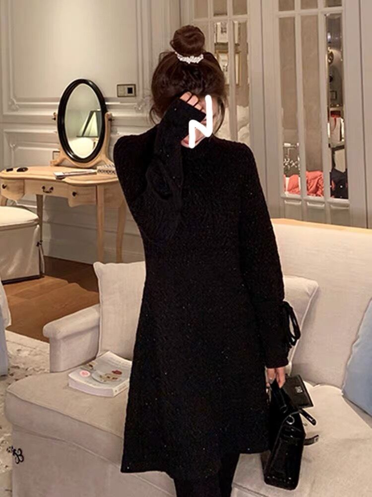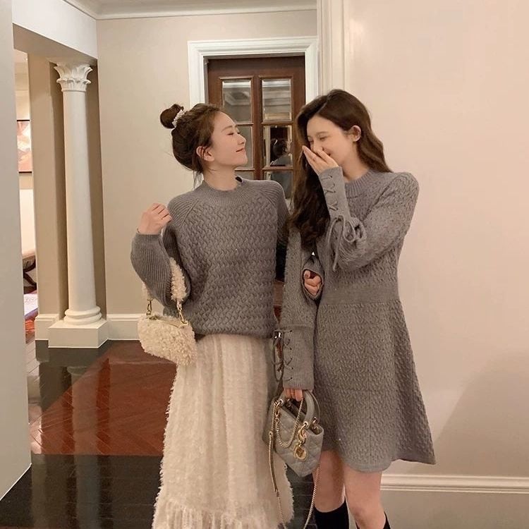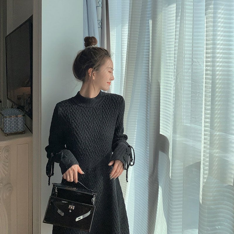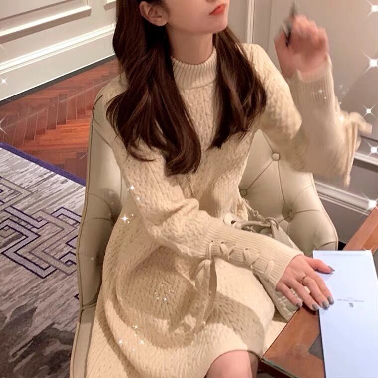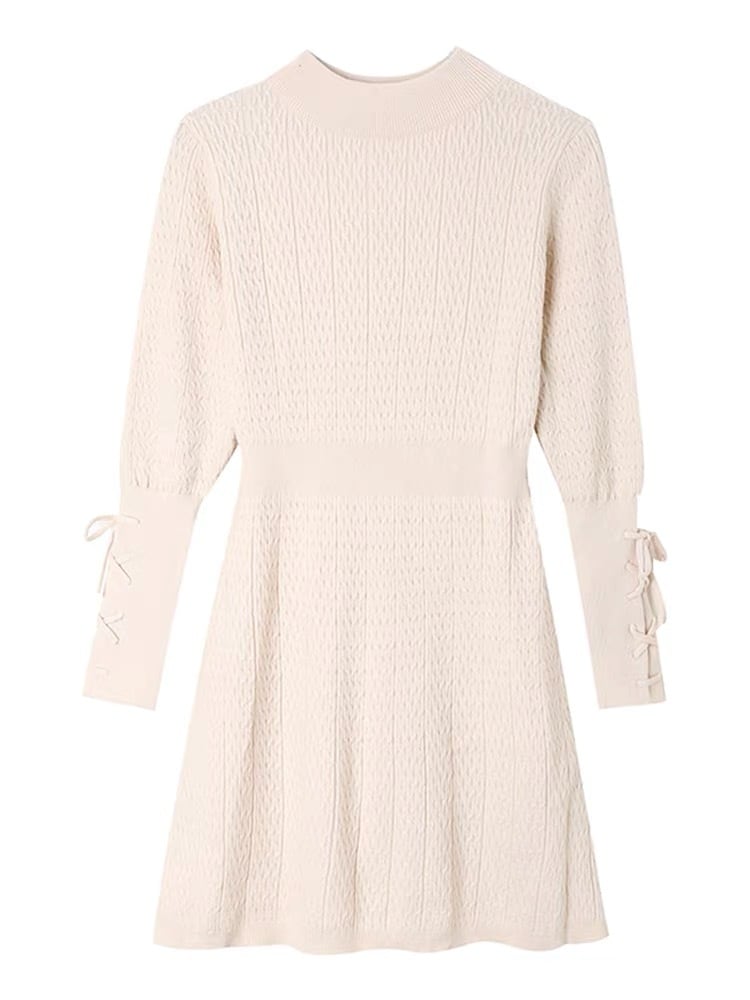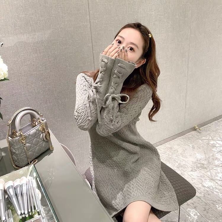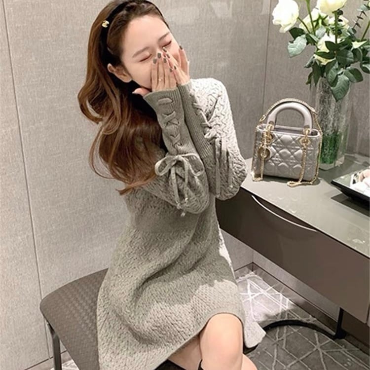 【dress】袖レースアップデザインラウンドネックニットワンピース GB0087