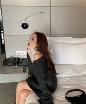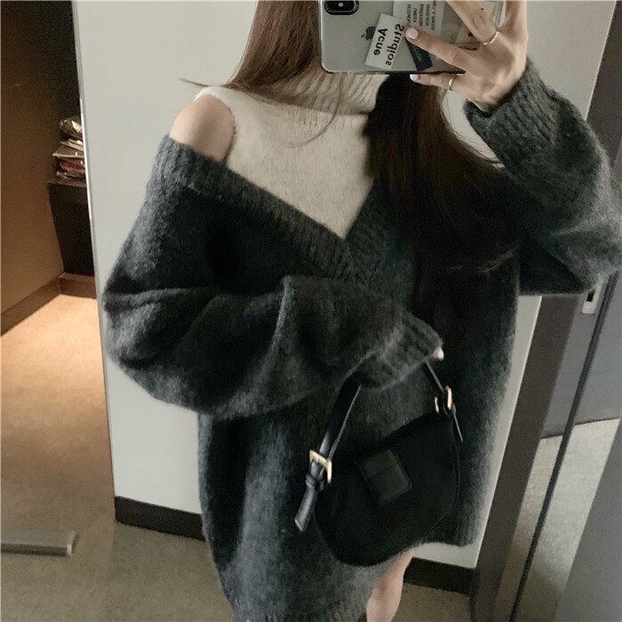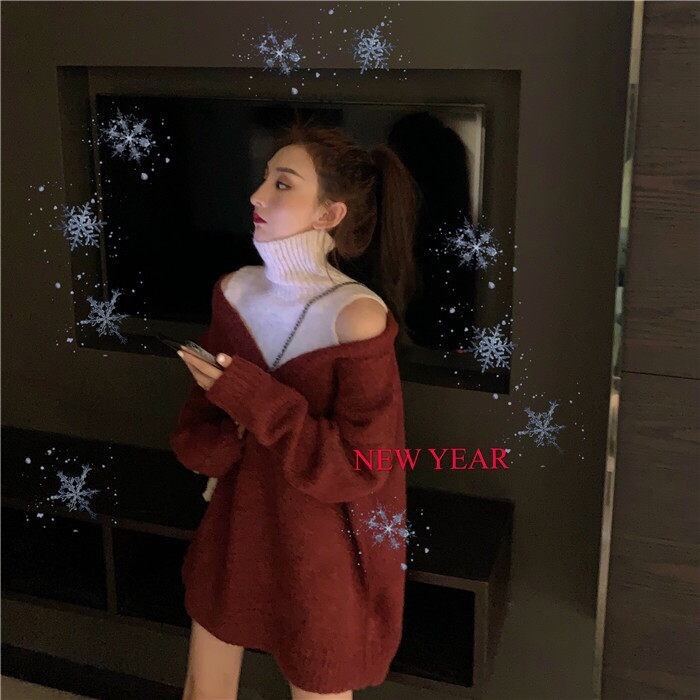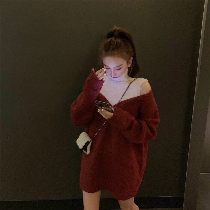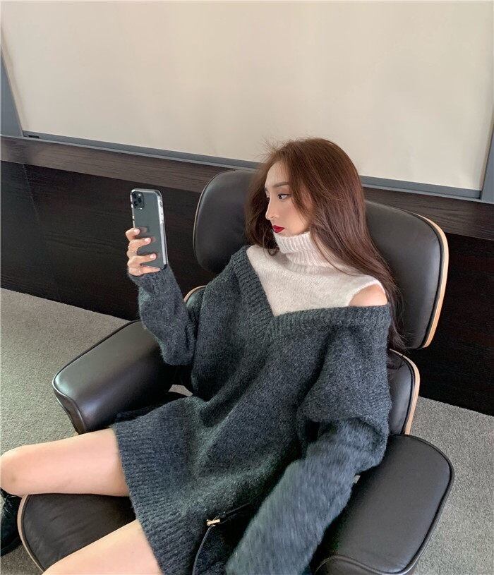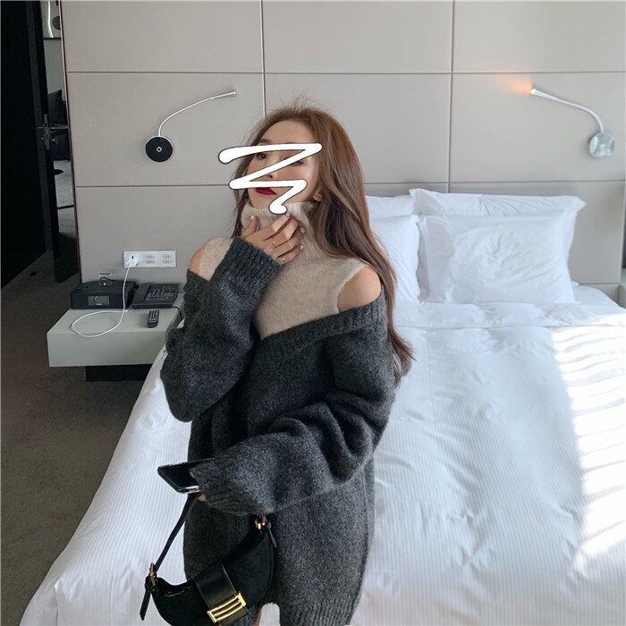 【tops】韓国系レイヤード風肩見せハイネックニットセーター2色 JN008