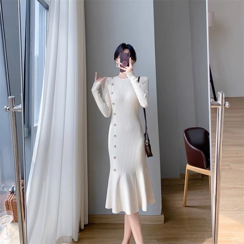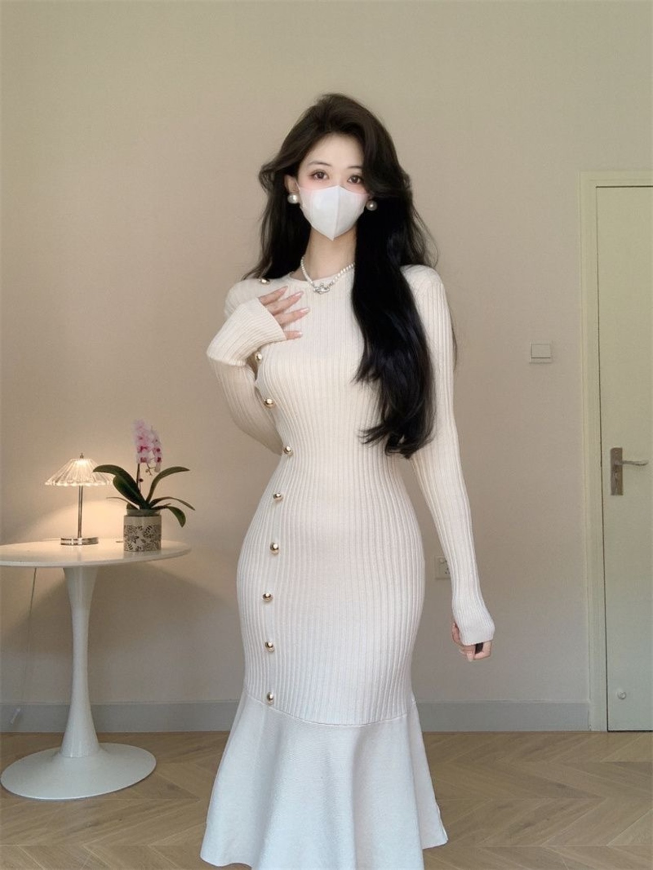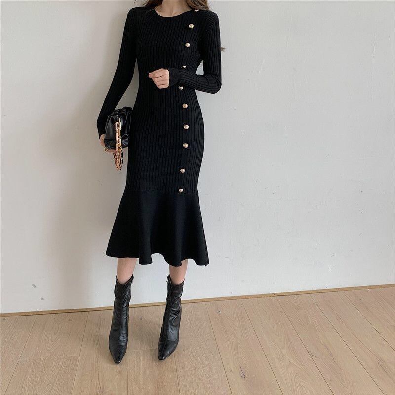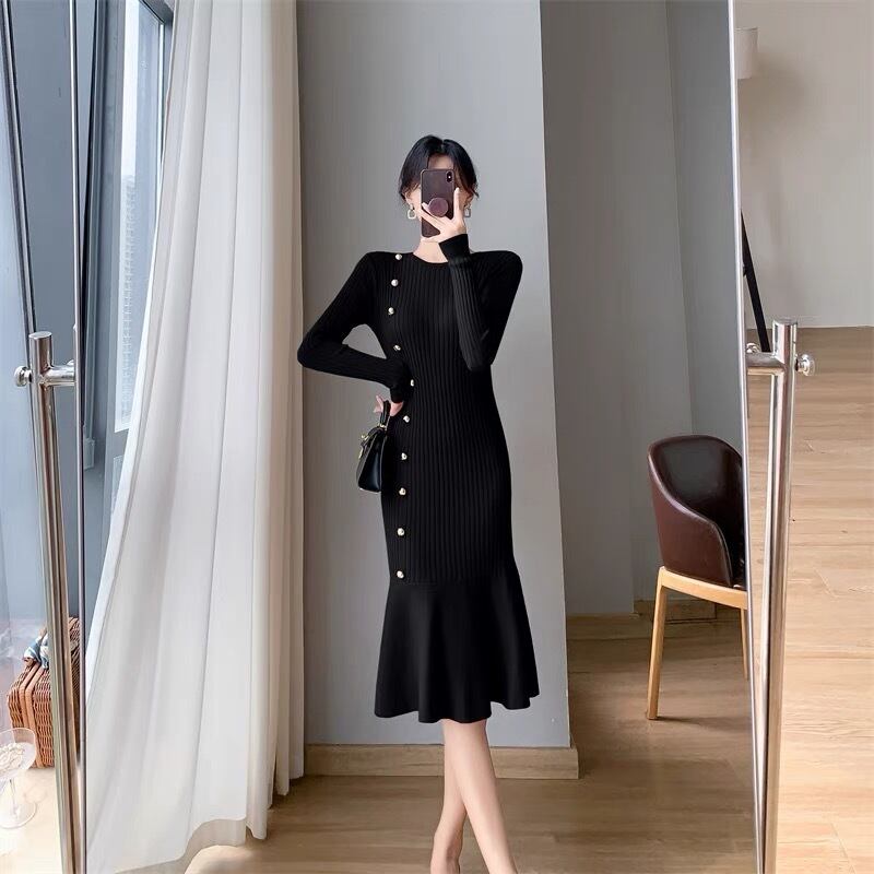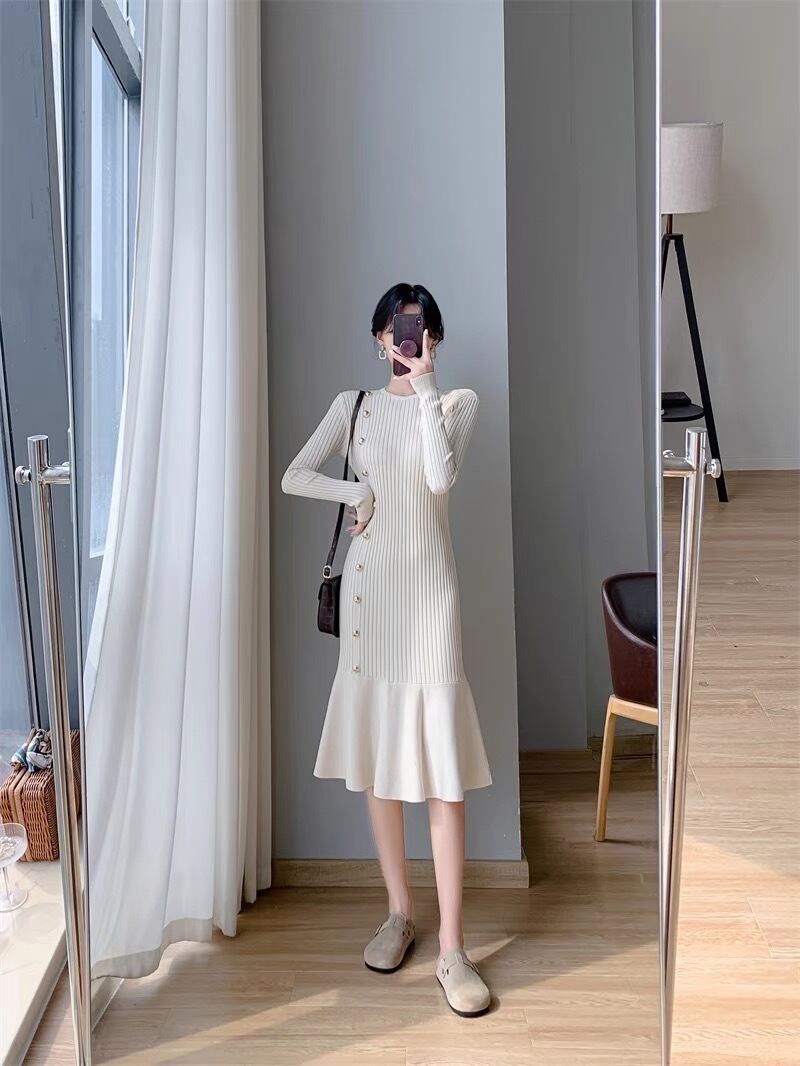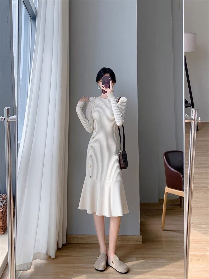 【dress】ボタンデザイン長袖ニットワンピース2色 TK9088