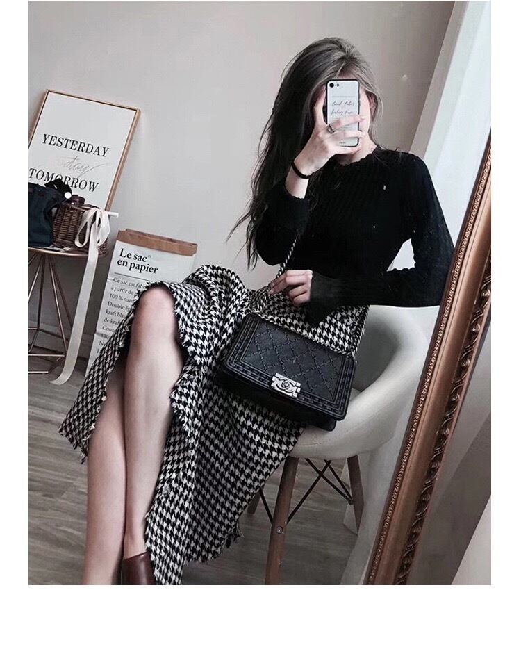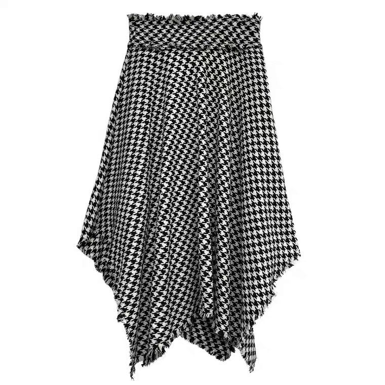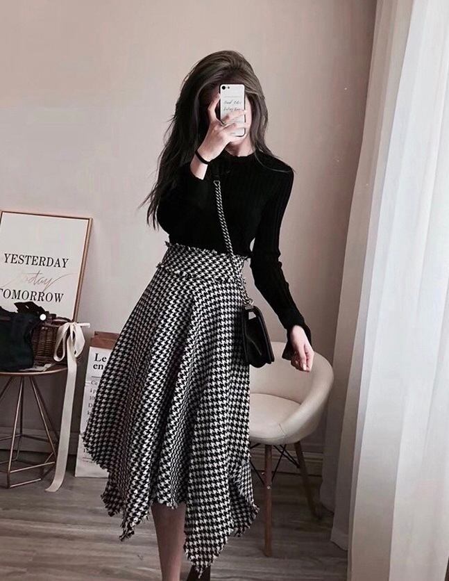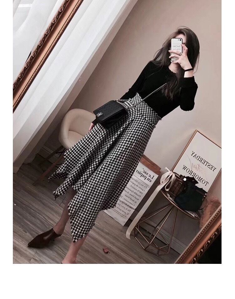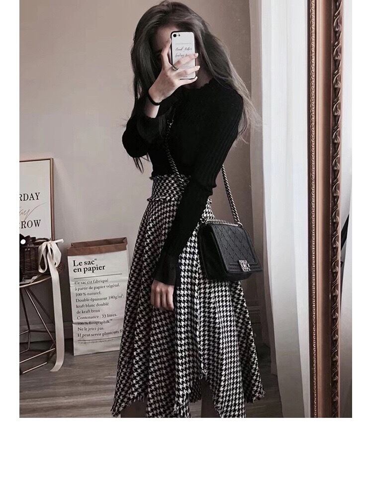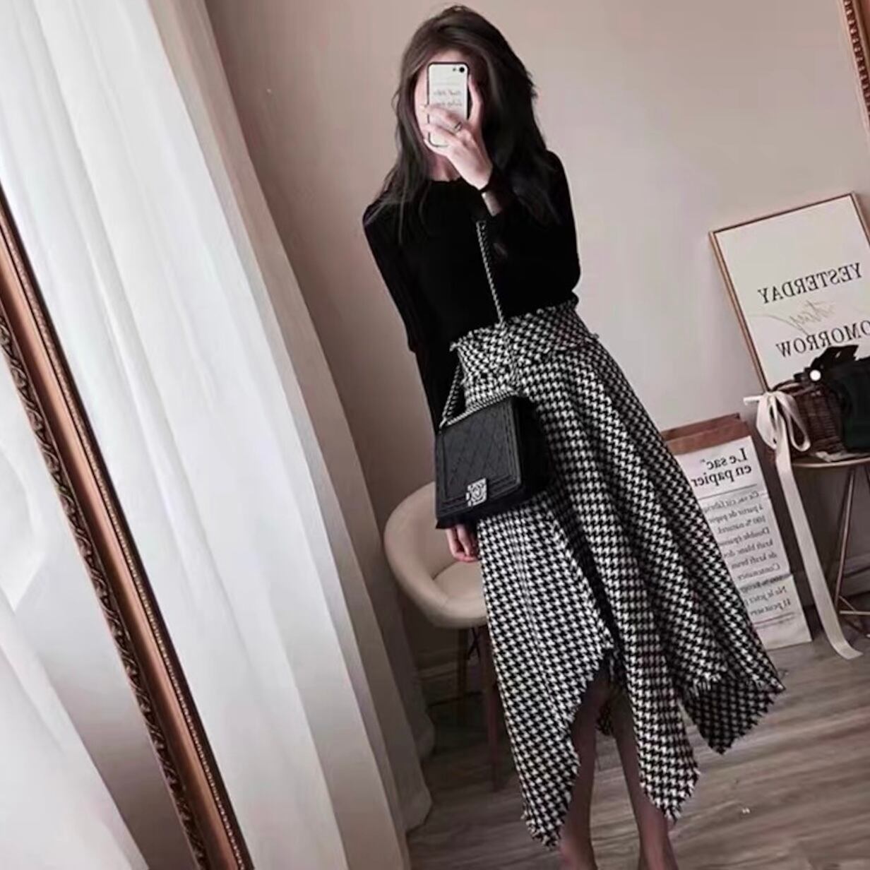 【set】ニットセーターxハイウエスト千鳥柄イレギュラースカート DX1305
