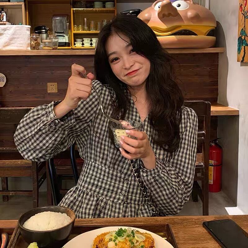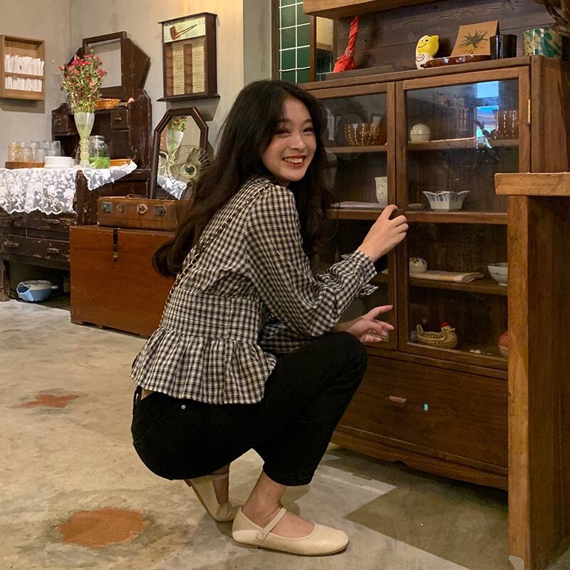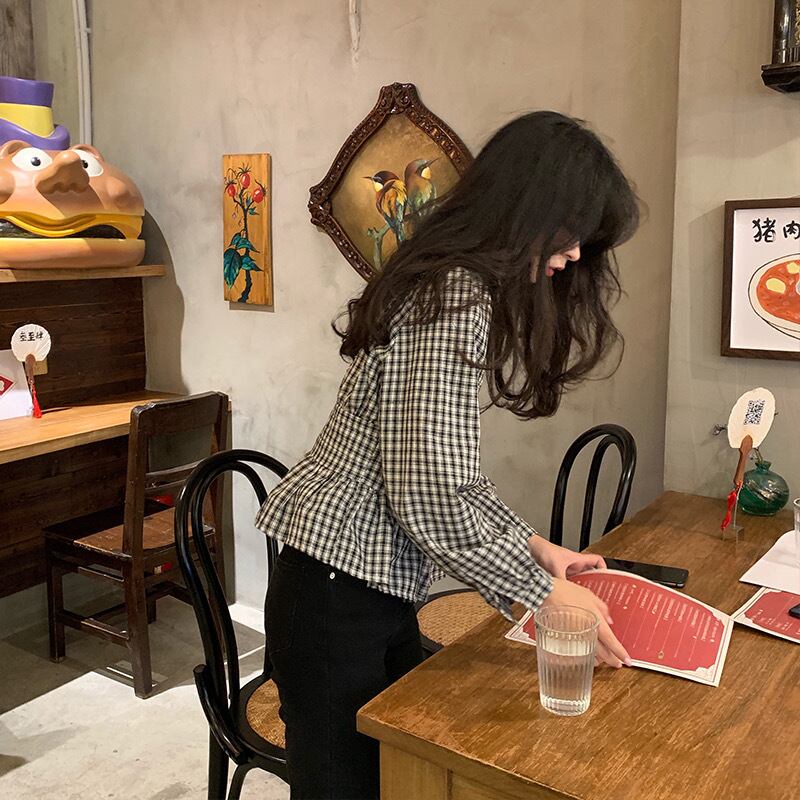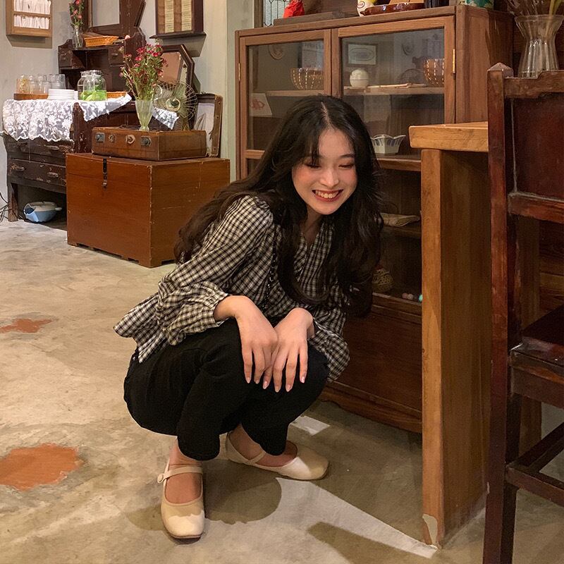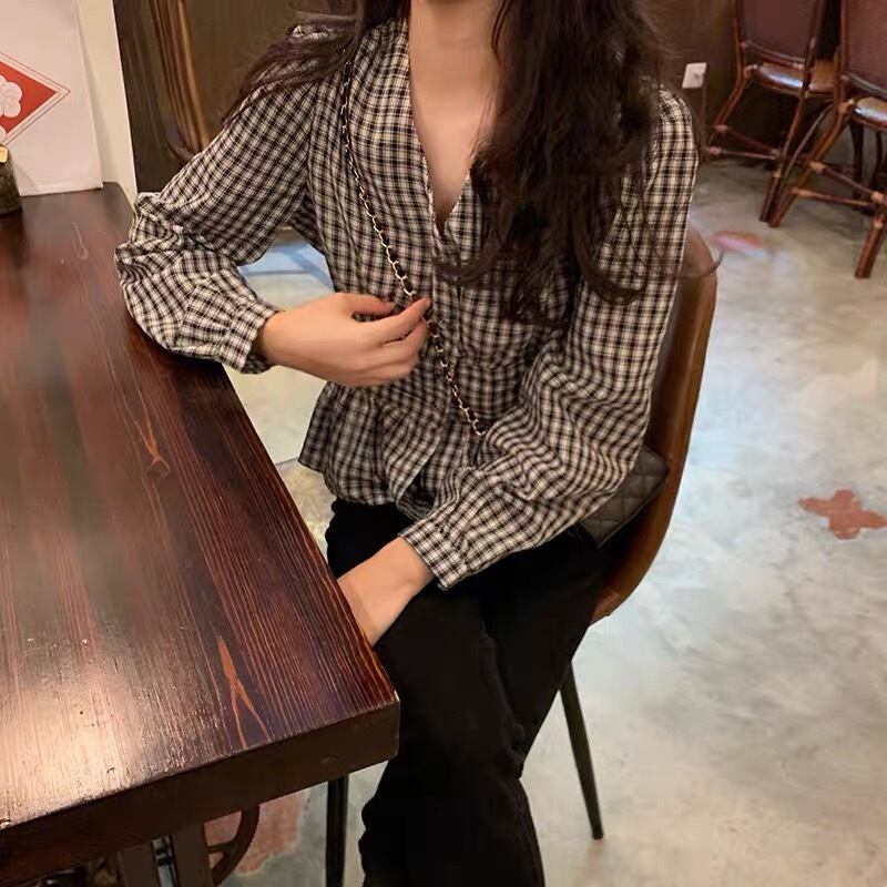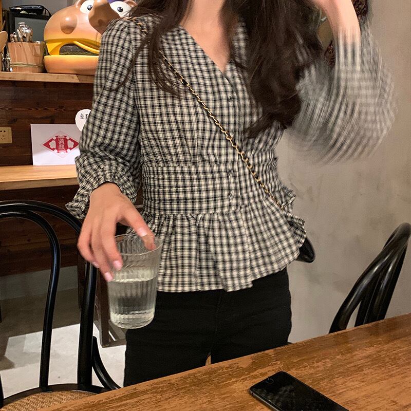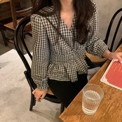 【tops】Vネックギンガム長袖ブラウス