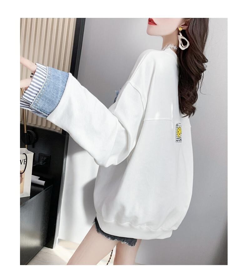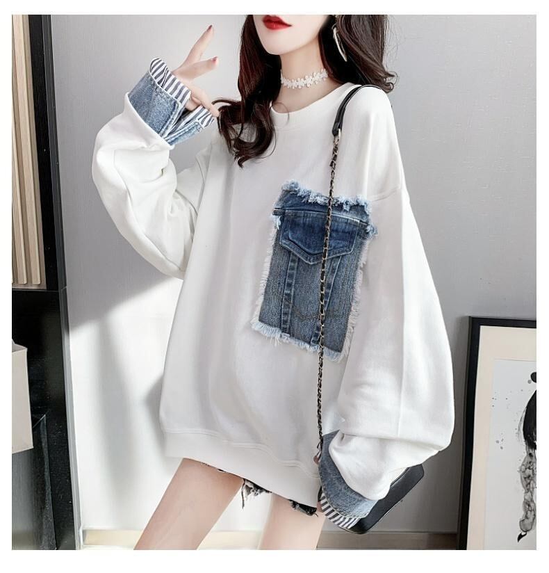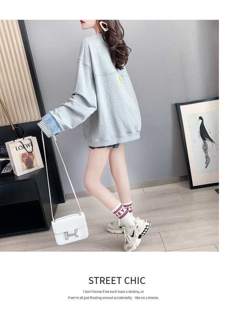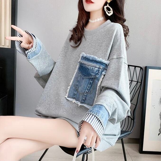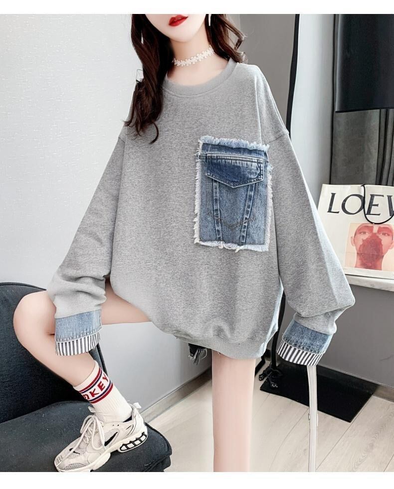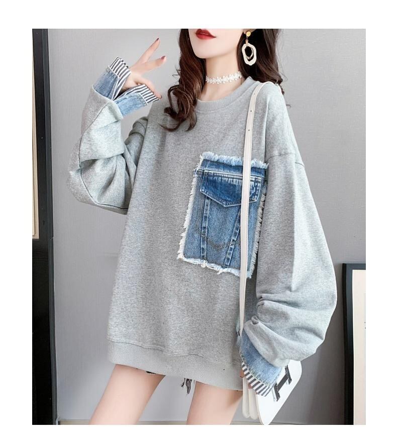 【tops】ラウンドネックデニム切り替え長袖パーカー2色