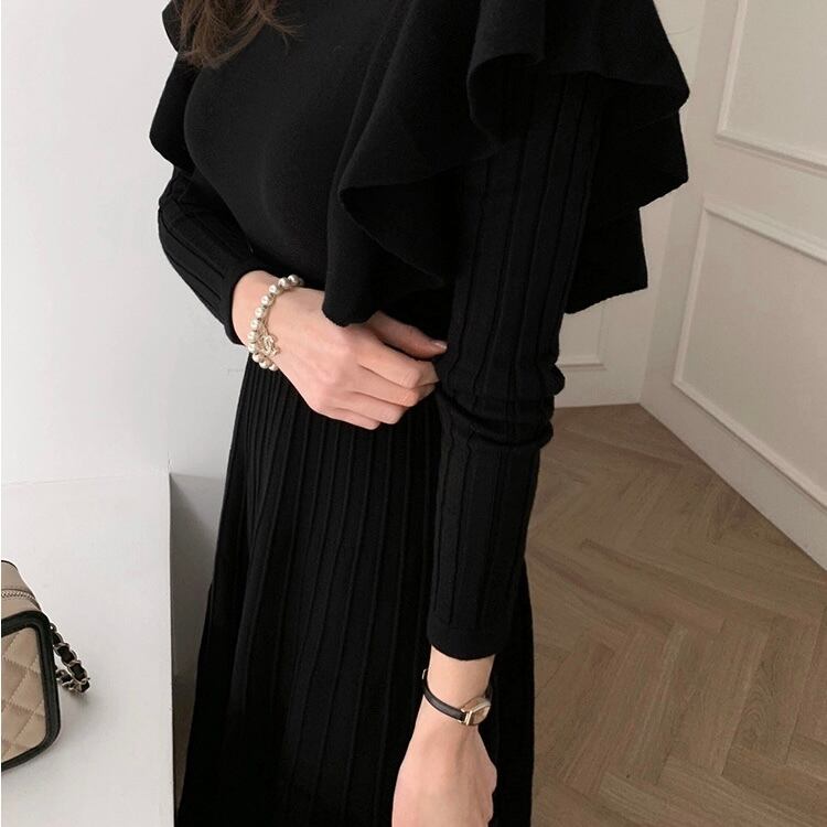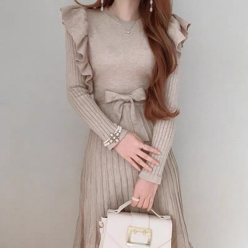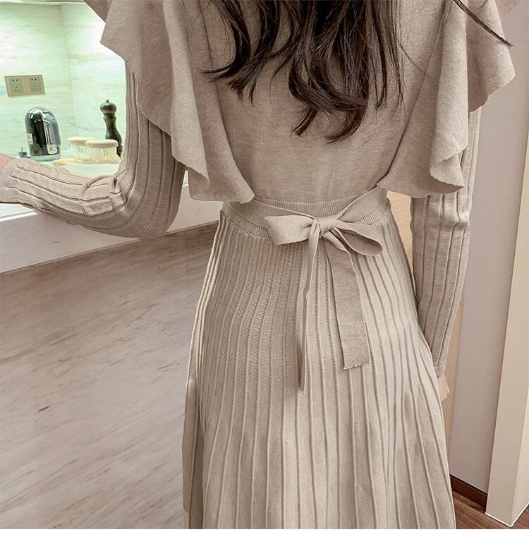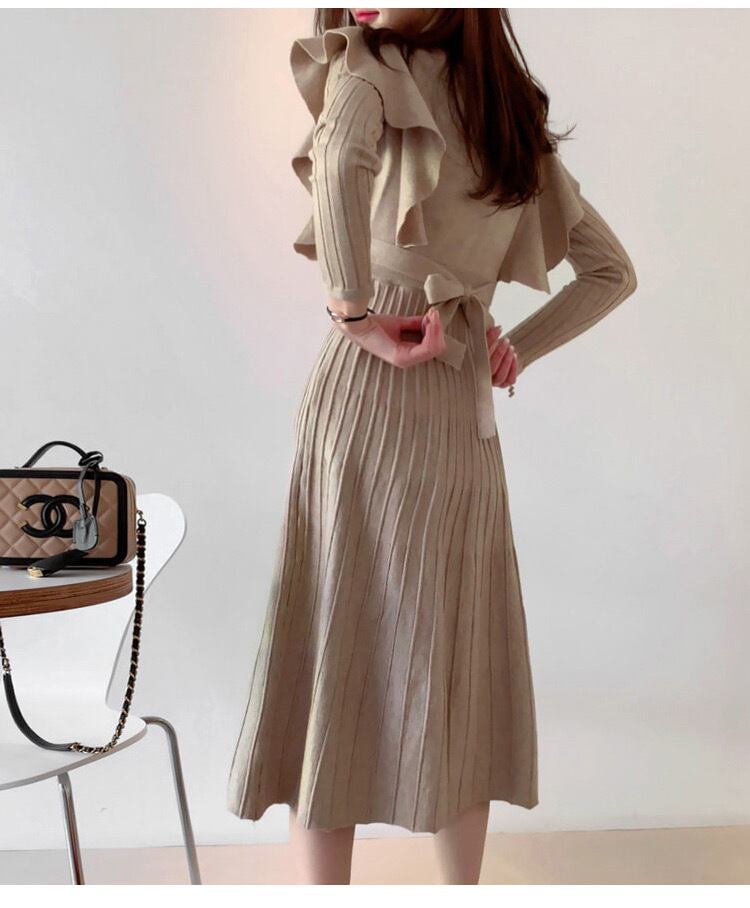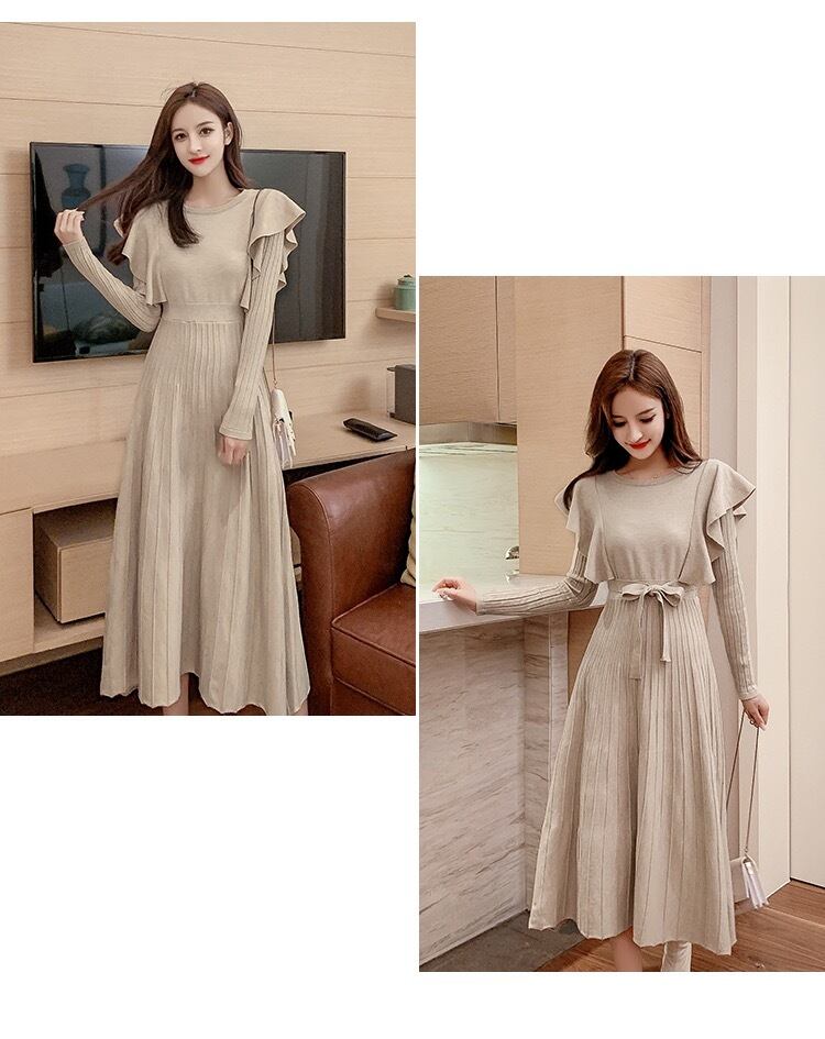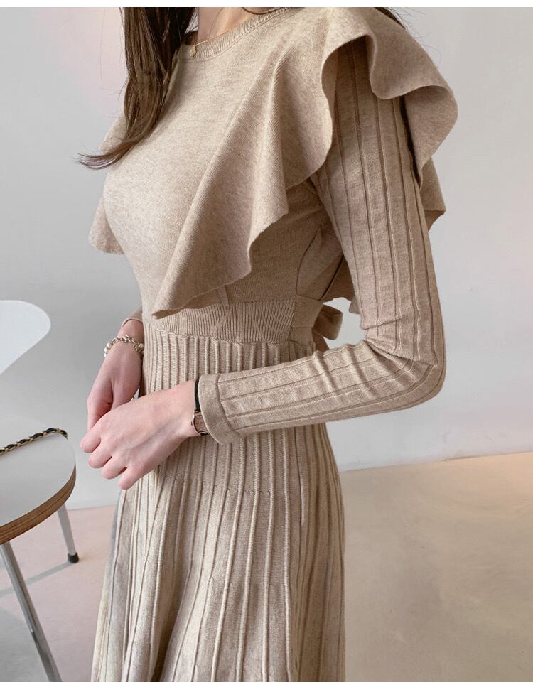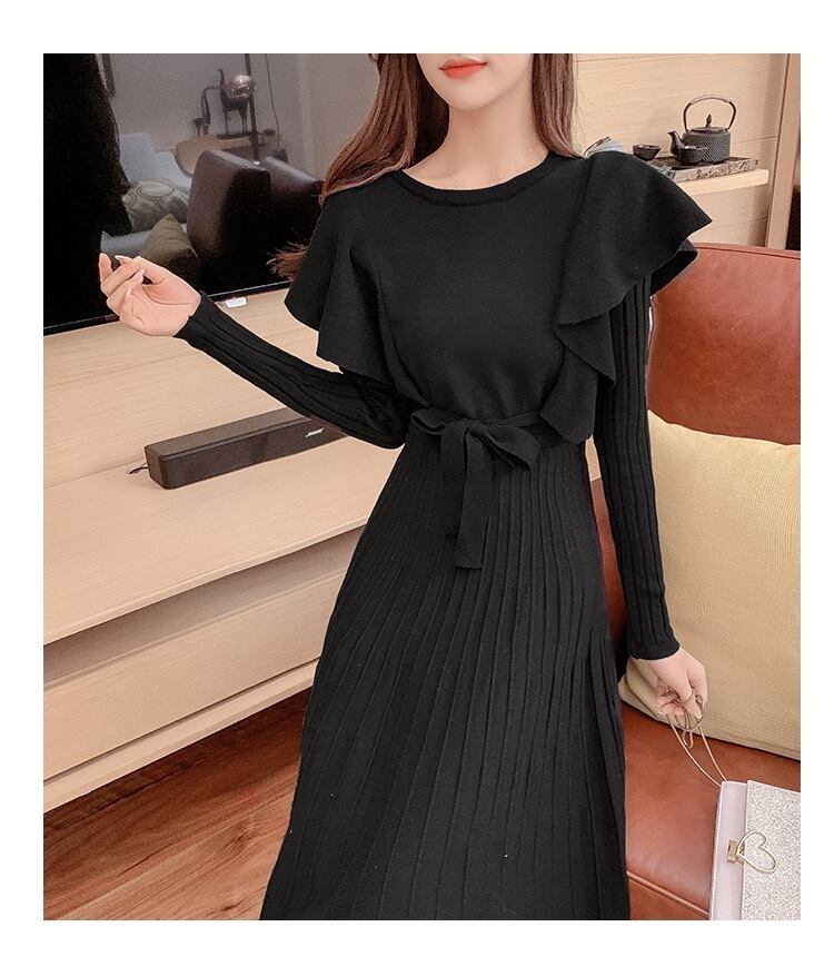 【dress】韓国系2wayリボンベルトフリルニットワンピース2色 TK1994