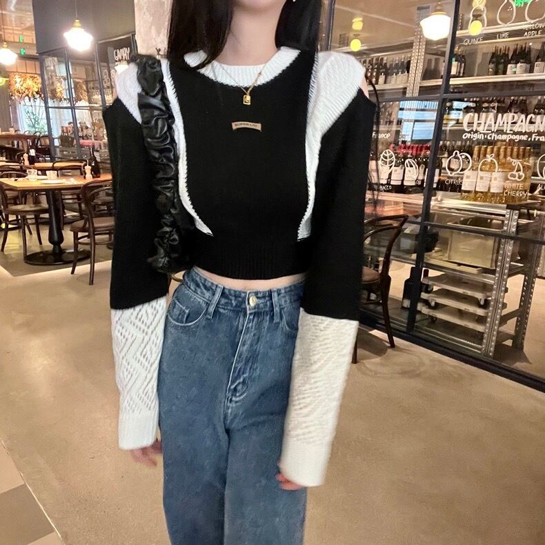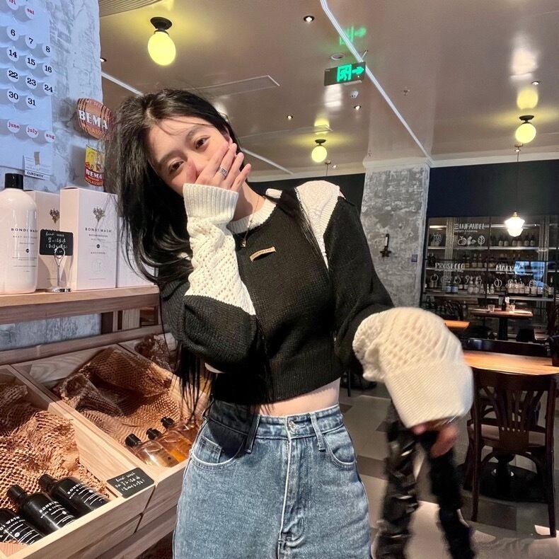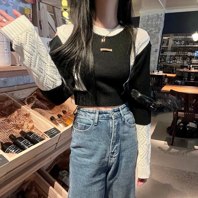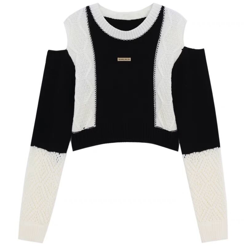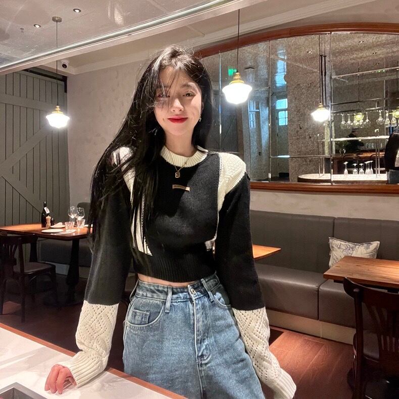 【tops】ラウンドネック配色ニットセーター BN0323