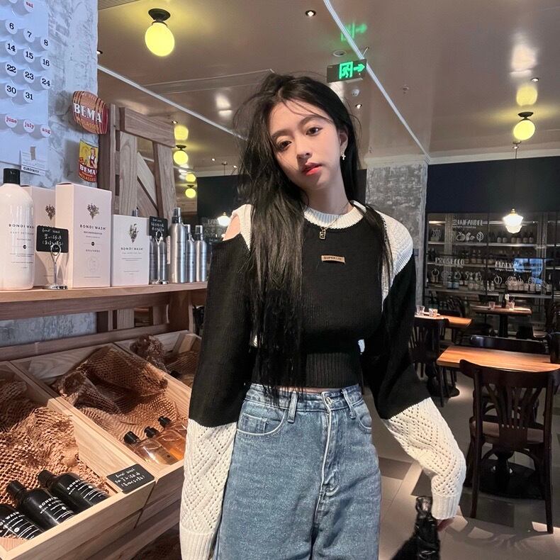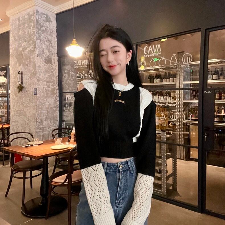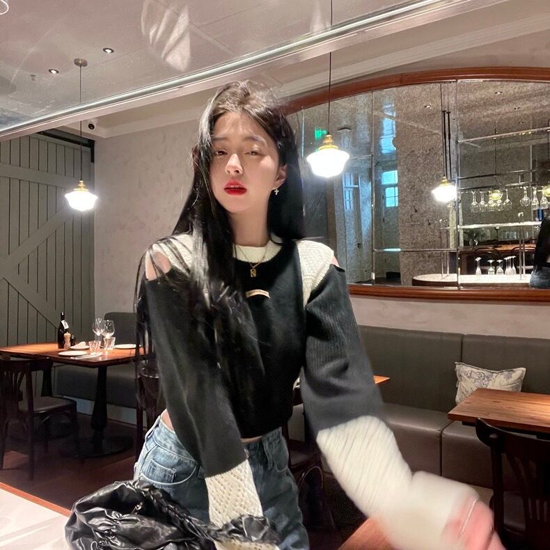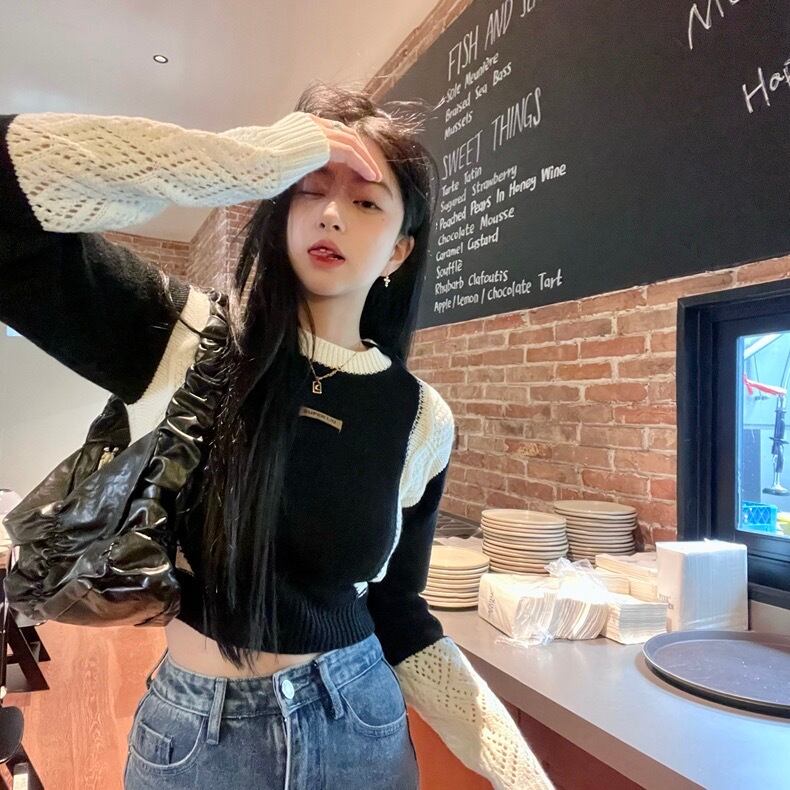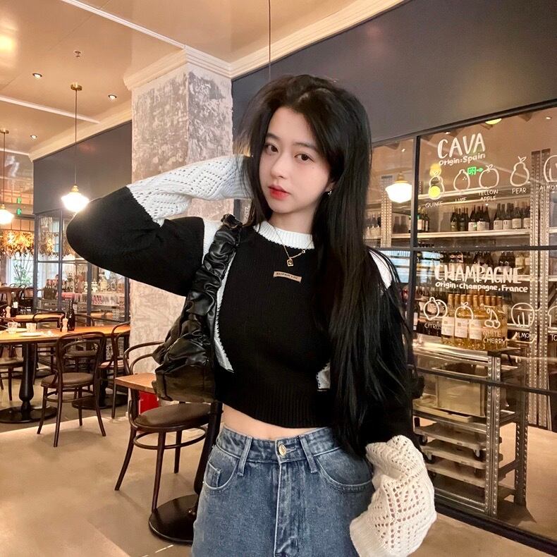 【tops】ラウンドネック配色ニットセーター BN0323