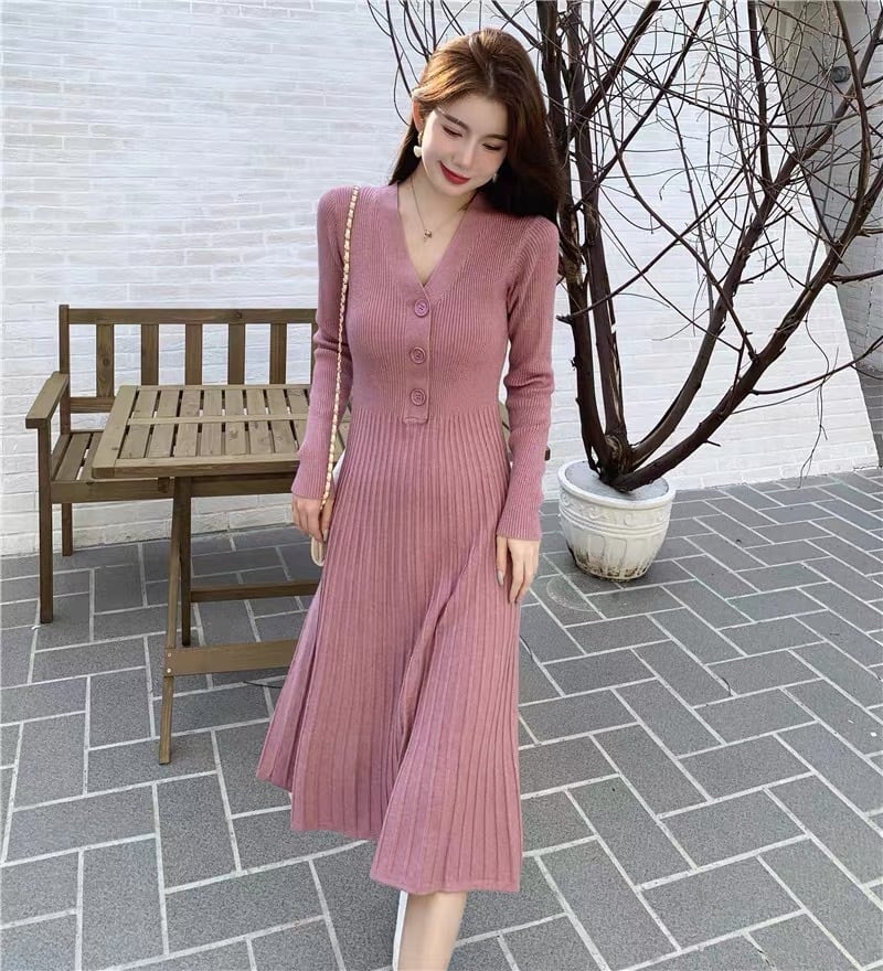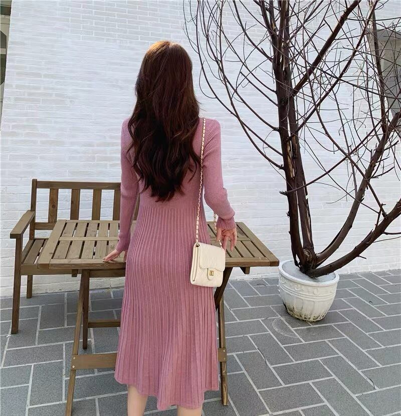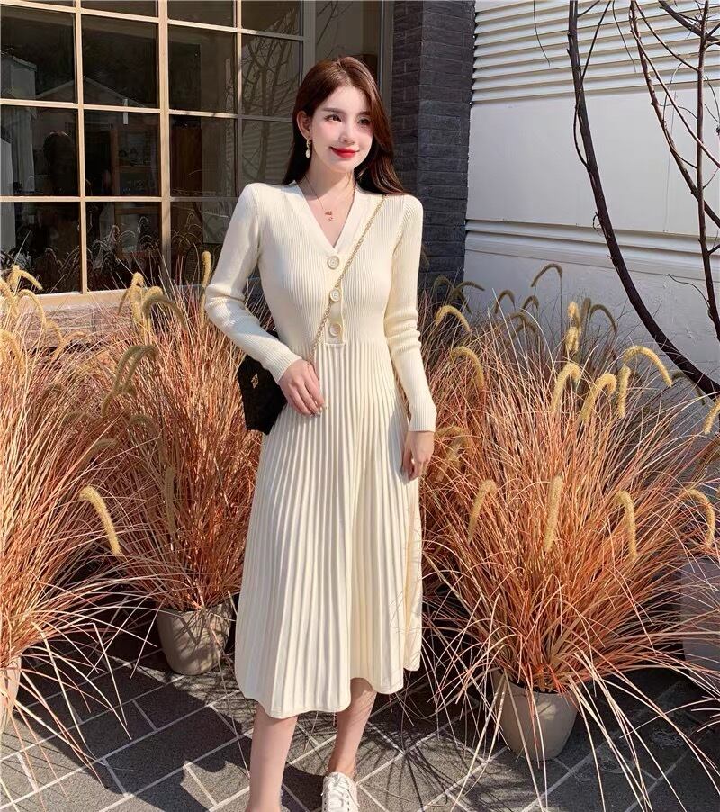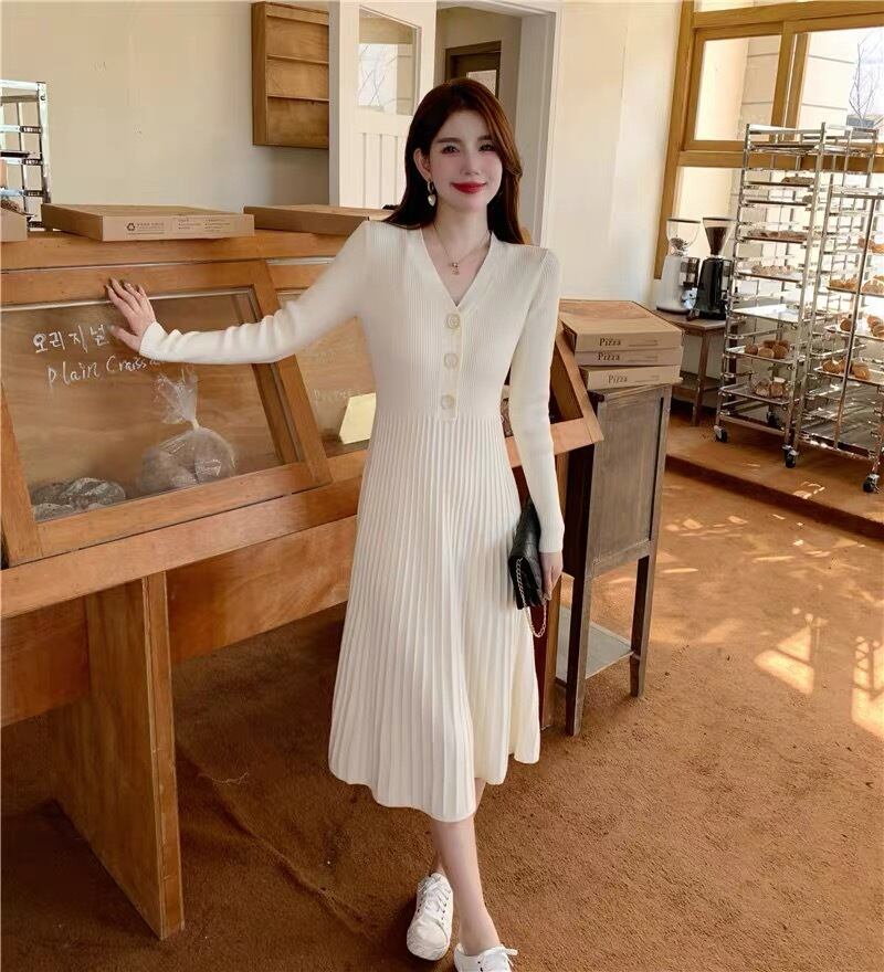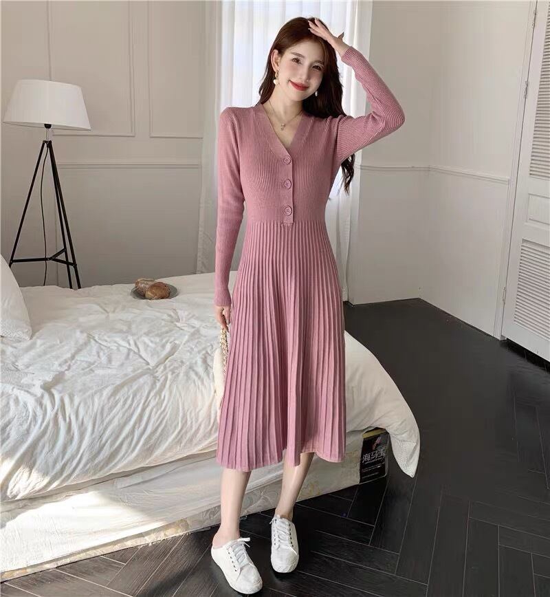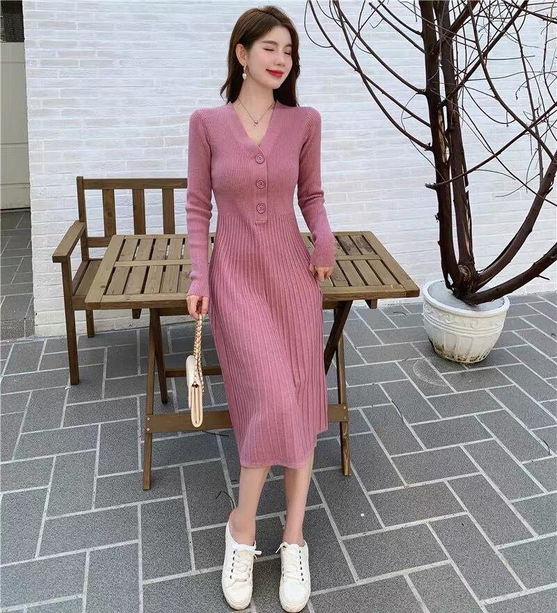 【dress】Vネック着痩せニット長袖ワンピース4色 JN014