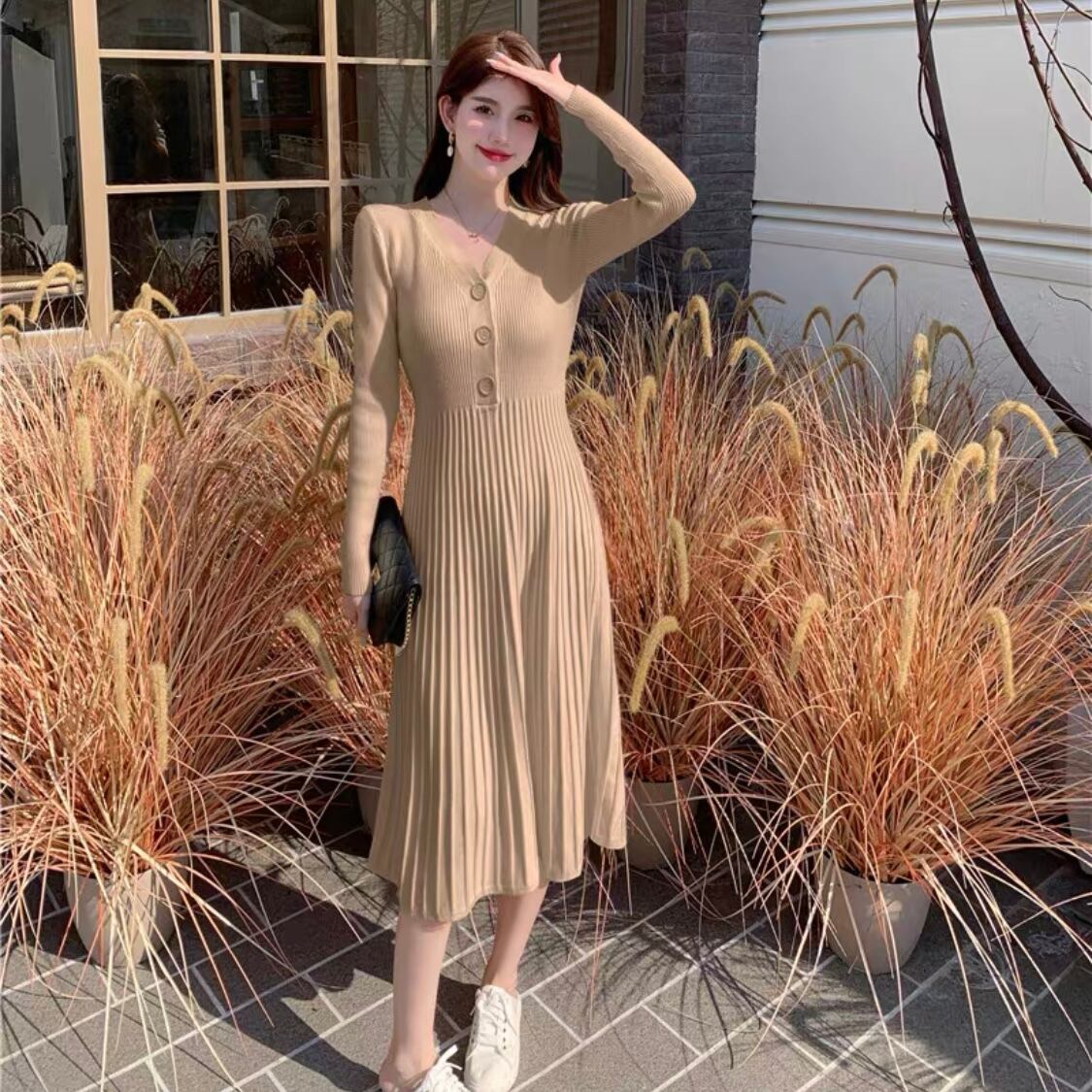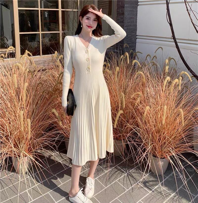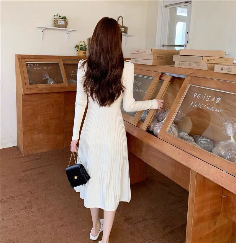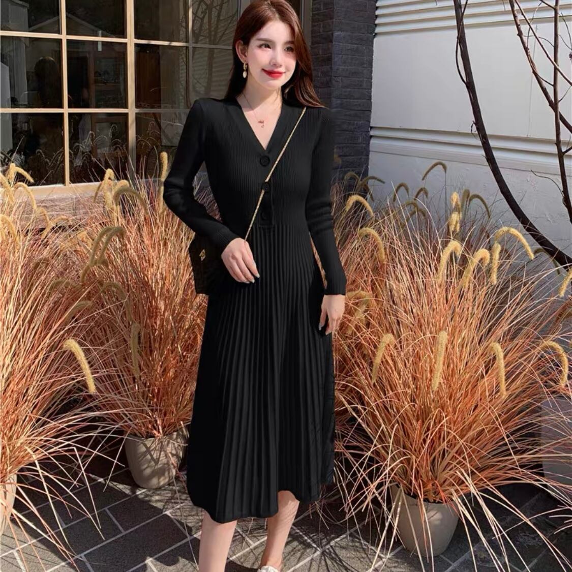 【dress】Vネック着痩せニット長袖ワンピース4色 JN014