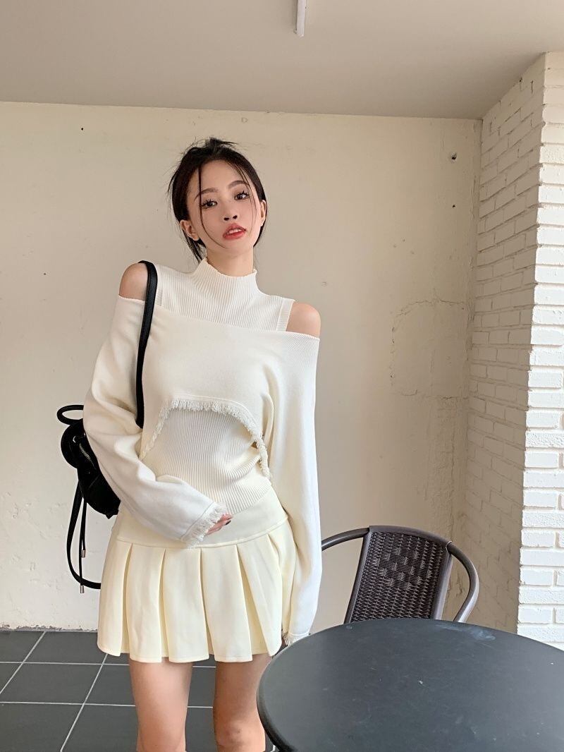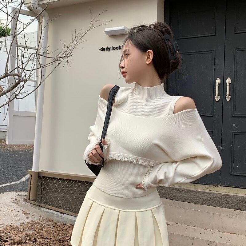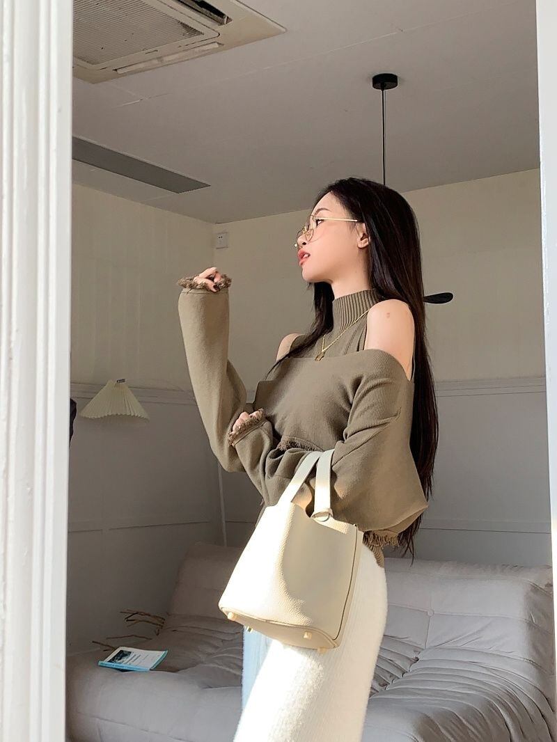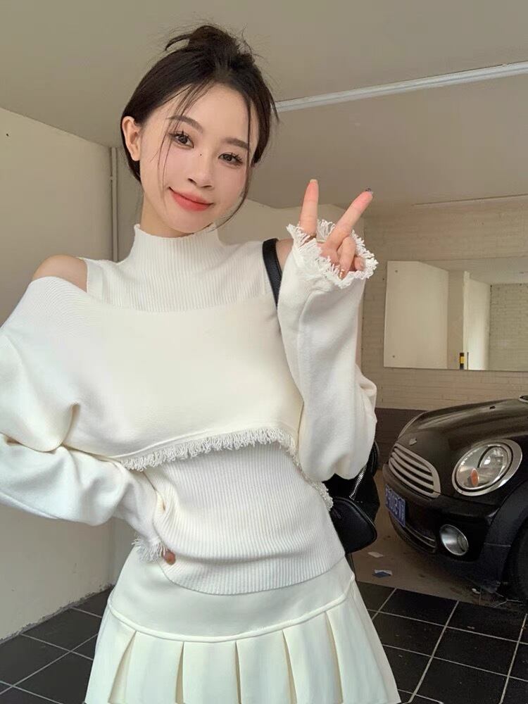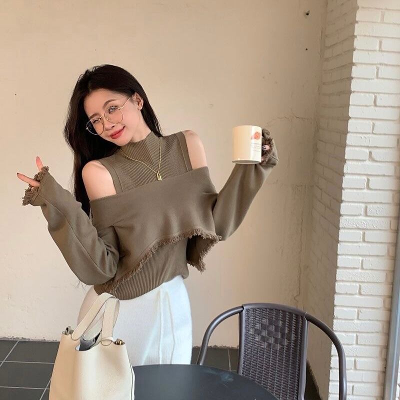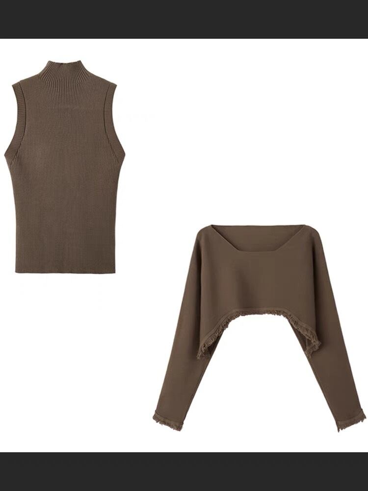 【set】ハイネックノースリーブタンクトップx2way長袖ニットトップス CR777