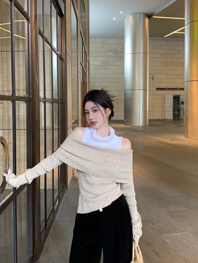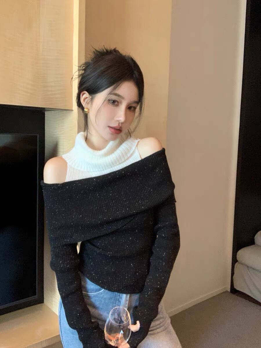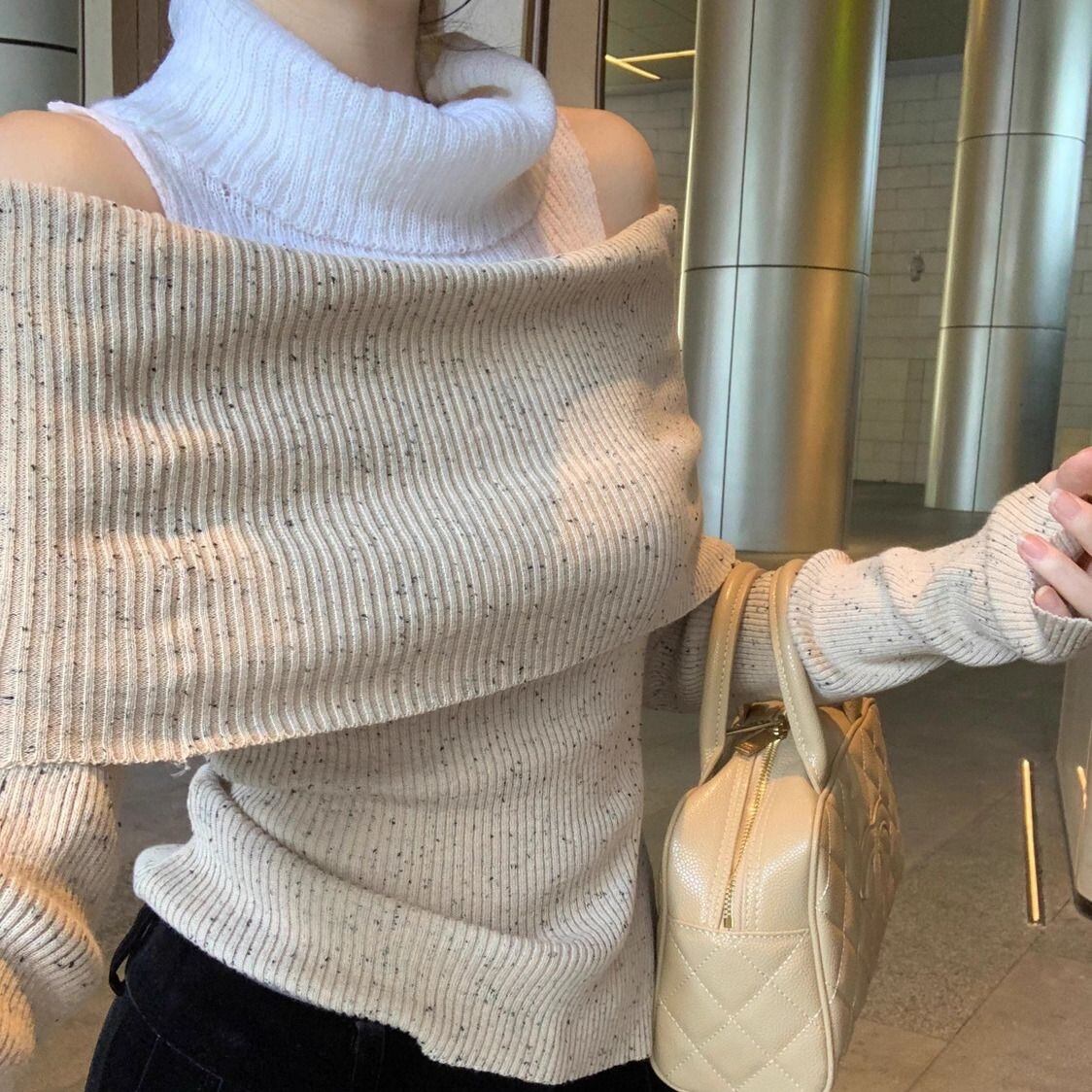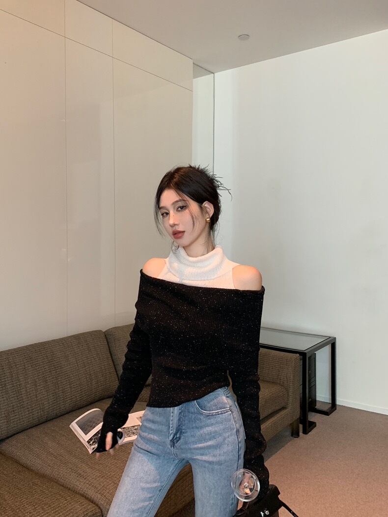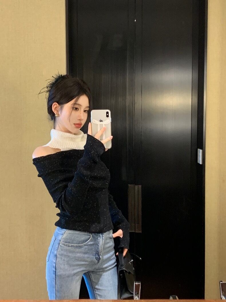 【tops】肩見せ配色ハイネックニットトップス2色 SY0112