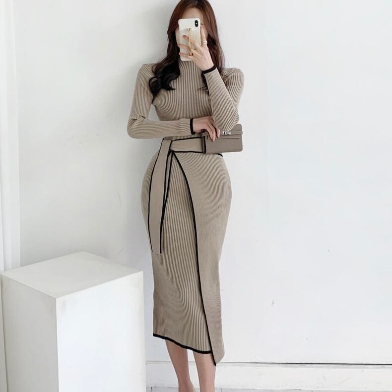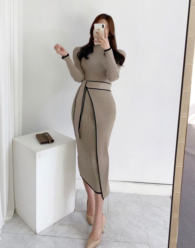 【dress】リボンベルト配色長袖ニットワンピース2色 IB7009