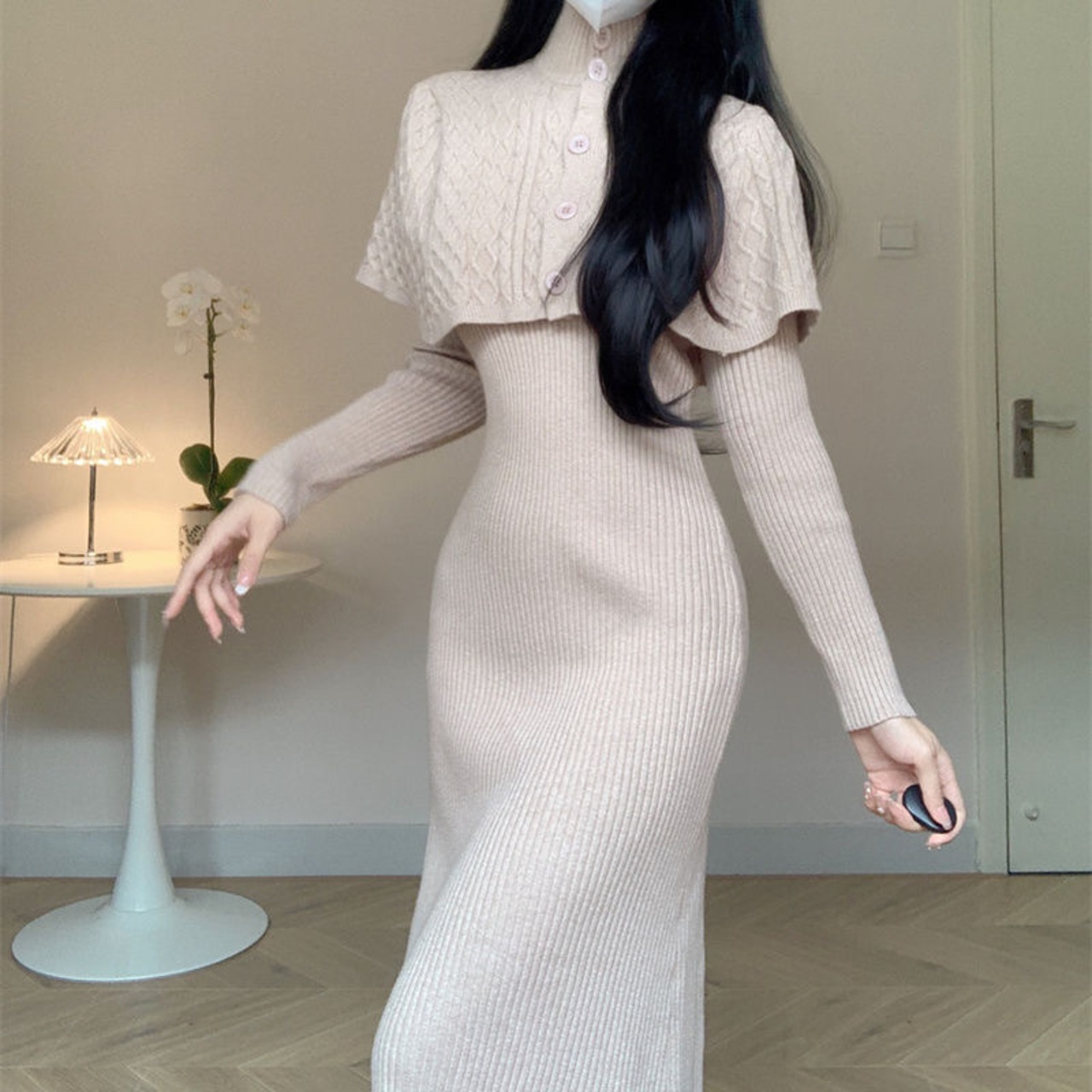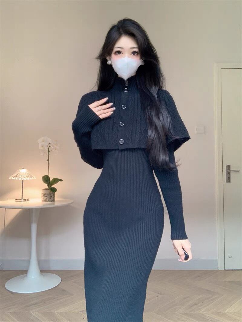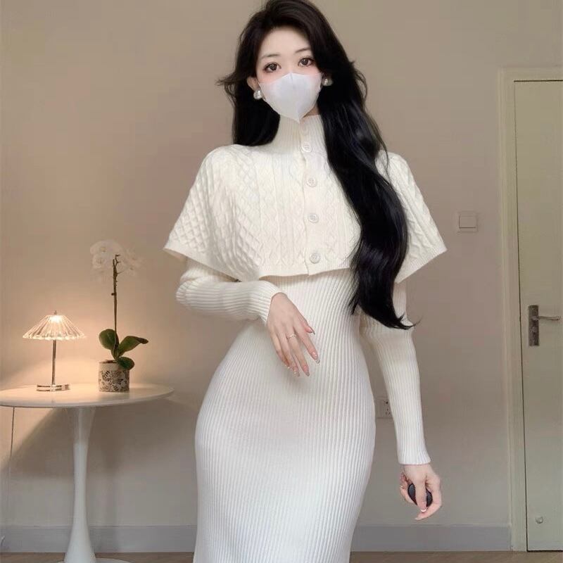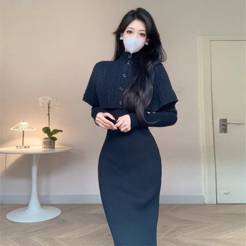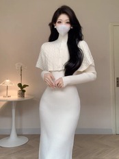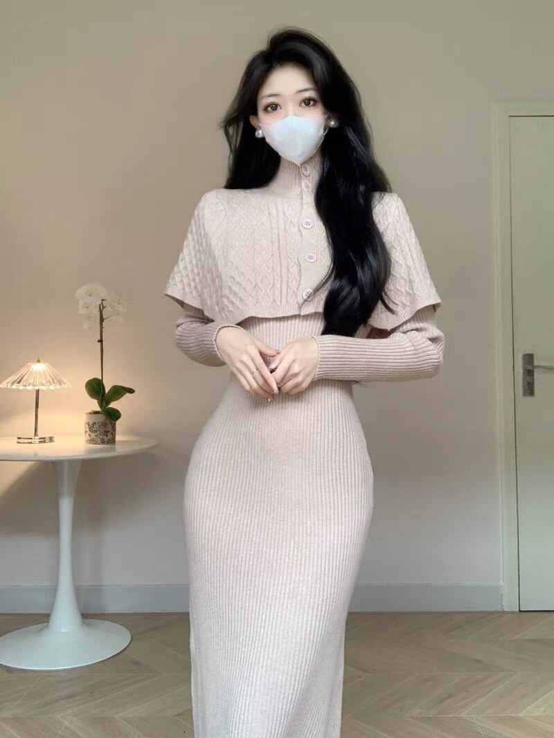 【set】ケープトップスx長袖ニットワンピース3色 SY6600