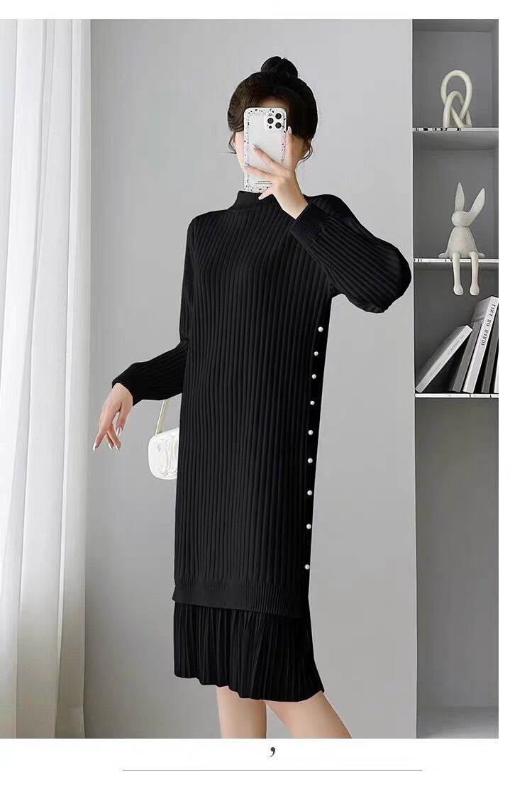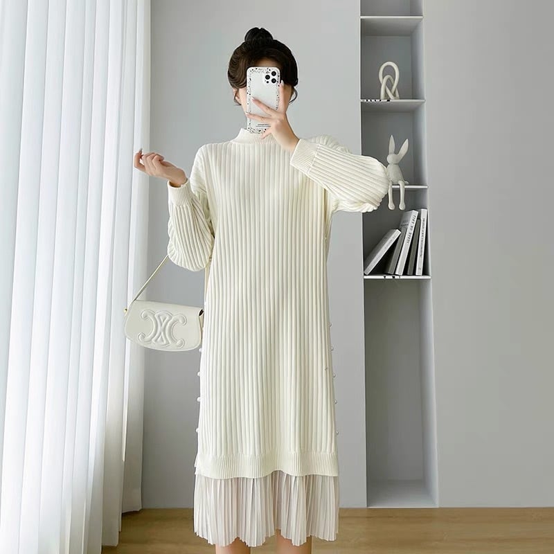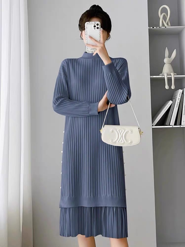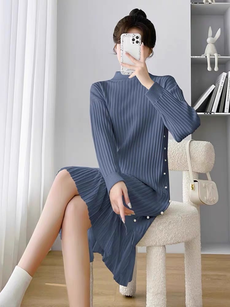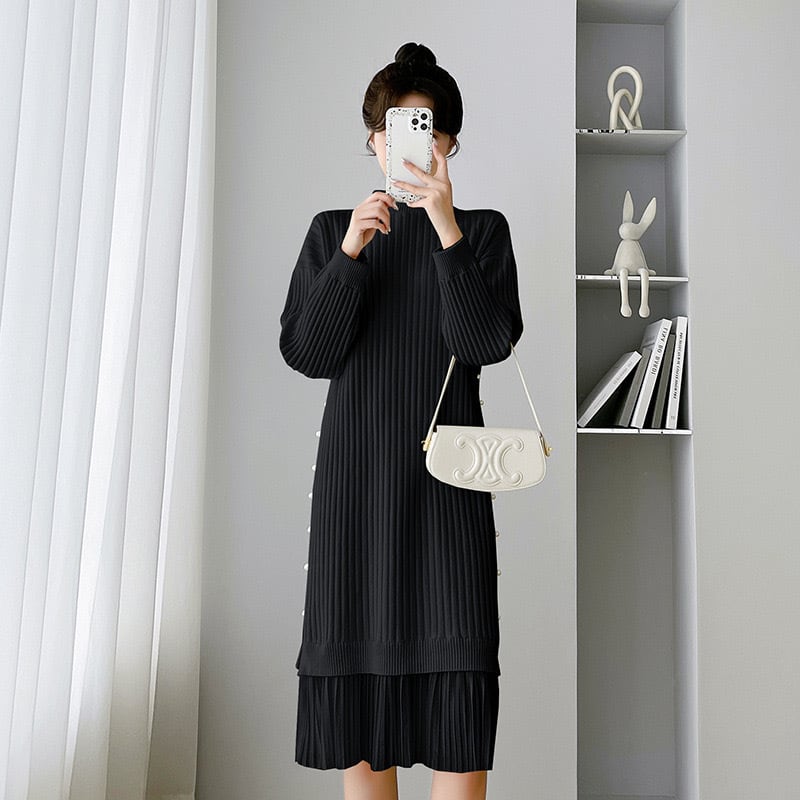 【dress】サイドパールデザイン切り替え長袖ニットワンピース3色 SY6023