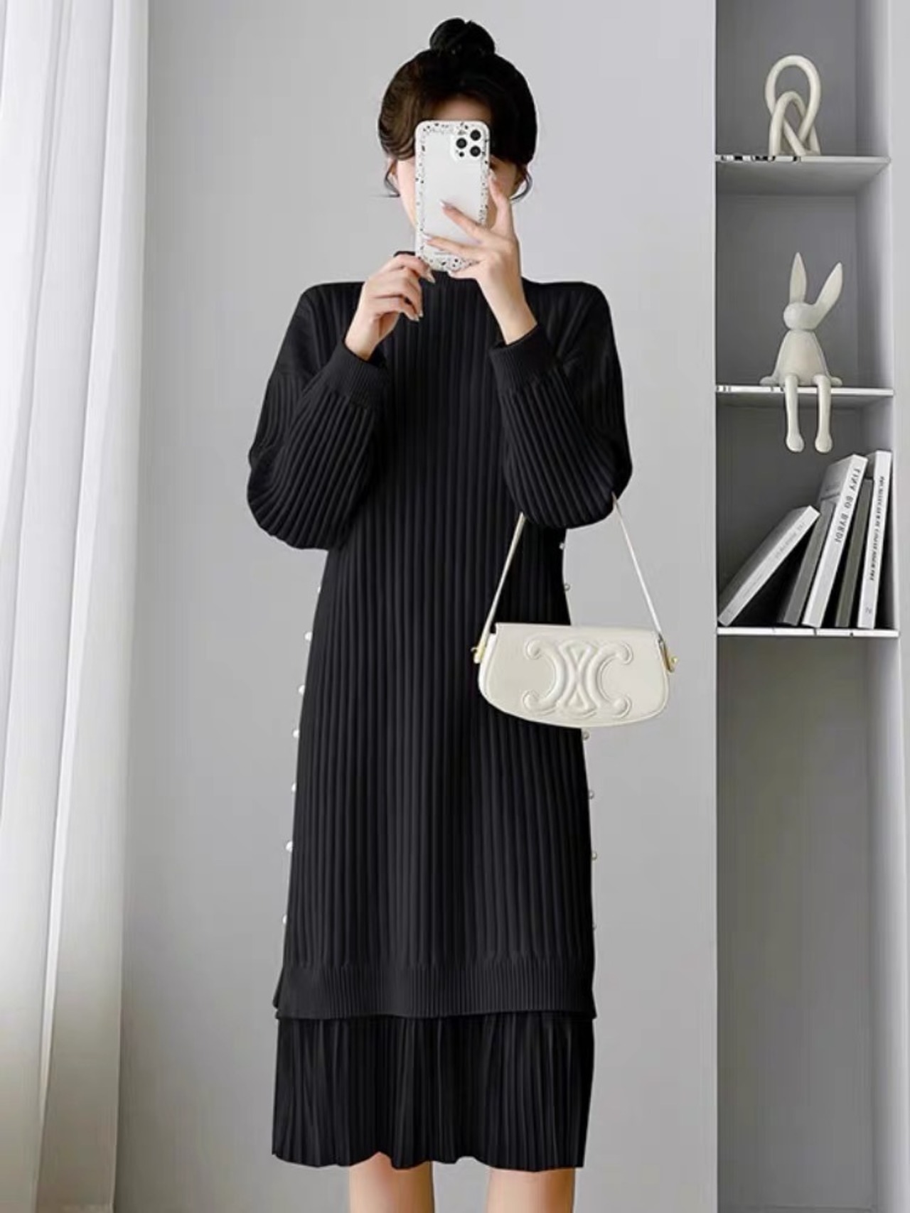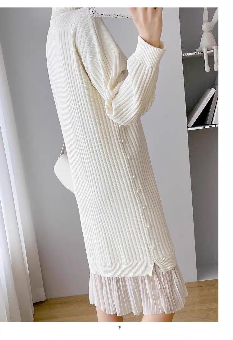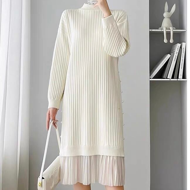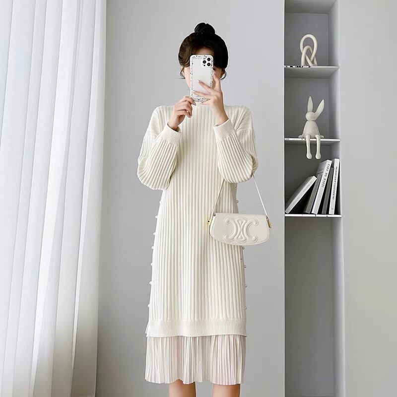 【dress】サイドパールデザイン切り替え長袖ニットワンピース3色 SY6023