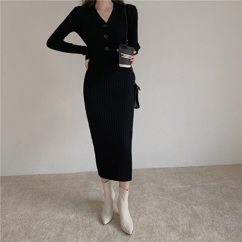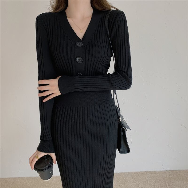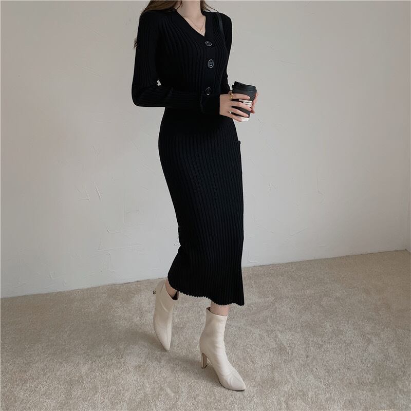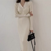 【dress】ボタンデザインVネック長袖ニットワンピース2色 CF0003