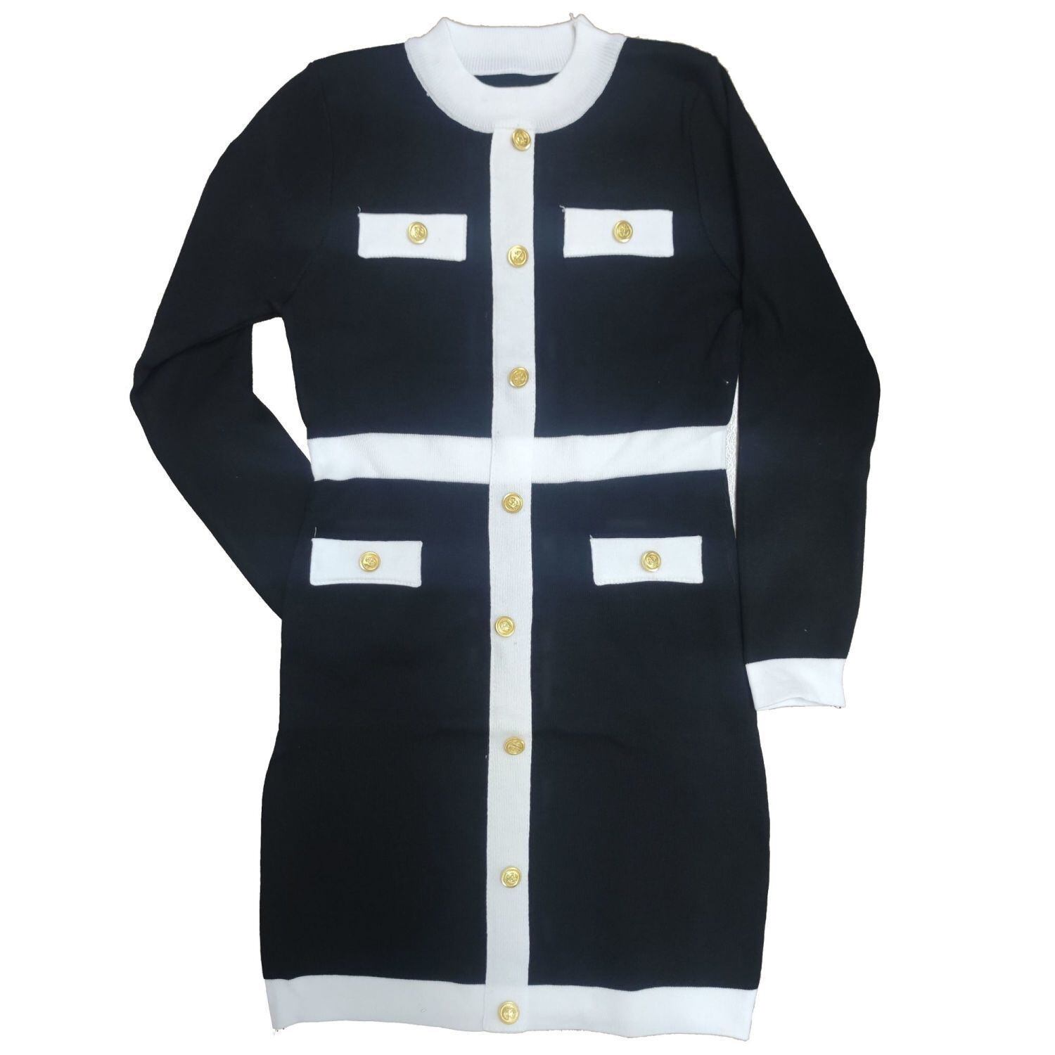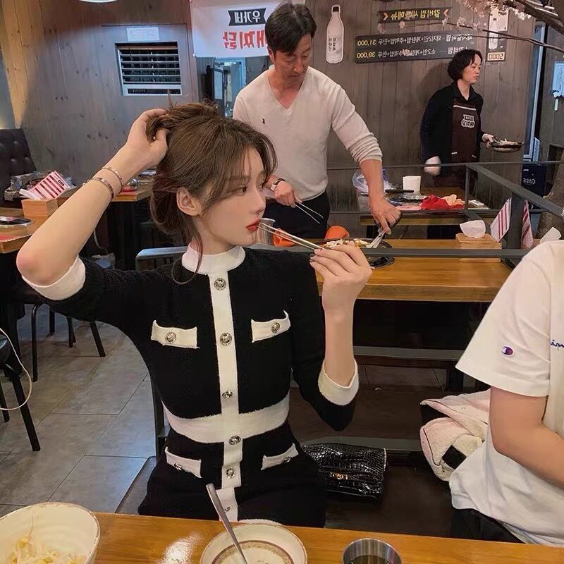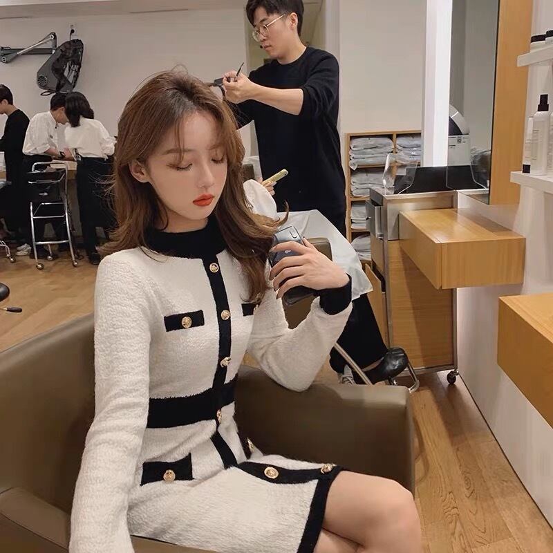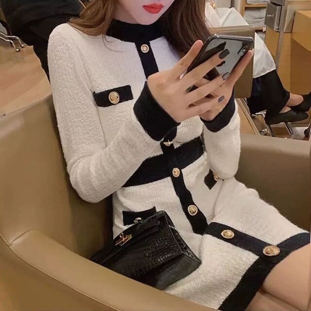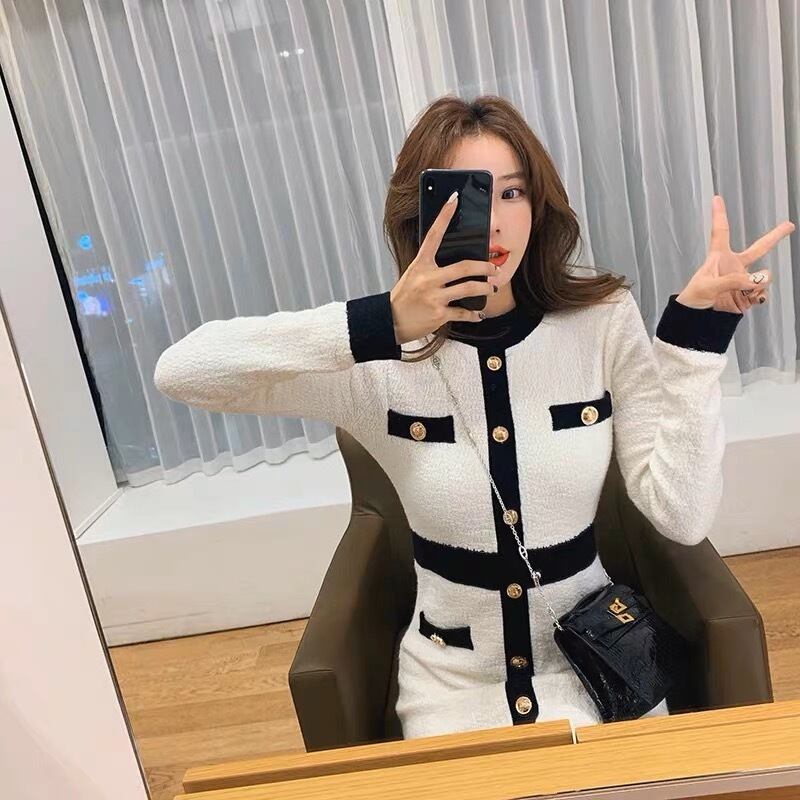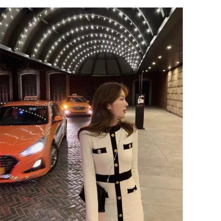 【dress】配色ボタンデザイン長袖ニットワンピース2色 SY6457