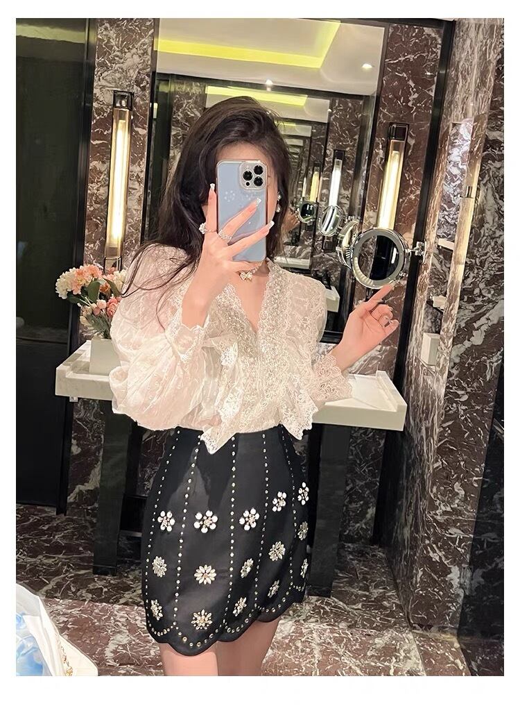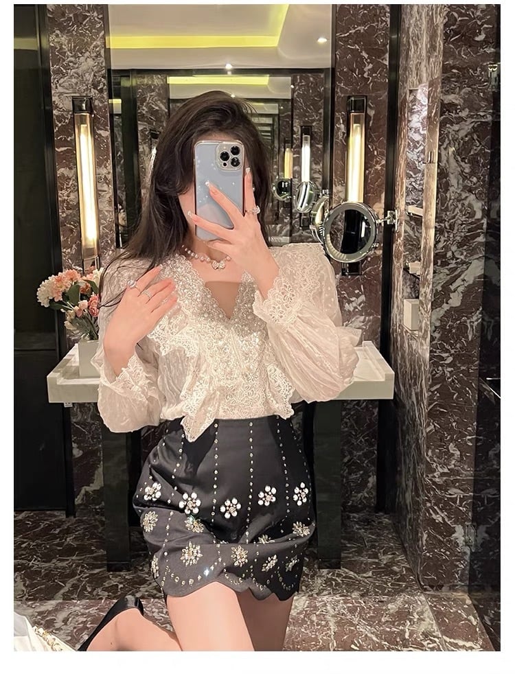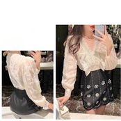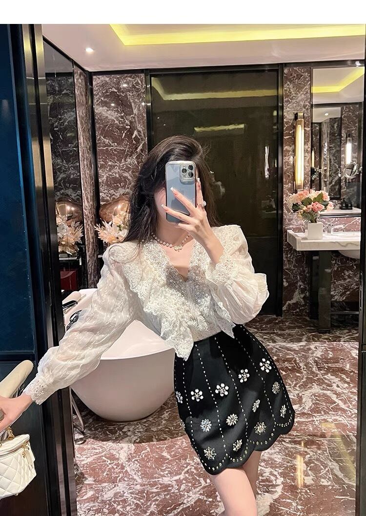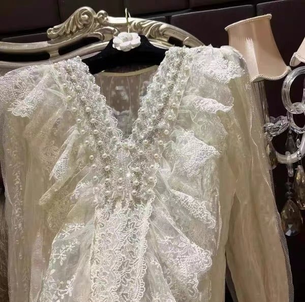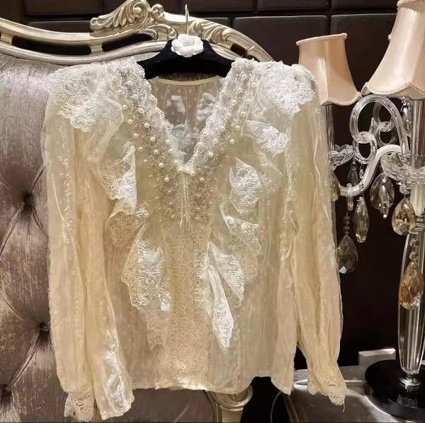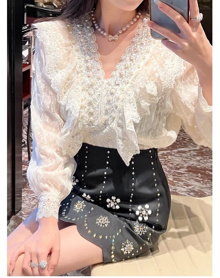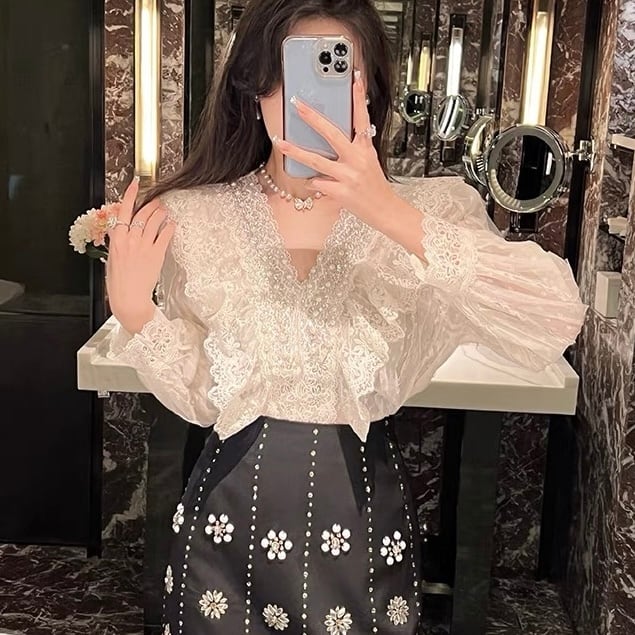 【tops】エレガントパールデザインフリルレース長袖トップス2色 KI9900