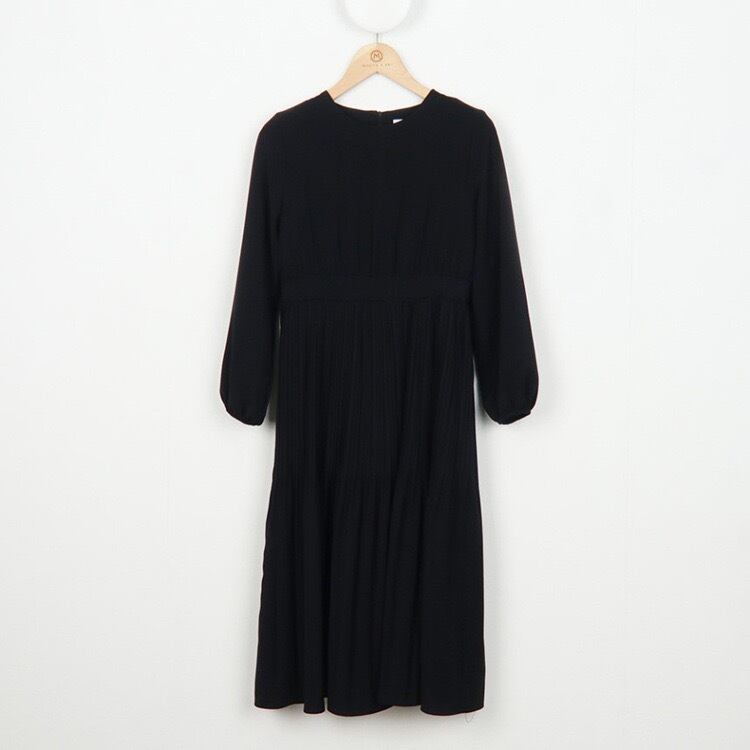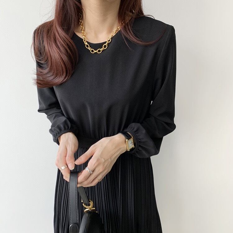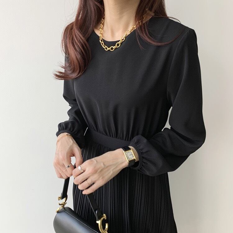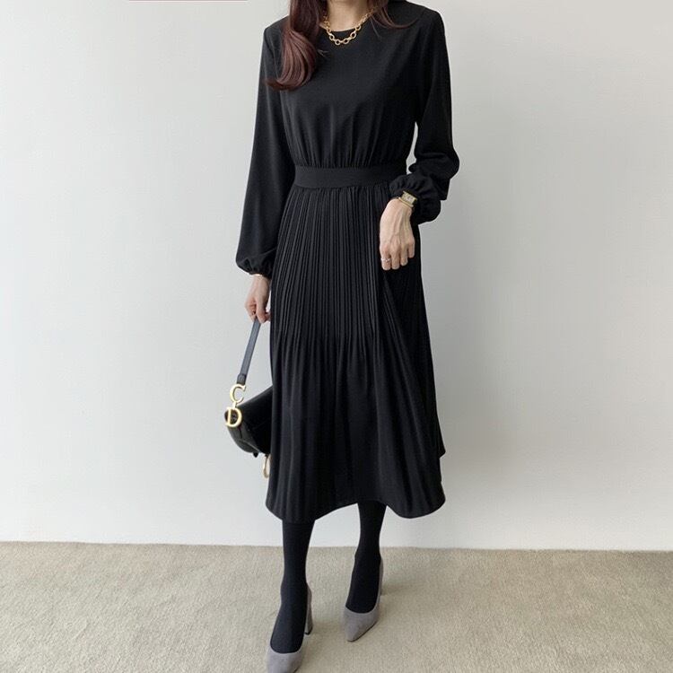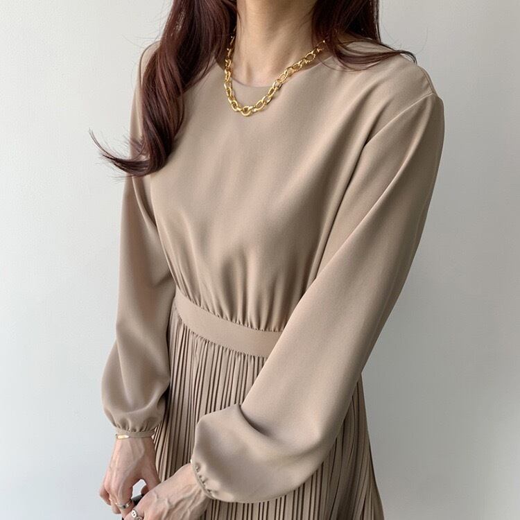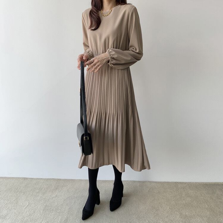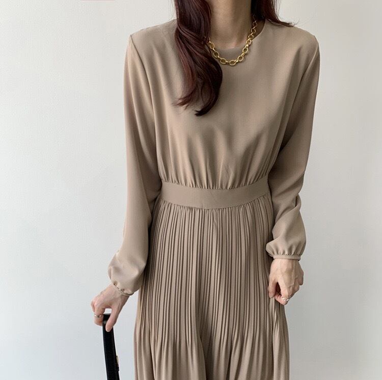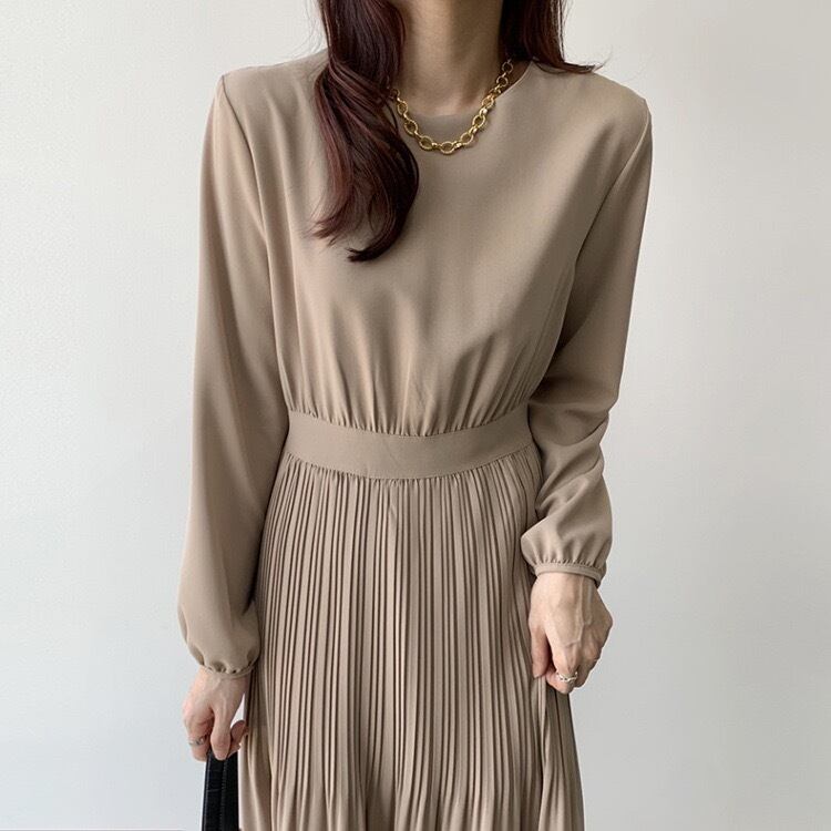 【dress】ラウンドネックプリーツ長袖ワンピース4色 KZ0002