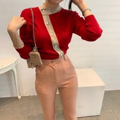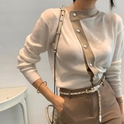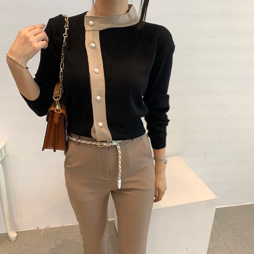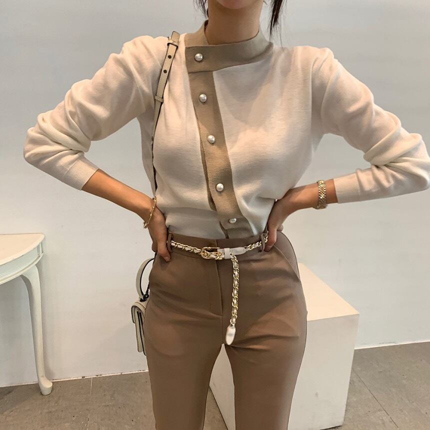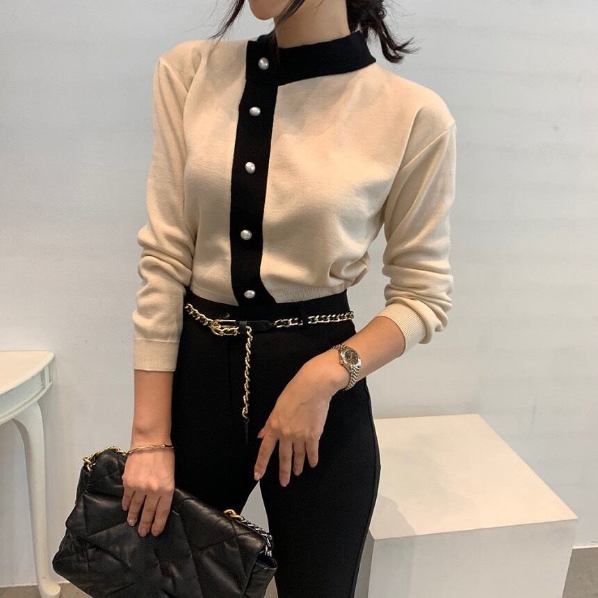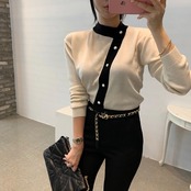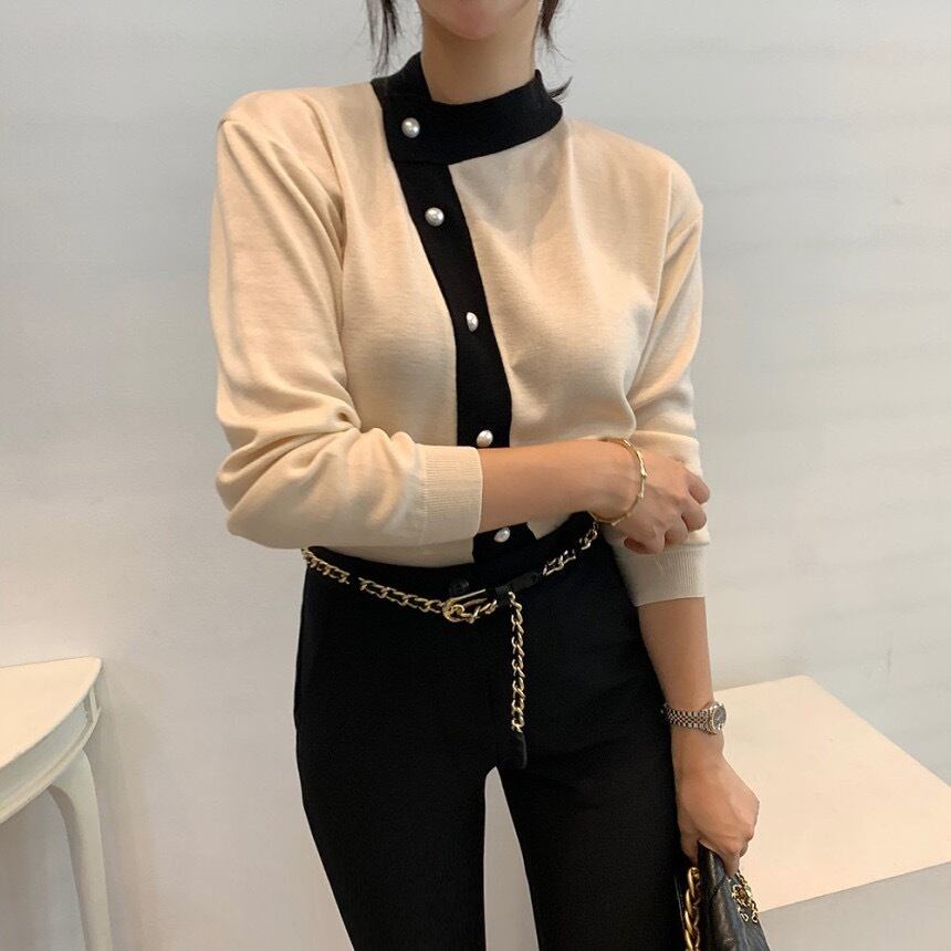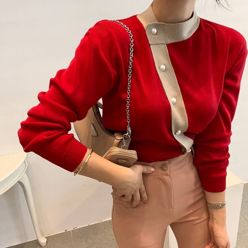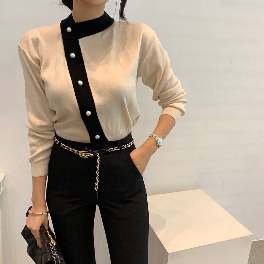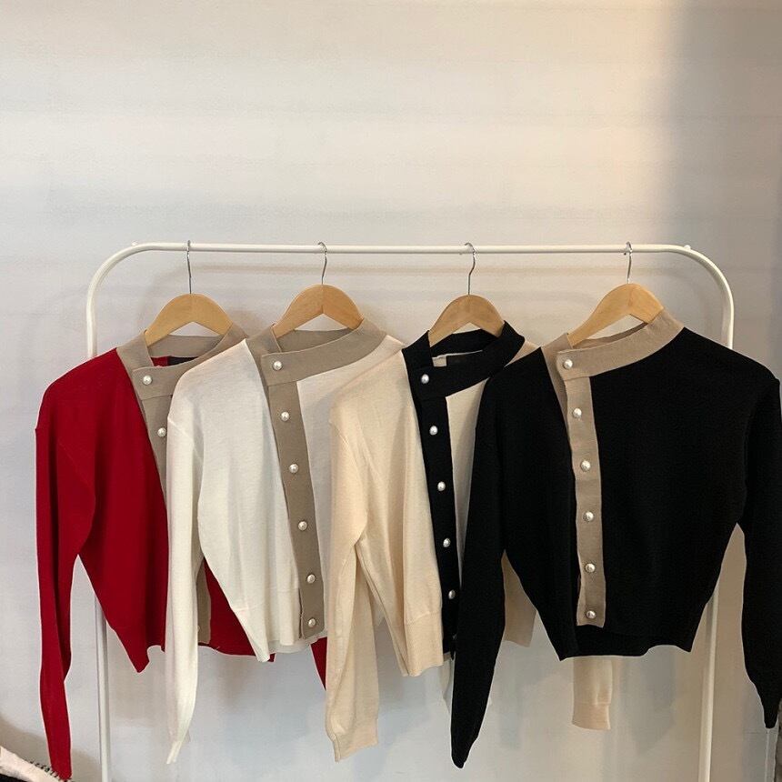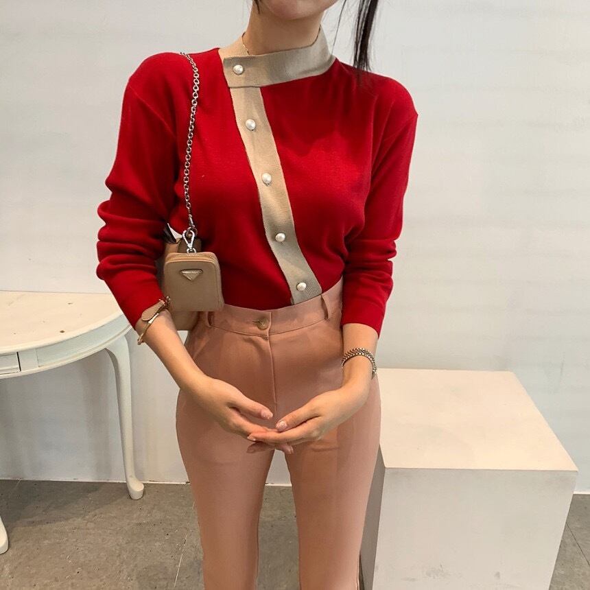 【tops】パールデザイン配色長袖ニットトップス4色 SY2290