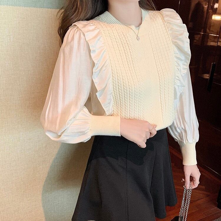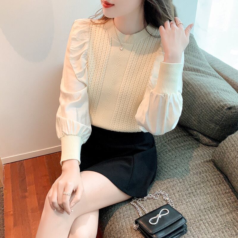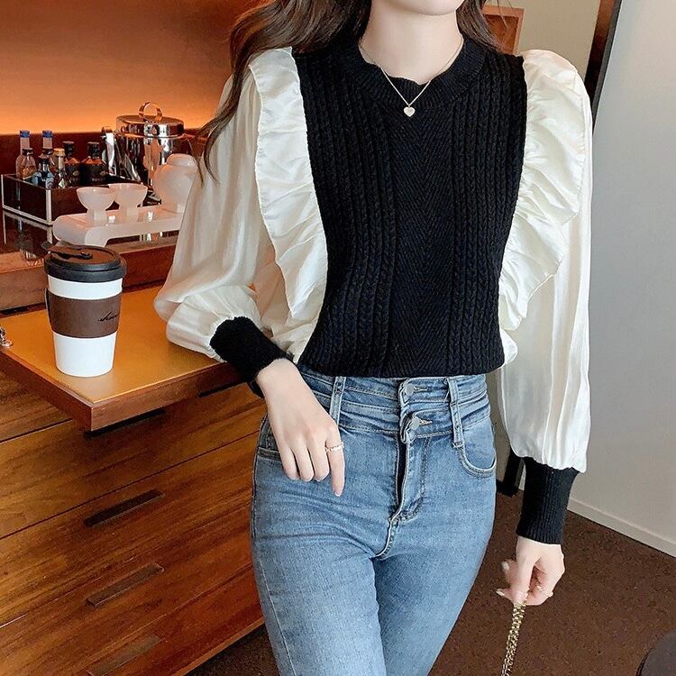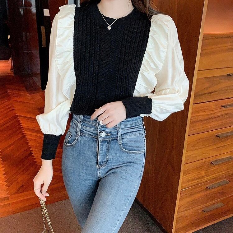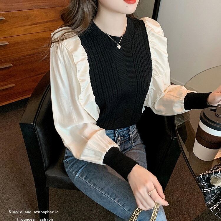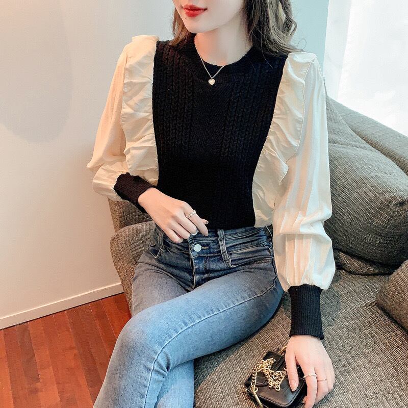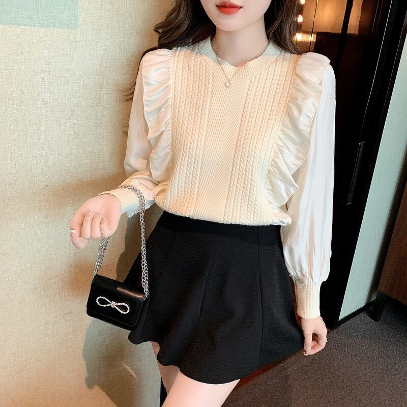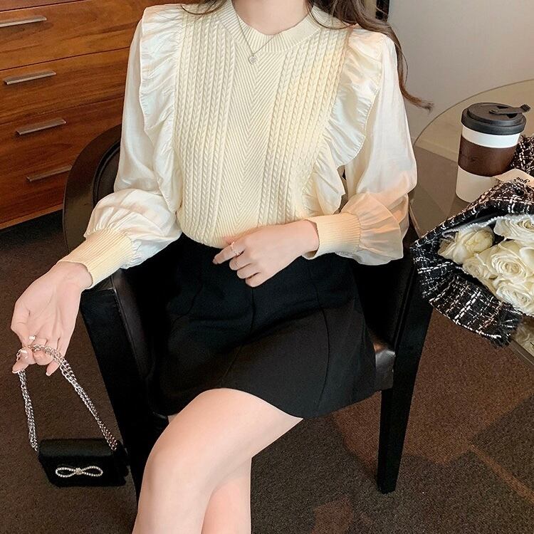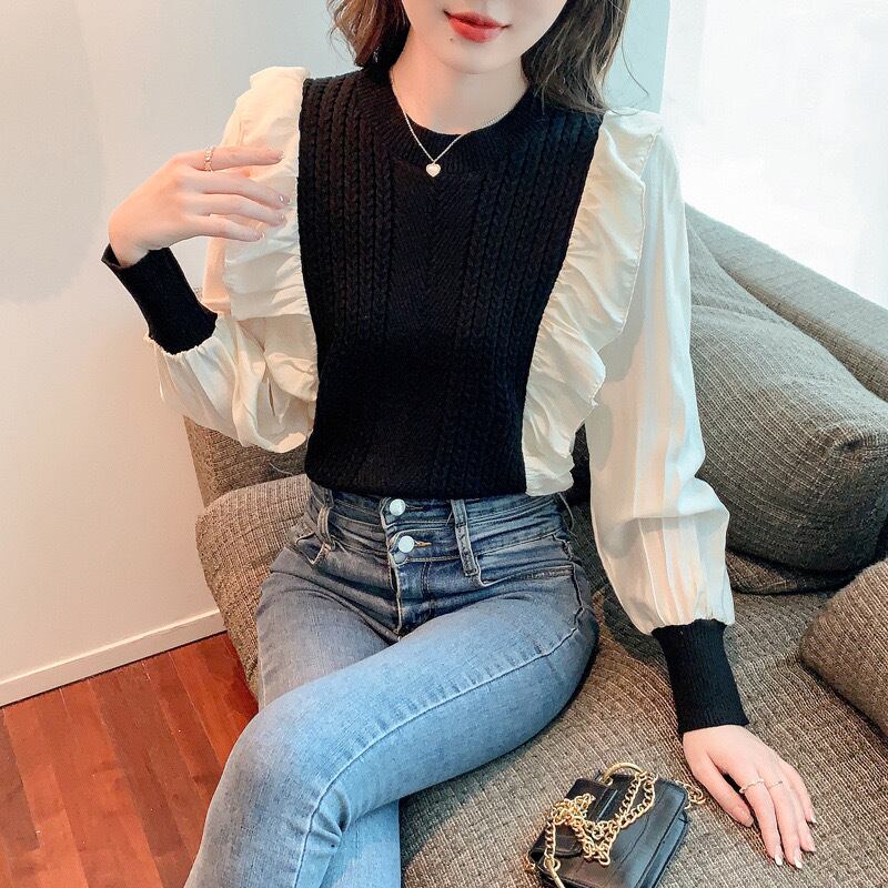 【tops】ラウンドネックフリル切り替えニットトップス2色 SP1259