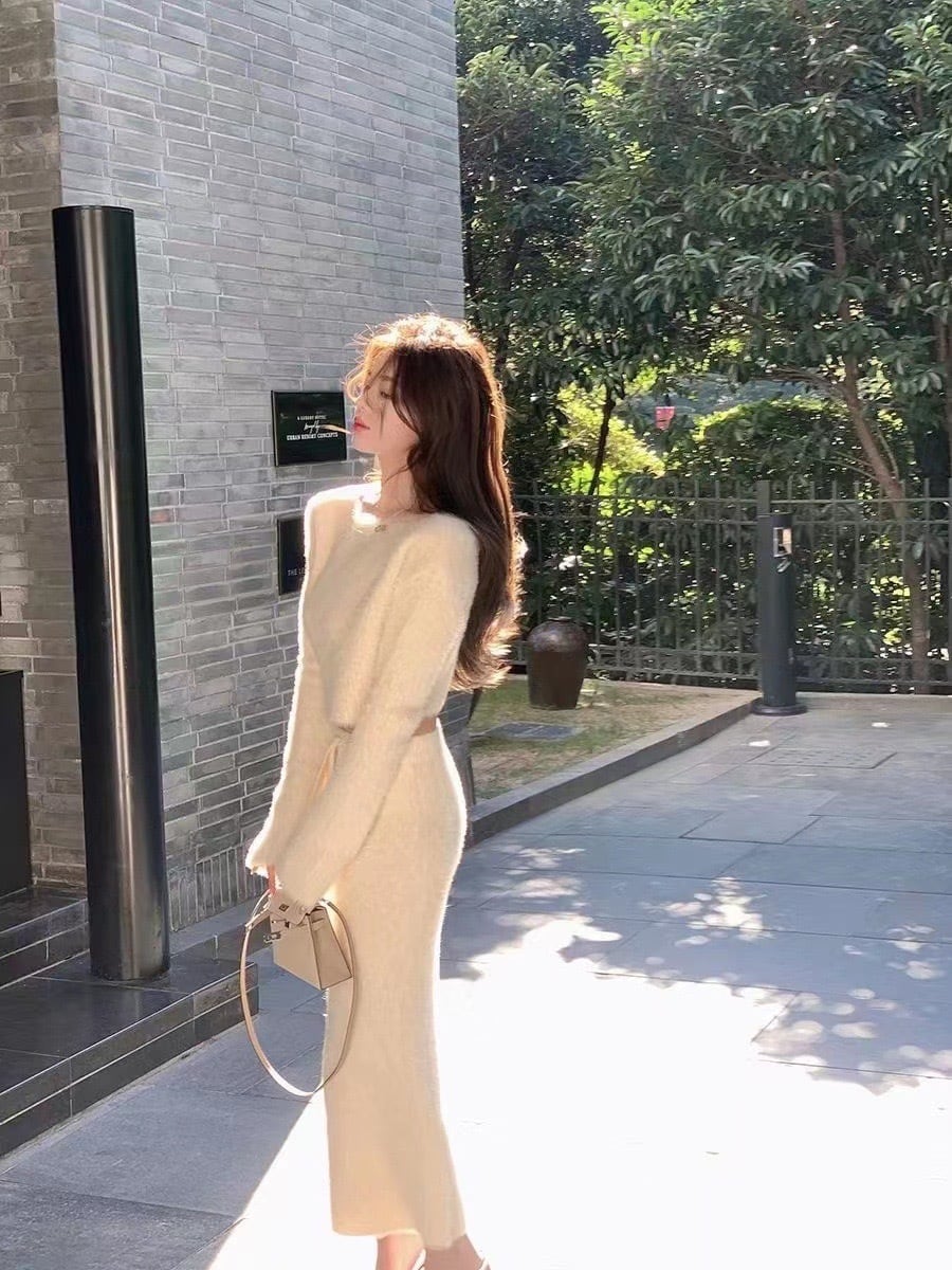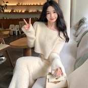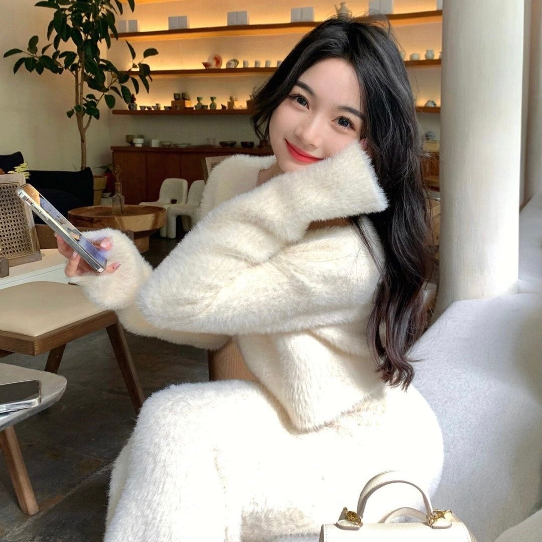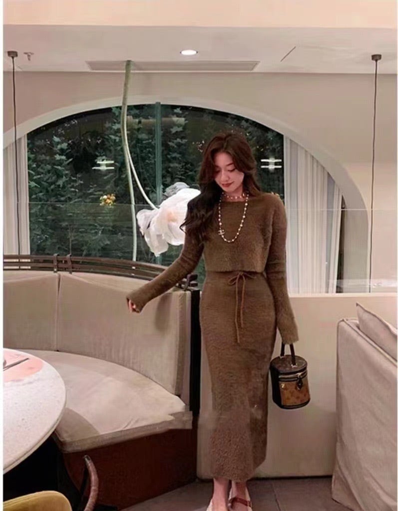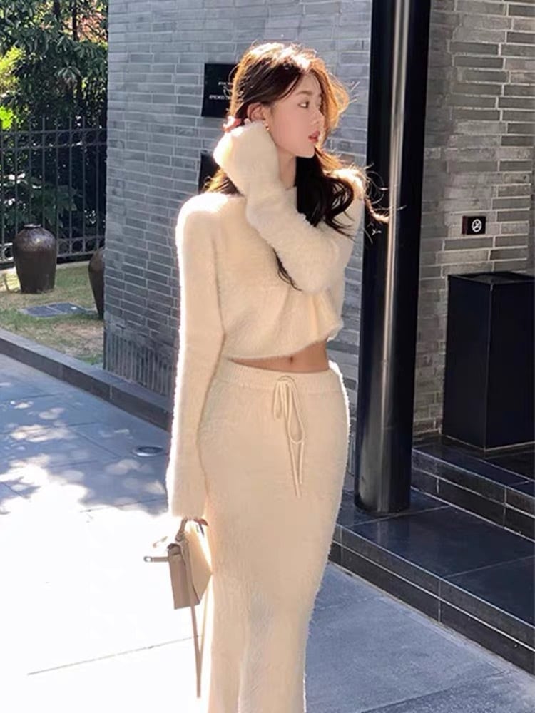 【set】シャギーニットトップスxハイウエストスカート4色 SY0150