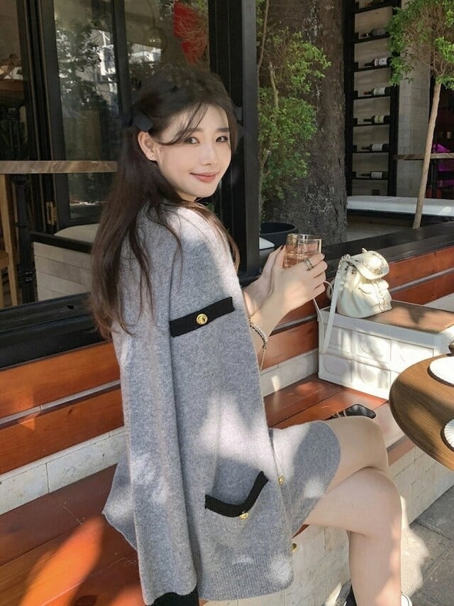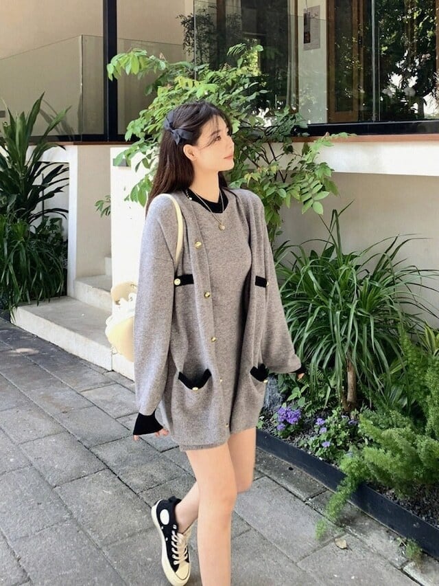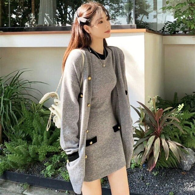 【set】配色ラウンドネックミニワンピースxカーディガン GT1724