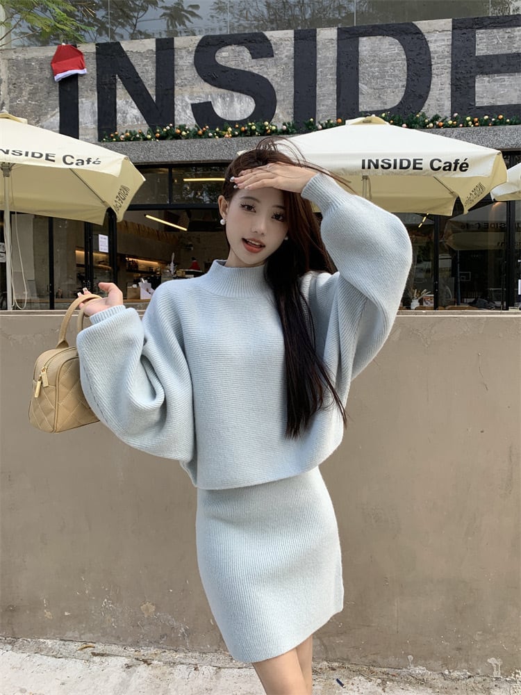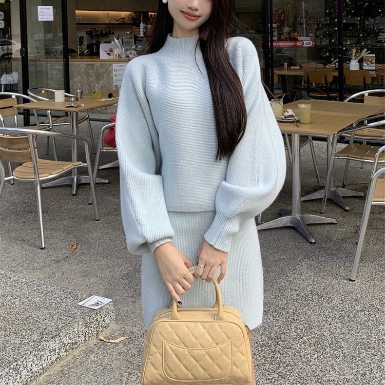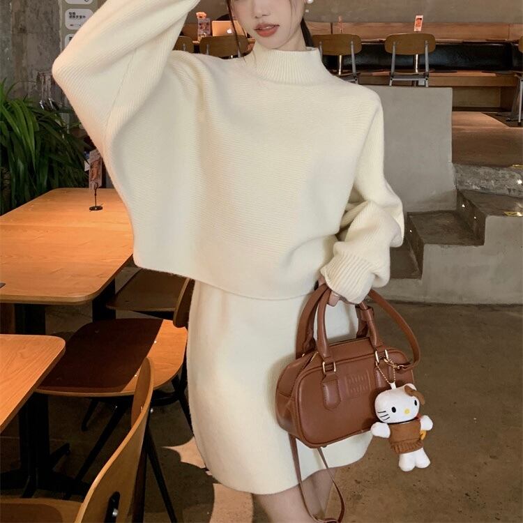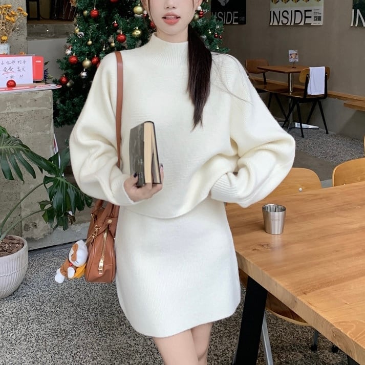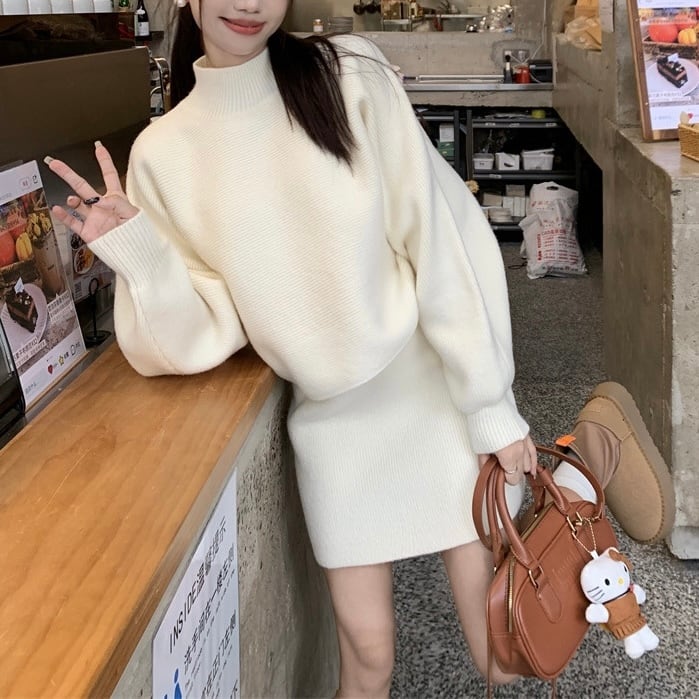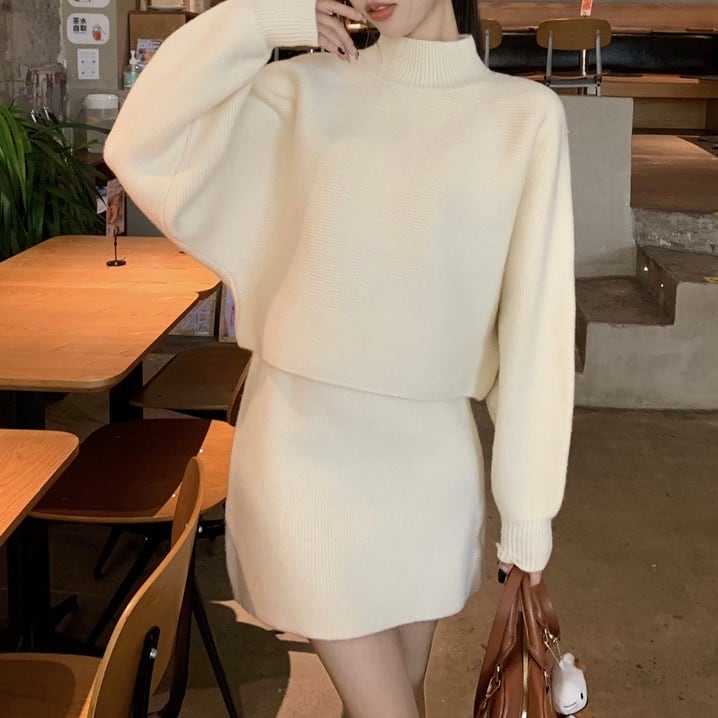 【set】ハーフネックニットトップスxハイウエストスカート2色 KY1703